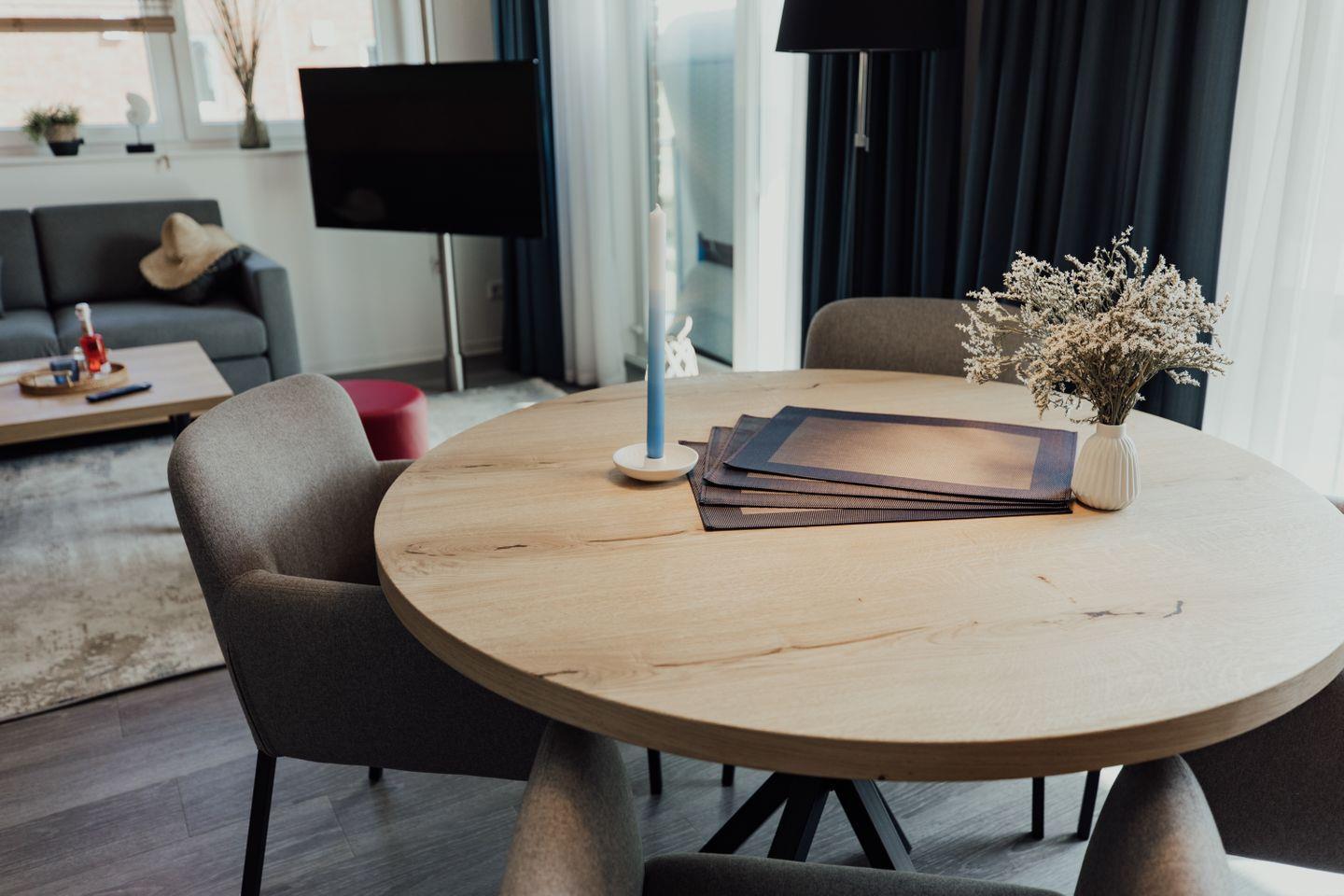 Im großzügigen Wohn- und Essbereich steht eine gemütliche Sitzecke mit großem Smart-TV zur Verfügung, ideal für Spiele- und Filmabende auf der Couch. Die Ferienwohnung bietet somit eine Wohlfühlatmosphäre, die für einen entspannten und komfortablen Aufenthalt sorgt.