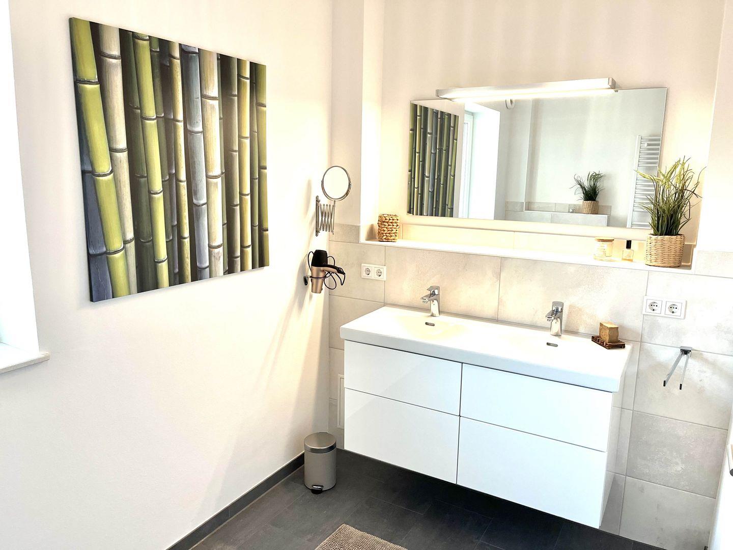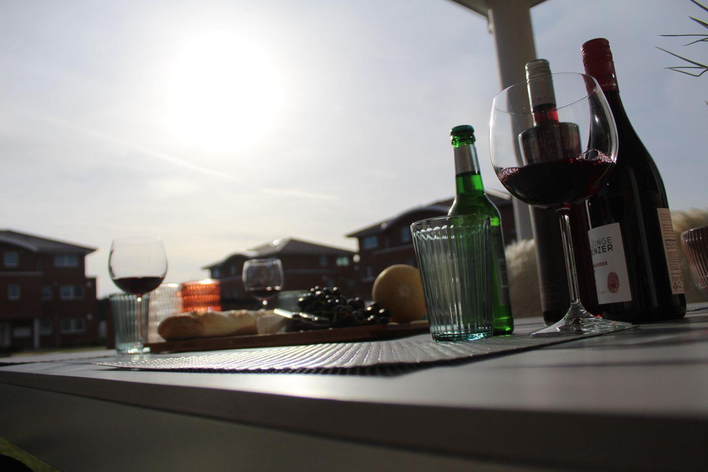 Ihre stilvolle Ferienwohnung bietet ausreichend Platz für bis zu 4 Personen. Sie verfügt über zwei Schlafzimmer mit jeweils zwei Betten, und auf Wunsch halten wir gerne ein Babybett für Sie bereit. Das moderne Bad ist mit einer begehbaren Dusche ausgestattet, zusätzlich gibt es eine Gästetoilette. Der kombinierte Wohn- und Essbereich ist gemütlich eingerichtet und verfügt über einen kleinen Hauswirtschaftsraum mit Waschmaschine. Eine großzügige Terrasse mit einem kleinen Abstellraum und Terrassenmöbeln lädt zum Verweilen ein. Als besonderes Highlight steht Ihnen an kalten und rauen Tagen eine Infrarot-Sauna zum Relaxen zur Verfügung.