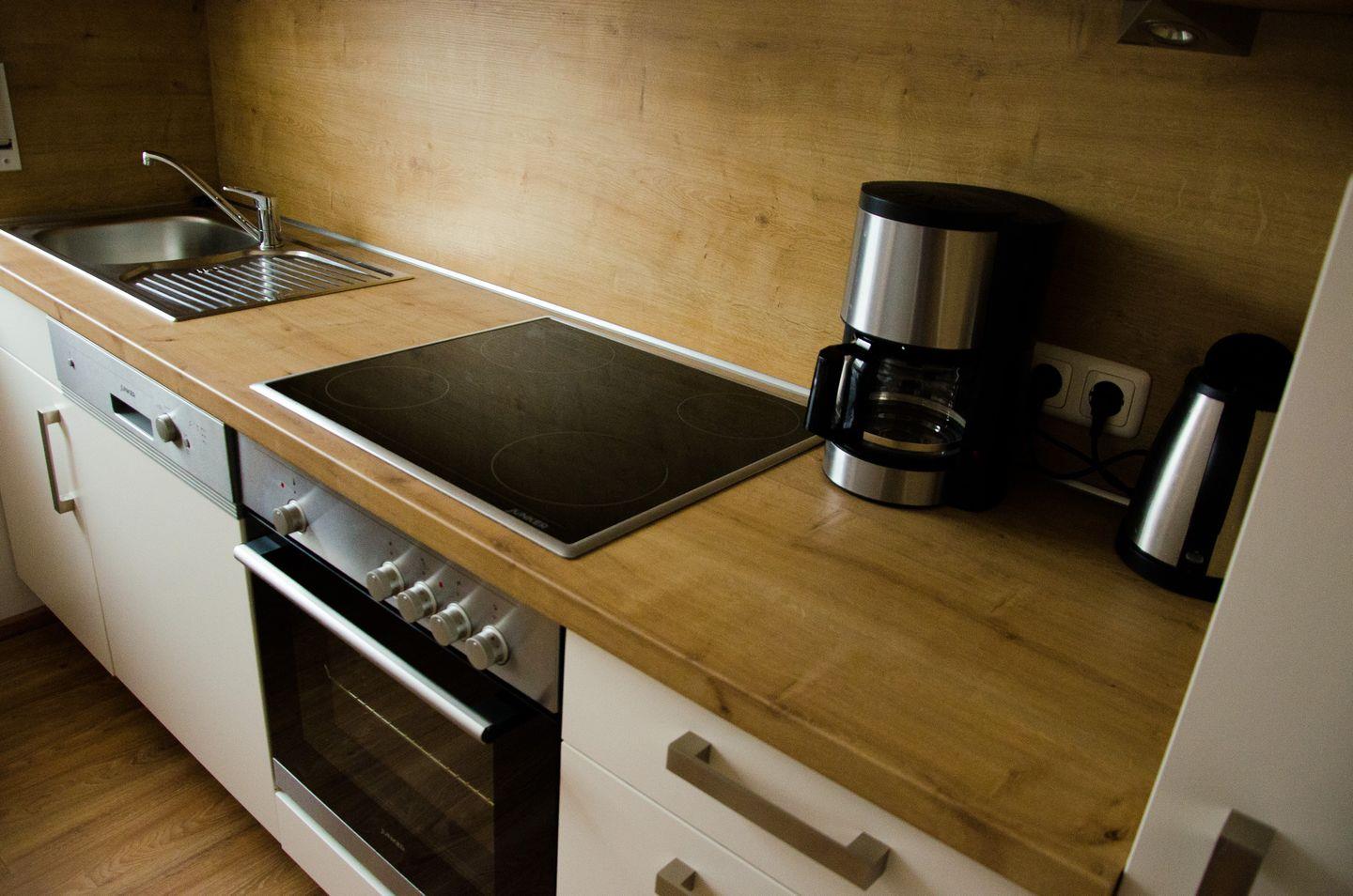 Die Küche ist komplett ausgestattet mit Cerankochfeld, Geschirrspüler, Kühl-Gefrierschrank und Backofen und grenzt direkt an das Wohnzimmer. Im Obergeschoss erwarten Sie zwei Schlafzimmer (ein Doppelbett und zwei Einzelbetten) sowie ein geräumiges Badezimmer mit Dusche und Waschmaschine. Ein weiteres Schlafzimmer, mit einem 140 cm Bett, und zwei einzelnen Matratzen befindet sich im zweiten Obergeschoss.