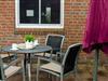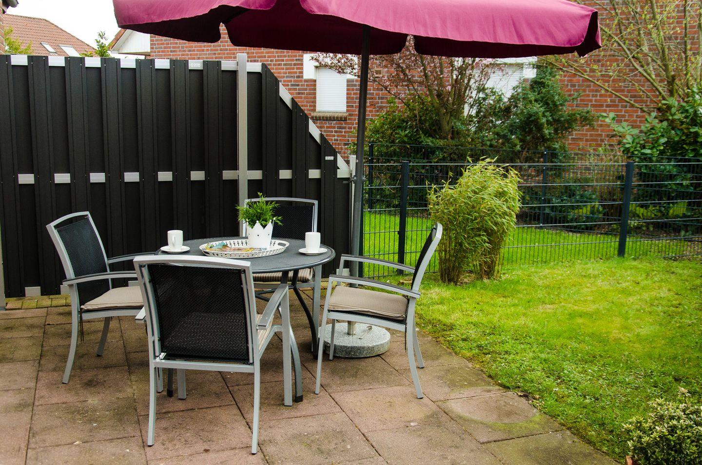 Von hier gelangen Sie auf die Terrasse mit Gartenmöbeln und Liegen.