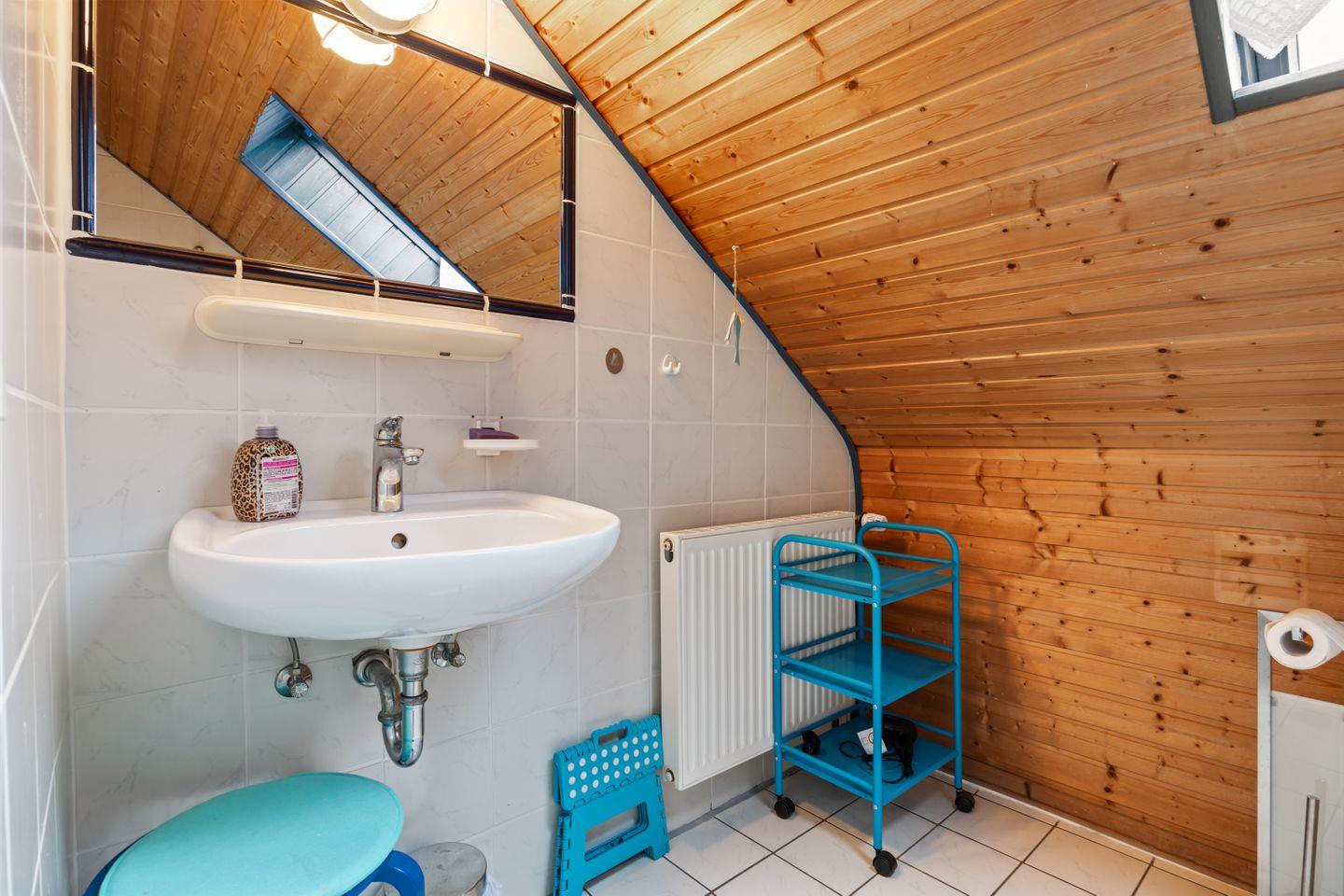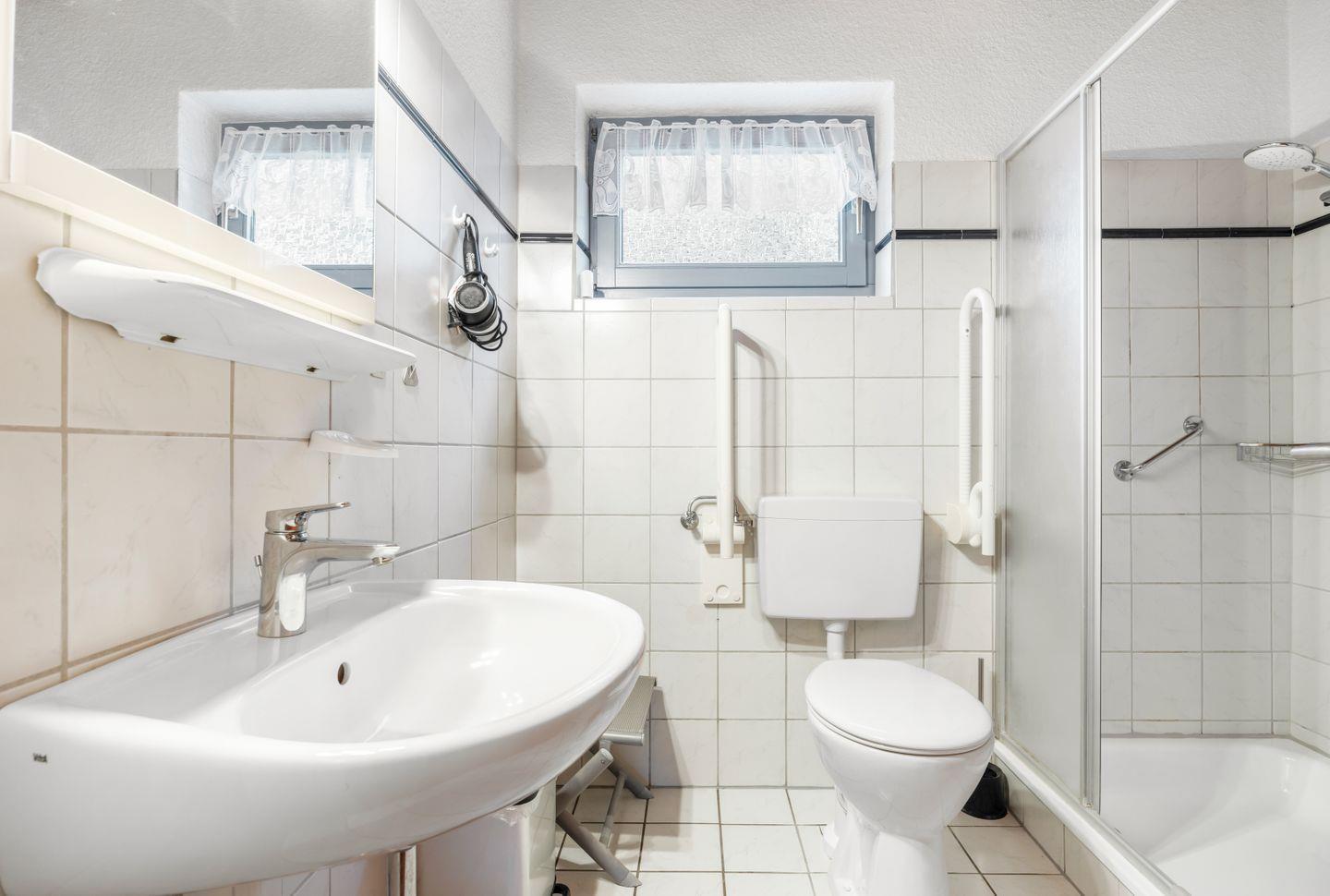 Im Erdgeschoss befindet sich ein Badezimmer mit WC, Dusche, Waschmaschine und Wäschetrockner. Das Obergeschoss bietet ein weiteres Badezimmer mit WC, Badewanne und Handdusche.