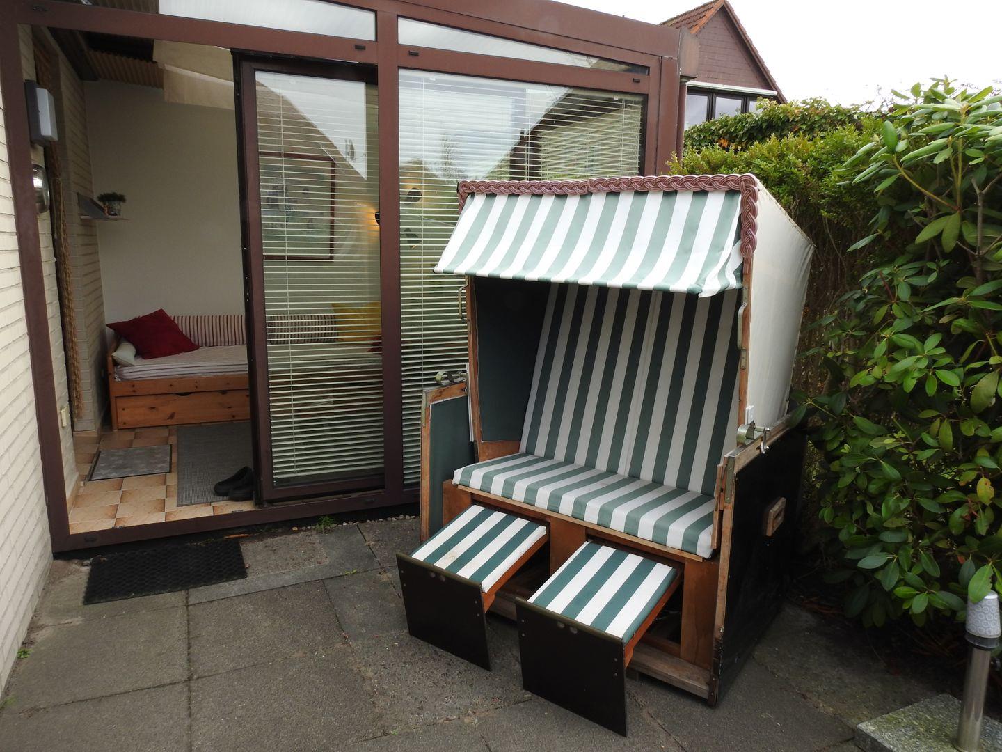 Kleine Terrasse mit Gartenanteil und eigenem Strandkorb für entspannte Abende