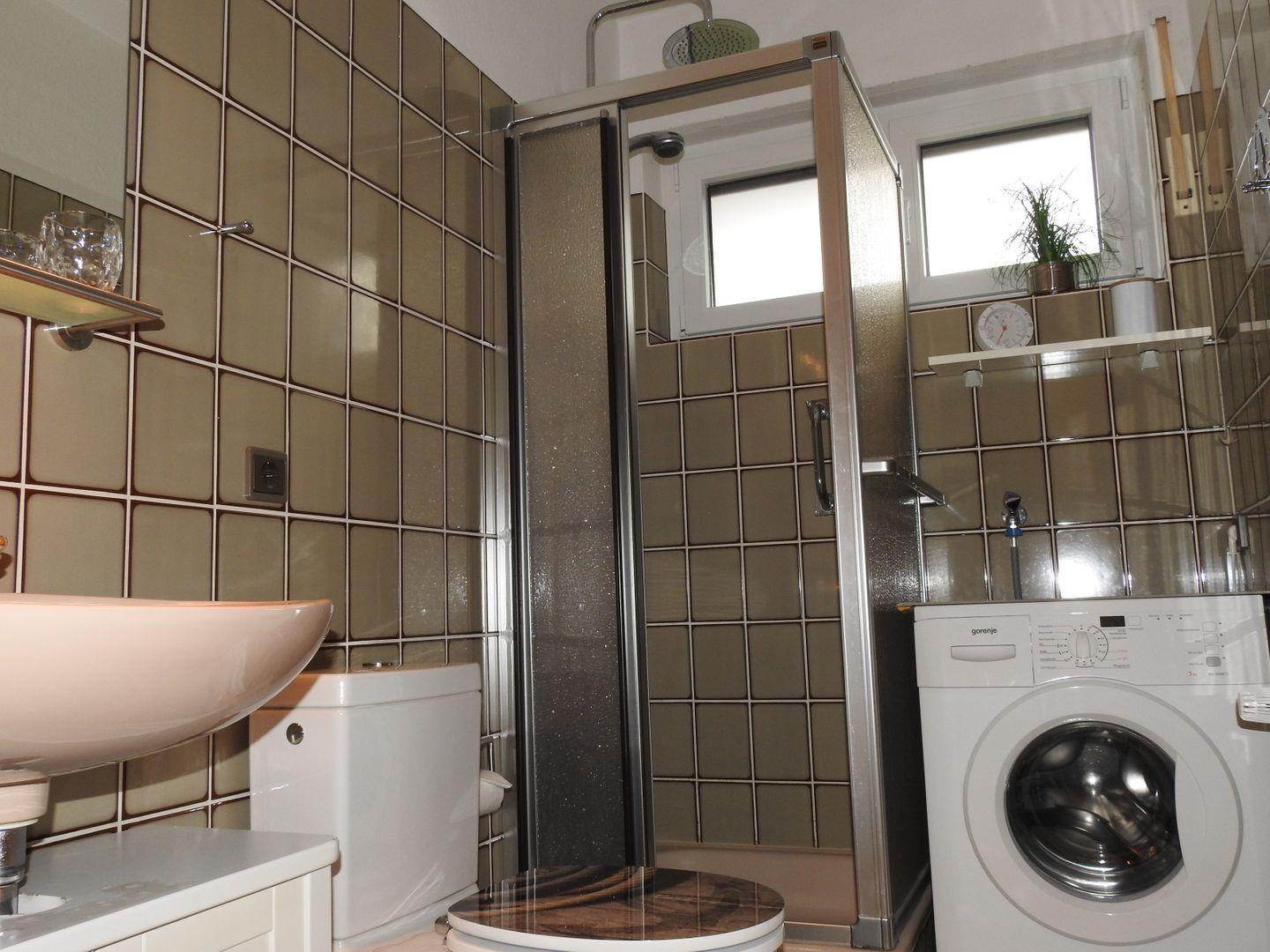 Helles Tageslicht-Duschbad mit Waschmaschine