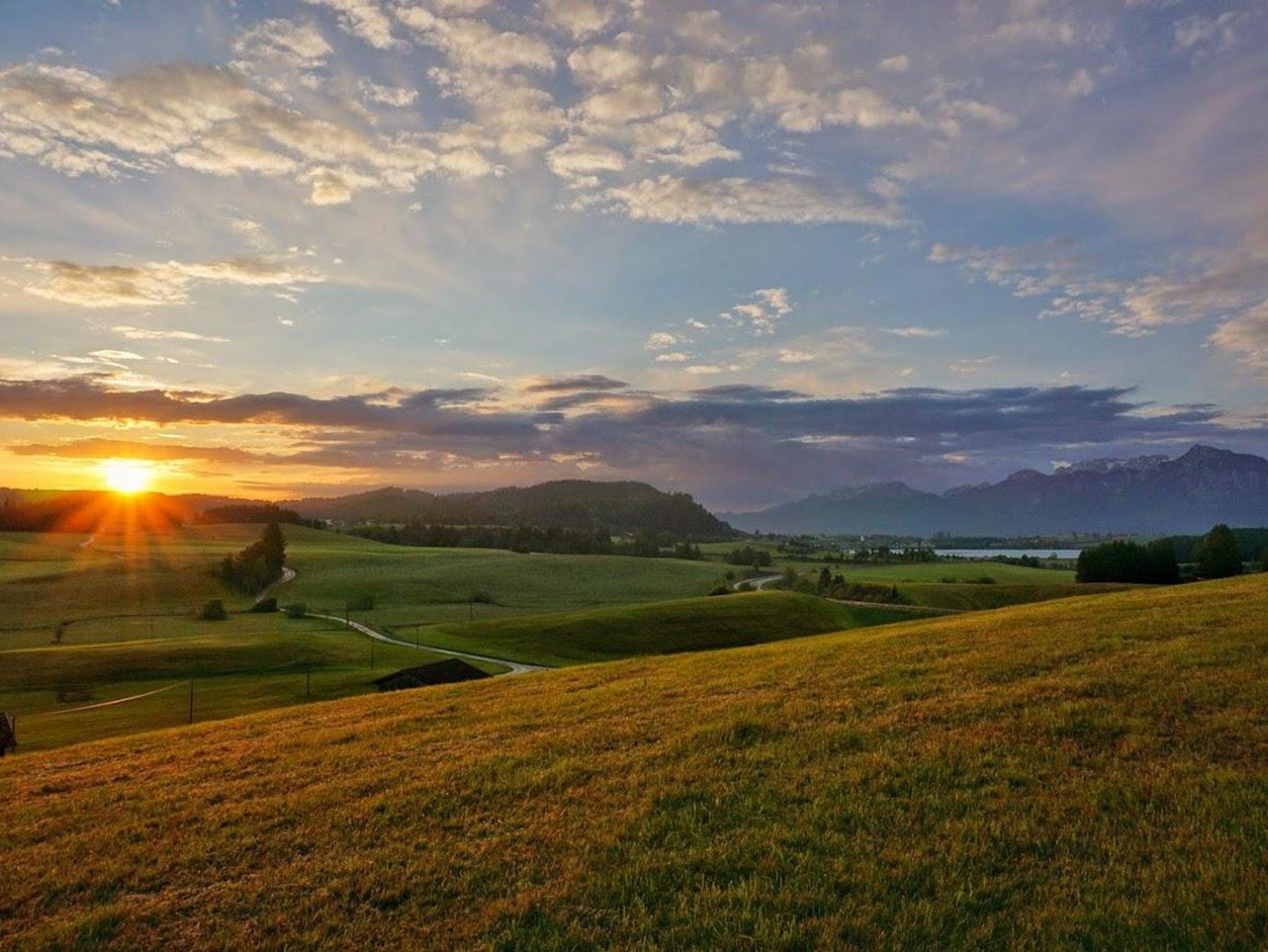 Der Panoramahof Breher liegt im Hopferauer Ortsteil Schraden und zeichnet sich besonders durch einen atemberaubenden Ausblick in die Allgäuer und Tiroler Alpen aus. Mehr als 30 Gipfel sind von unserem Hof aus zu sehen und bieten sowohl im Sommer als auch im Winter eine beeindruckende Kulisse. Vom Balkon der Ferienwohnung blicken Sie über den nahegelegenen Hopfensee, dessen Riviera vor allem nachts eindrucksvoll beleuchtet ist.