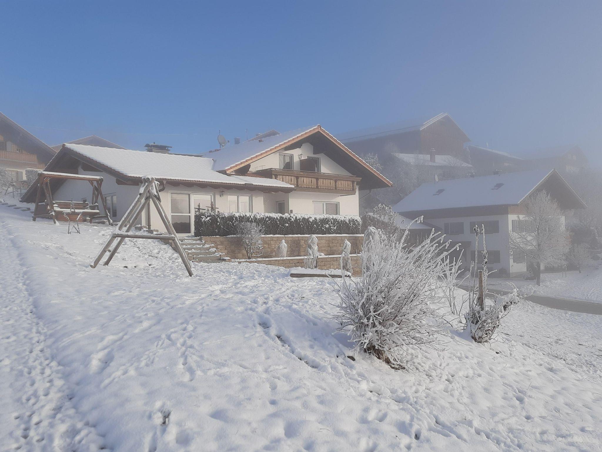 Verbringen Sie Ihren Urlaub in unserer 55 m² großen Ferienwohnung (Dachgeschoß), bestehend aus einer Wohnküche (Küchenzeile mit Essecke, Wohn- und Schlafouch mit TV-Ecke), einem Schlafzimmer (mit zusätzlicher Schlafcouch), Dusche/ WC und Südbalkon (mit Blick über die Allgäuer Alpen bis hin zu Schloß Neuschwanstein). WLAN gratis. Bettwäsche, Dusch- und Handtücher vorhanden. Parkplatz am Haus, Abstellmöglichkeit für Fahrrad und Ski/Schlitten in Garage möglich. Im Garten Sitz- und Liegemöglichkeit, Schaukel, Trampolin unt Tischtennis - Rodelhang am Haus.