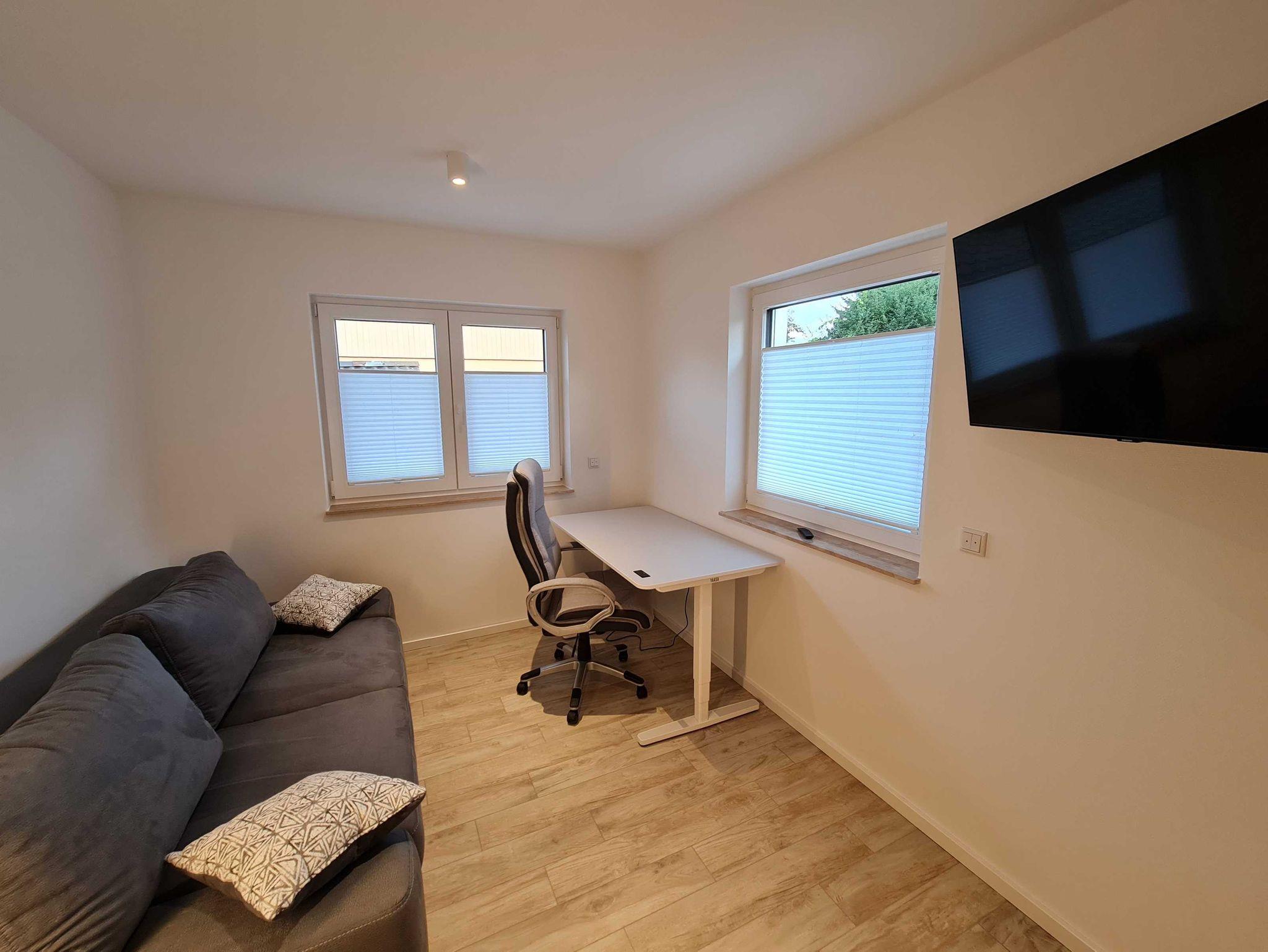 Die 3-Zimmer Wohnung ist im EG des Hauses gelegen und ca. 70 qm groß. Eigene Terrasse, ebenerdige Dusche, Waschmaschine, hochwertige Einbauküche mit Geschirrspüler, Backofen und vollständiger Ausstattung, LAN und W-LAN sind nur einige High-Lights. Ein höhenverstellbarer Schreibtisch und in jedem Zimmer ein Q-LED Sat TV, Abstellraum, Fussbodenheizung und elektrische Rolläden sprechen für einen überdurchschnittlichen Comfort. Eine große gemütliche Couch im Wohnzimmer, eine comfortable Schlafcouch im Arbeitszimmer und ein bequemes Doppel-Boxspringbett versprechen gemütliche Abende und traumreiche Nächte. Der Garten mit Grillmöglichkeit kann gern mit benutzt werden.