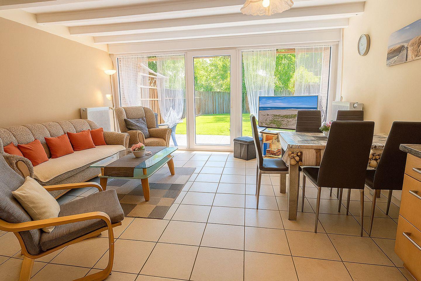 Im Inneren des Hauses erwartet Sie eine durchdachte Raumaufteilung mit drei separaten Schlafzimmern, die ausreichend Platz für die ganze Familie bieten. Im Erdgeschoss befindet sich die moderne, offen gestaltete Küche, die mit Geschirrspüler, Mikrowelle, Backofen, Ceranfeld sowie einer Kühl- und Gefrierkombination bestens ausgestattet ist und keine Wünsche offenlässt. Der angrenzende Wohn- und Essbereich mit großzügigem Esstisch für bis zu sechs Personen bildet den gemütlichen Mittelpunkt des Hauses. Von hier aus gelangen Sie direkt auf die sonnige Terrasse mit eingezäuntem Garten, wo Sie die frische Nordseeluft genießen, entspannte Stunden im Freien verbringen oder den Tag in ruhiger Atmosphäre ausklingen lassen können.