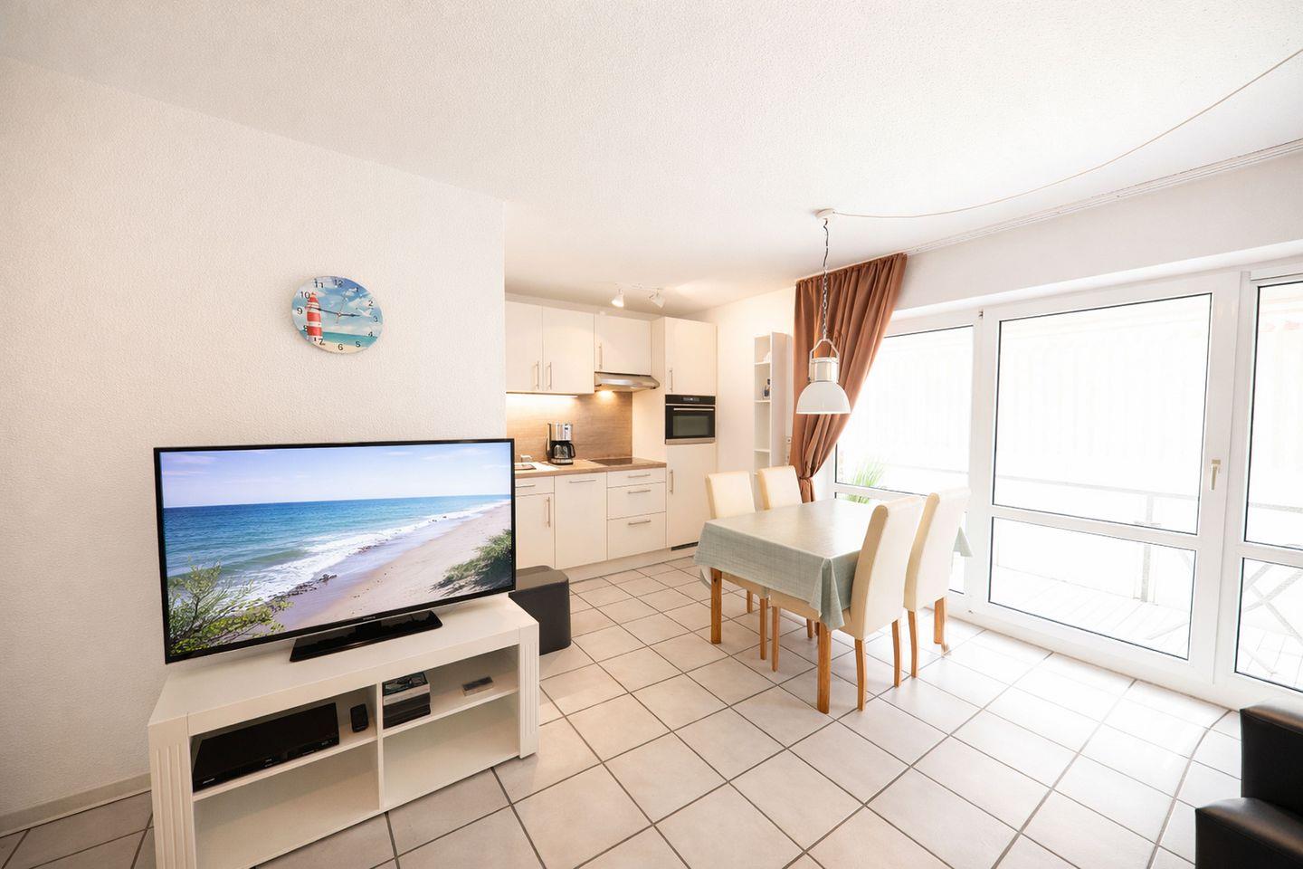 Der helle Wohnbereich lädt mit einem gemütlichen Sofa zum Zurücklehnen und Entspannen ein. Kabel-TV, DVD-Player und Radio sorgen für Unterhaltung, während die offene, voll ausgestattete Küche keine Wünsche offenlässt. Backofen, Ceranfeld, Spülmaschine, Mikrowelle, Kaffeemaschine und weitere praktische Küchengeräte ermöglichen eine komfortable Selbstversorgung. Der angrenzende Essbereich führt direkt auf den Balkon, auf dem Sie die frische Nordseeluft genießen und den Tag entspannt ausklingen lassen können.