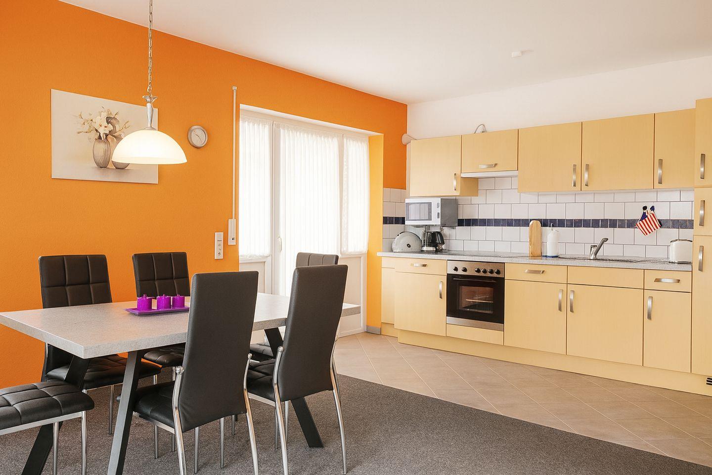 Die komfortable Wohnung ist behindertengerecht gestaltet und verfügt über zwei separate Schlafzimmer, die ausreichend Platz für Familien oder Paare bieten. Ein Schlafzimmer ist mit einem komfortablen Doppelbett ausgestattet, während das zweite Schlafzimmer über zwei Einzelbetten verfügt und sich ideal für Kinder, Freunde oder Begleitpersonen eignet. Der offen gestaltete Wohnbereich verbindet Wohnen, Kochen und Essen zu einem harmonischen Mittelpunkt der Wohnung. Die integrierte Küche ist hervorragend ausgestattet und lässt keine Wünsche offen. Sie verfügt über Backofen, ein Ceranherd, Kühlschrank mit Gefrierfach, Geschirrspüler und Mikrowelle, Kaffeemaschine, Wasserkocher und Toaster, sodass Sie sich im Urlaub ganz flexibel selbst versorgen können.