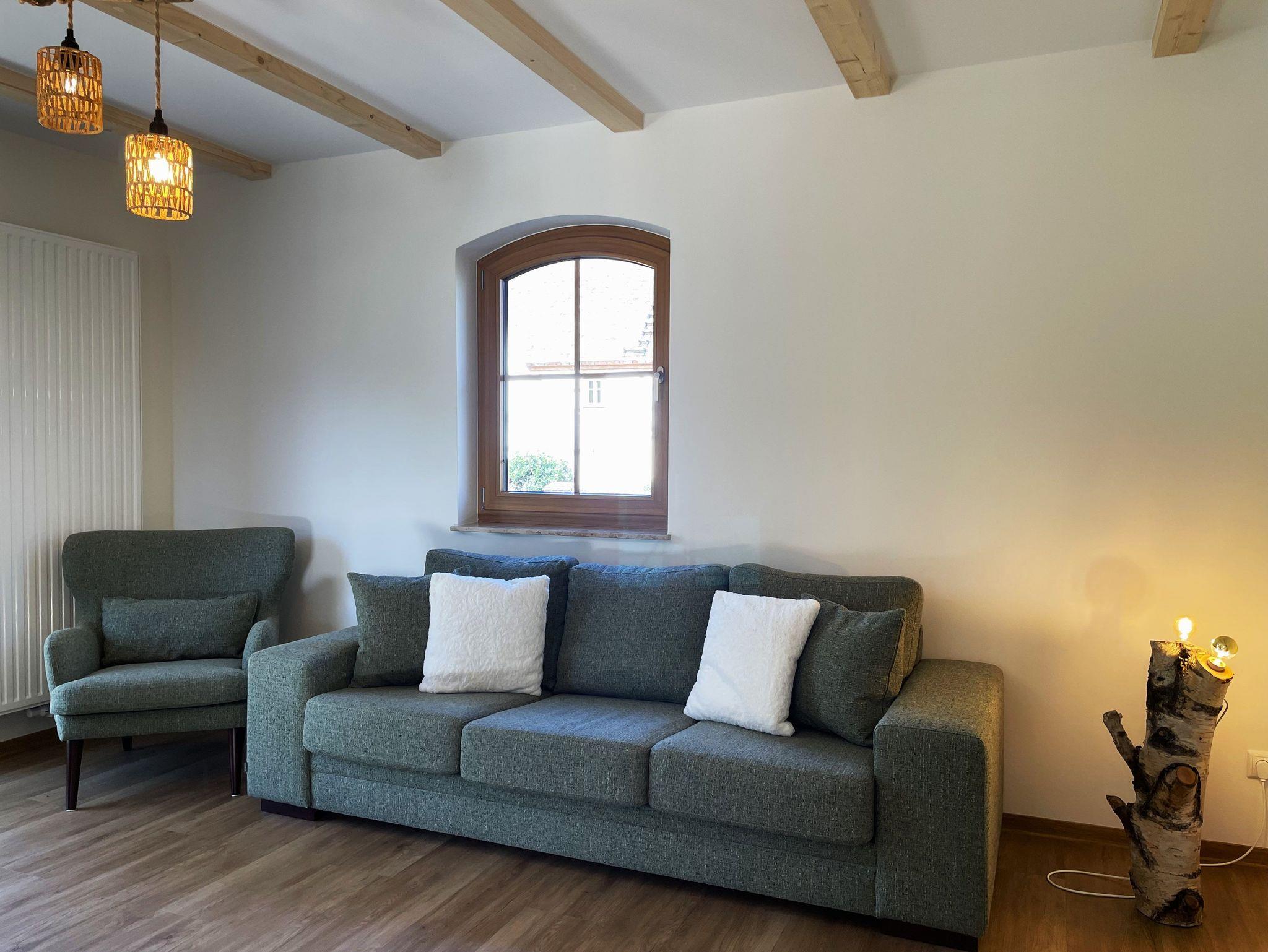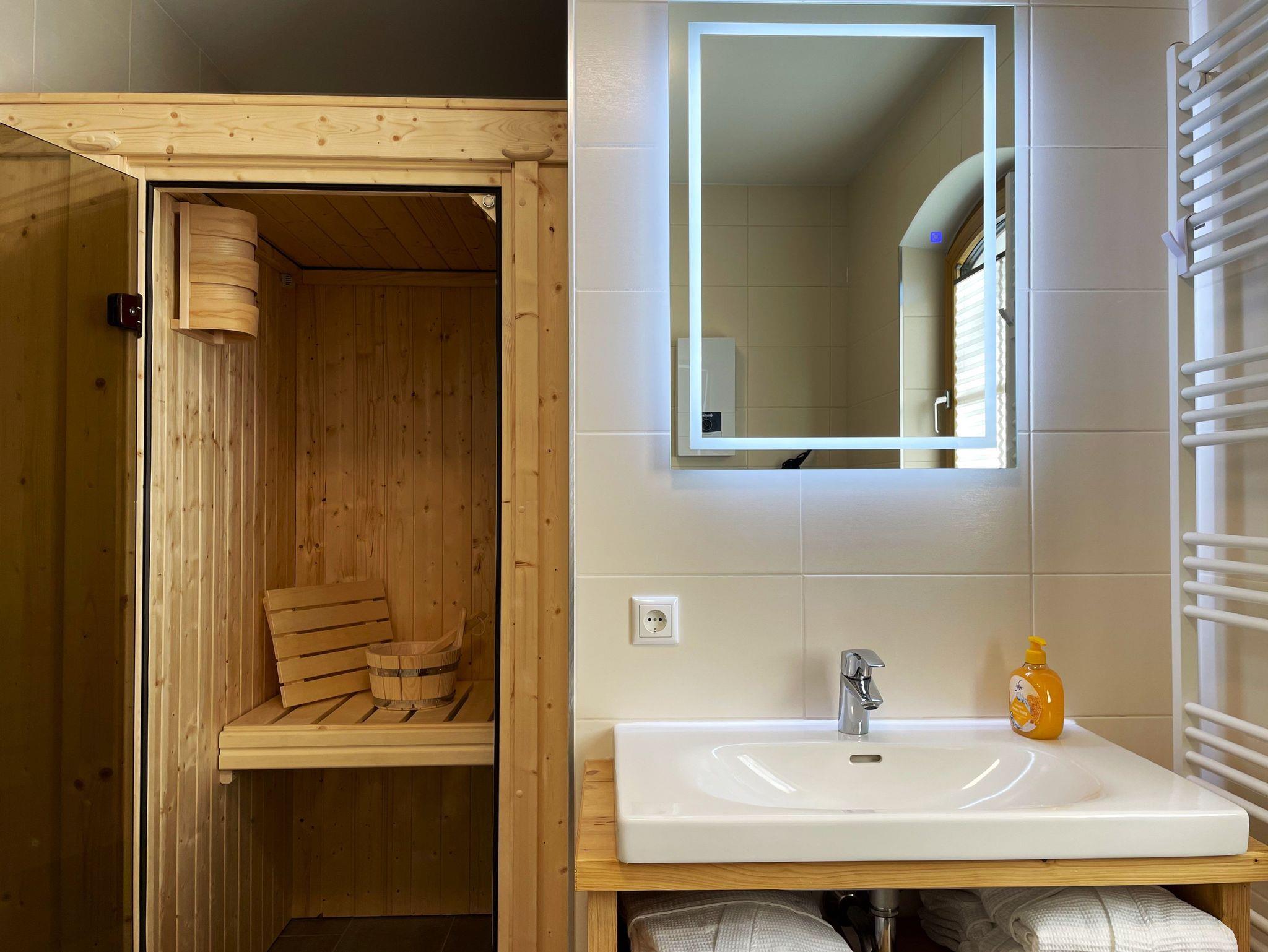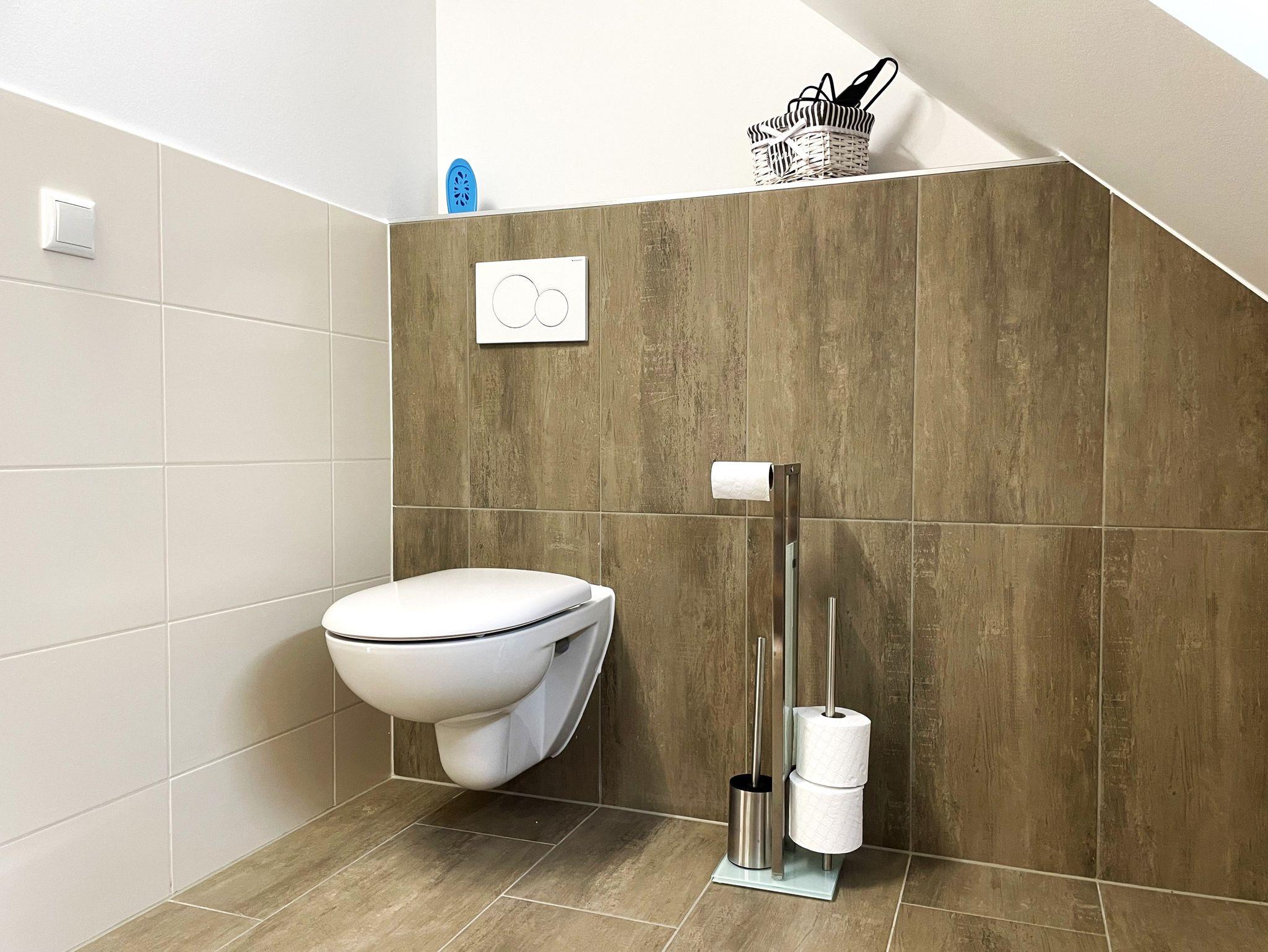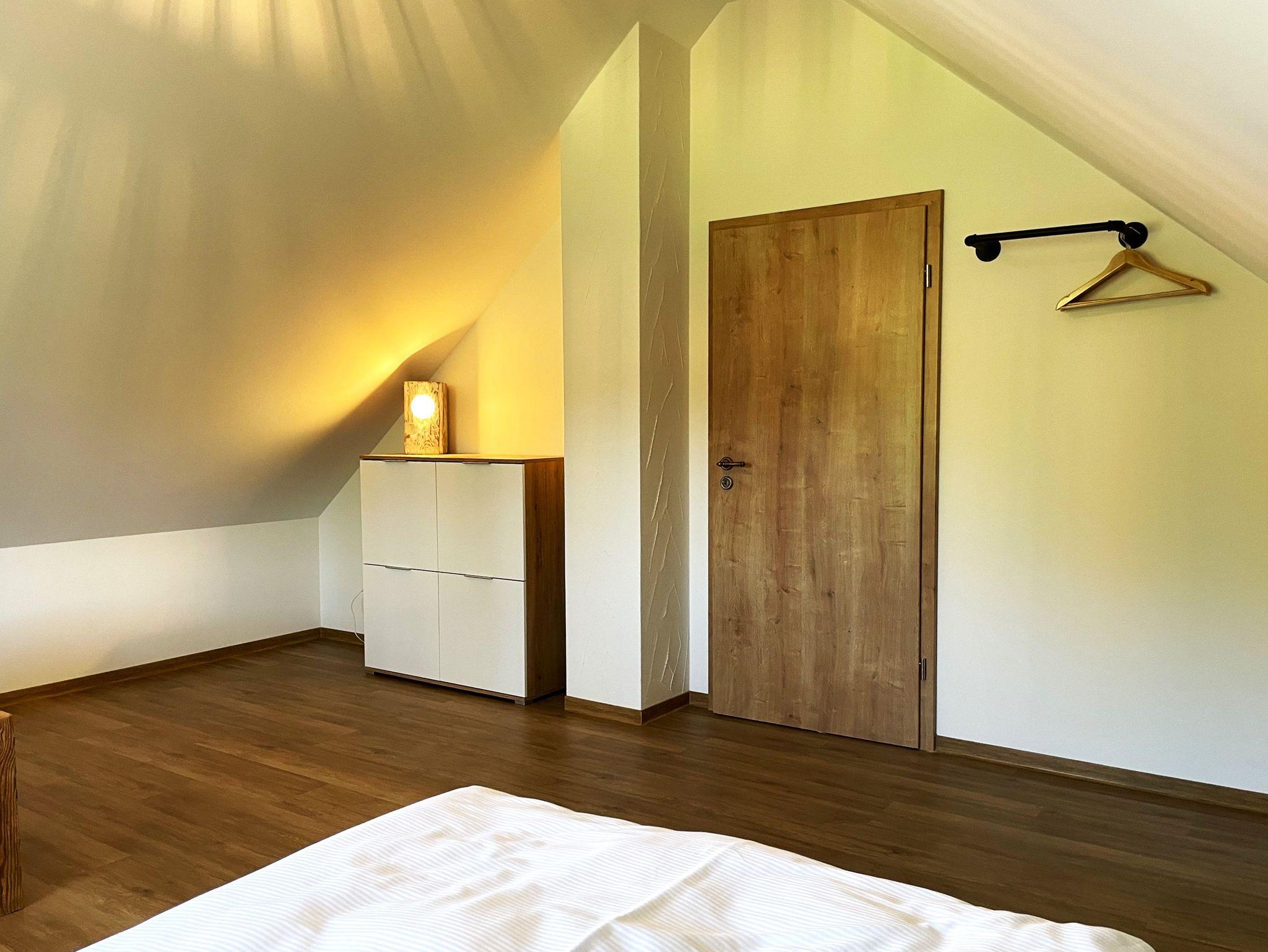 Ein besonderes Highlight ist der Kamin, der zu jeder Jahreszeit für Gemütlichkeit und wohlige Wärme sorgt. Im Erdgeschoss befindet sich außerdem ein Schlafzimmer, das mit einem Doppelbett und einem Kleiderschrank ausgestattet ist. Ebenfalls im Erdgeschoss befindet sich ein Badezimmer mit ebenerdiger Dusche, Waschtisch und WC. Eine integrierte Sauna sorgt für zusätzlichen Komfort. Über eine Treppe gelangt man in die obere Etage, wo sich zwei weitere Schlafzimmer befinden. Hier kann man wählen, ob man in zwei getrennten Betten schlafen möchte oder ein Doppelbett bevorzugt. Eine kleine Gästetoilette mit Waschbecken und WC befindet sich ebenfalls im Obergeschoss. Von der Terrasse gelangt man direkt ins Freie. Die gemütlichen Terrassenmöbel laden zum Verweilen ein - sei es, um die frische Luft zu genießen, zum Essen oder einfach nur zum Entspannen. Die Terrasse ist ein idealer Ort, um die ländliche Ruhe zu erleben und die Schönheit der Natur zu spüren. Im Ferienhaus “Birkenhain” lassen Sie den hektischen Alltag für eine Weile zu Hause und genießen einfach die Natur.