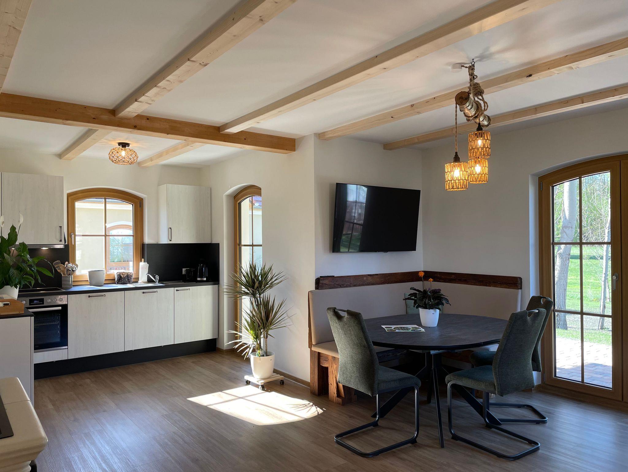 Herzstück des Ferienhauses ist der großzügige Wohnbereich mit offener Küche. Die in hellen Farben gehaltene Einbauküche und die modernen Geräte - Backofen, Kühlschrank mit Gefrierfach, Geschirrspüler, Kaffeemaschine, Toaster und Wasserkocher - laden zum gemeinsamen Kochen, Spielen und Fernsehen ein. Ein gemütliches Sofa und eine Essecke ermöglichen es den Gästen, die Mahlzeiten in harmonischer Atmosphäre zu genießen.