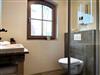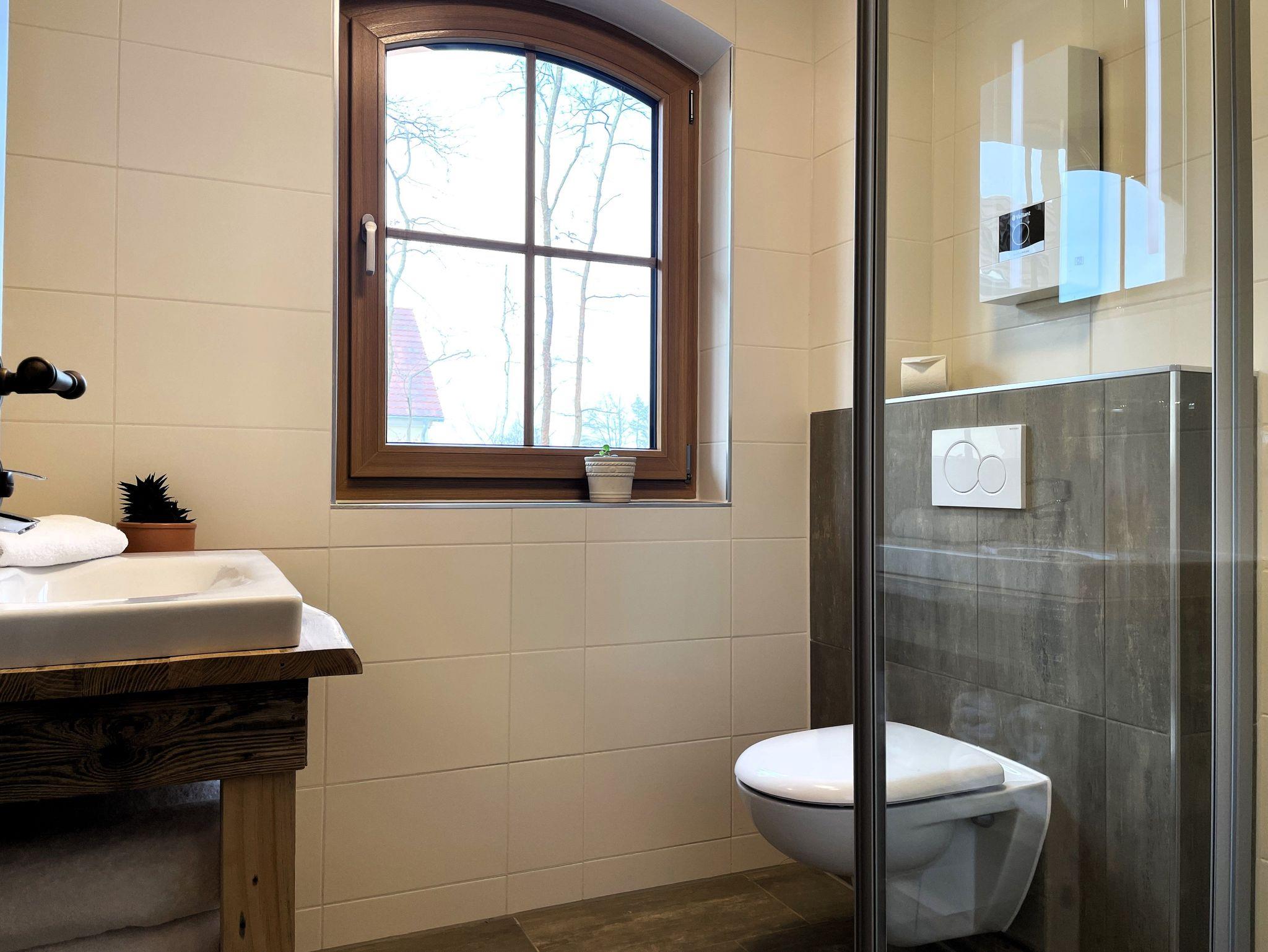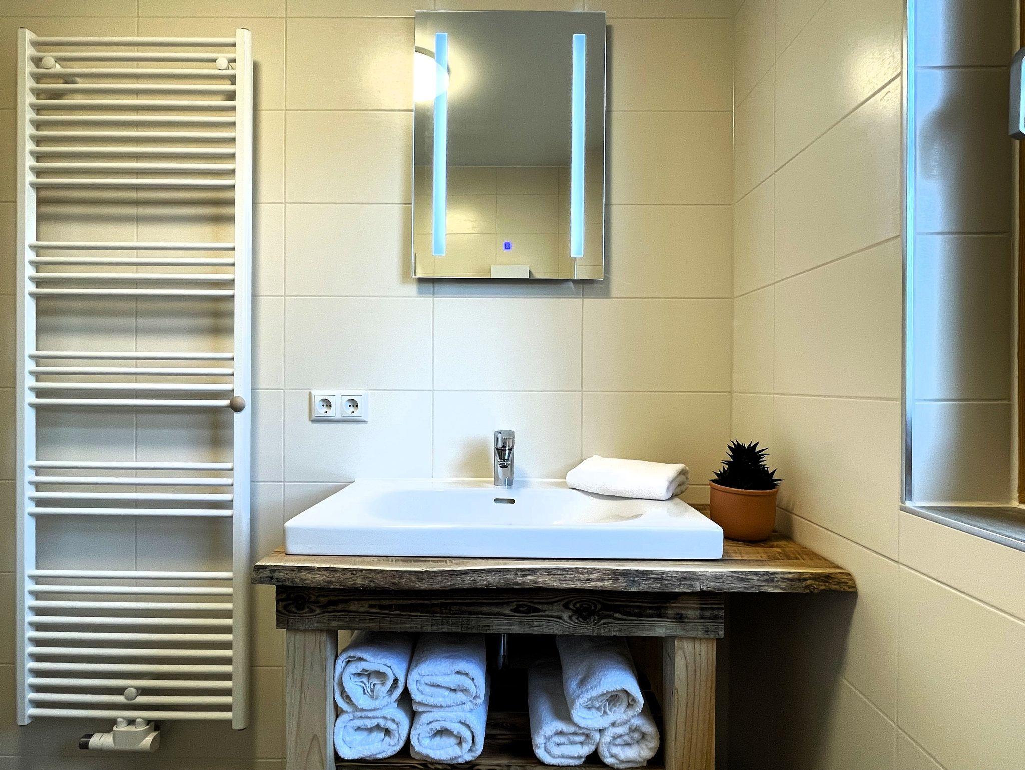 Das Badezimmer ist modern eingerichtet und verfügt über eine ebenerdige Dusche, einen Waschtisch mit Spiegel sowie Handtuchwärmer und WC. Hier können Sie sich nach einem erlebnisreichen Tag erfrischen.