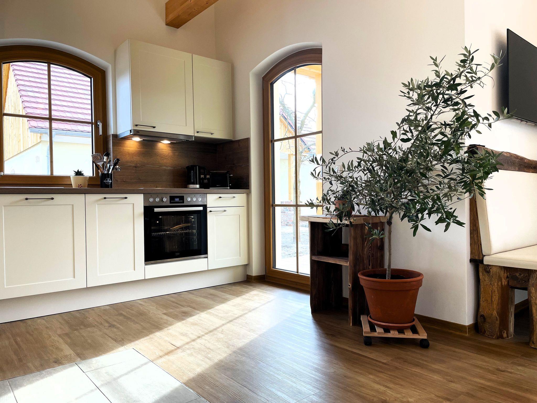 Herzstück des Ferienhauses ist der Wohnbereich, der mit einer offenen und komplett ausgestatteten Küche verbunden ist. Hier können Sie sich wie zu Hause fühlen und gemeinsam kochen, essen und entspannen. Die Küche ist in hellen Farben gehalten und mit allen modernen Geräten wie Backofen, Kühlschrank mit Gefrierfach, Geschirrspüler, Kaffeemaschine, Toaster, Wasserkocher und vielem mehr ausgestattet. Der Wohnbereich ist mit einem gemütlichen Sofa und einer Essecke ausgestattet. Ein Flachbildfernseher sorgt für Unterhaltung und Abwechslung.