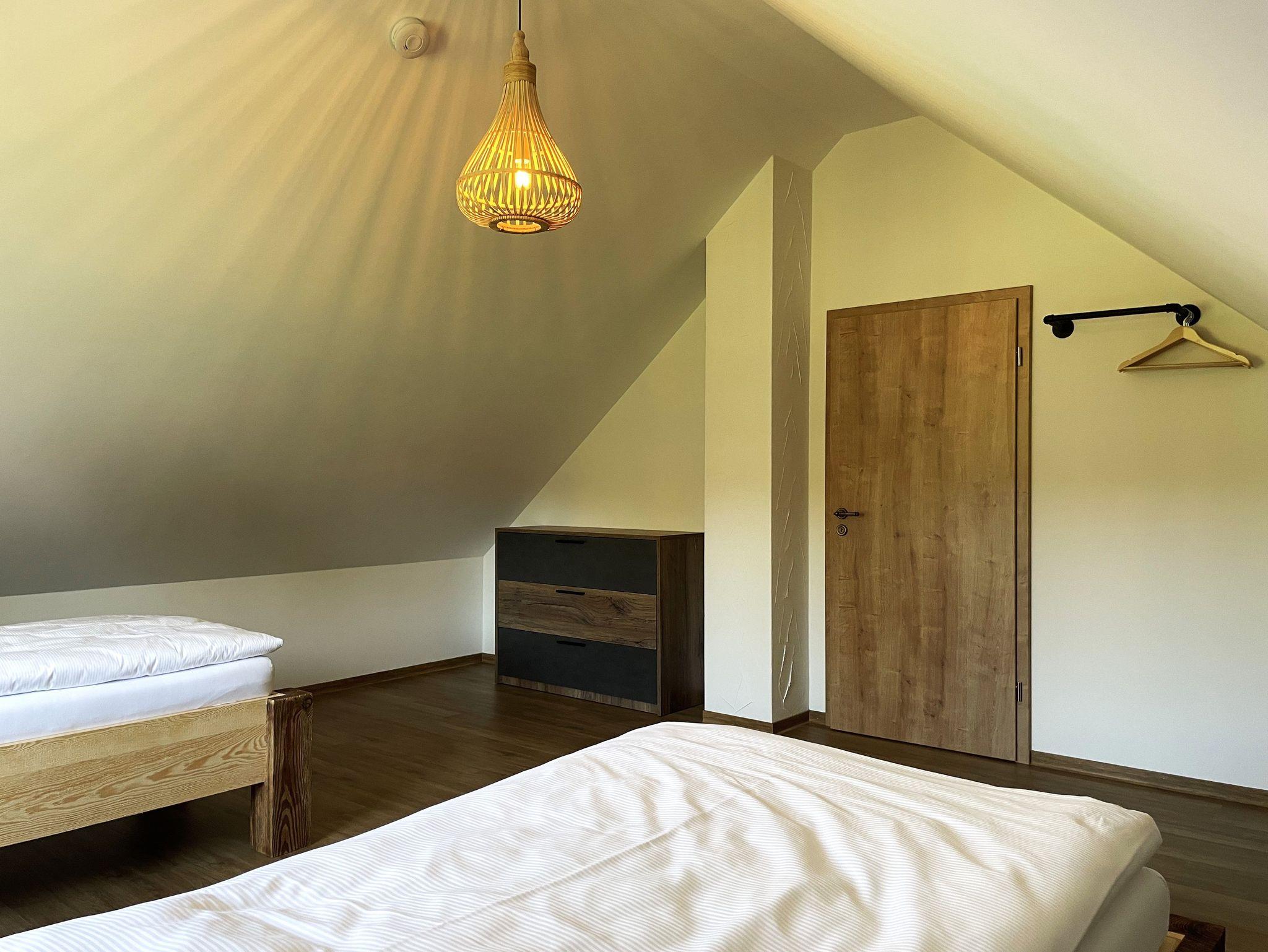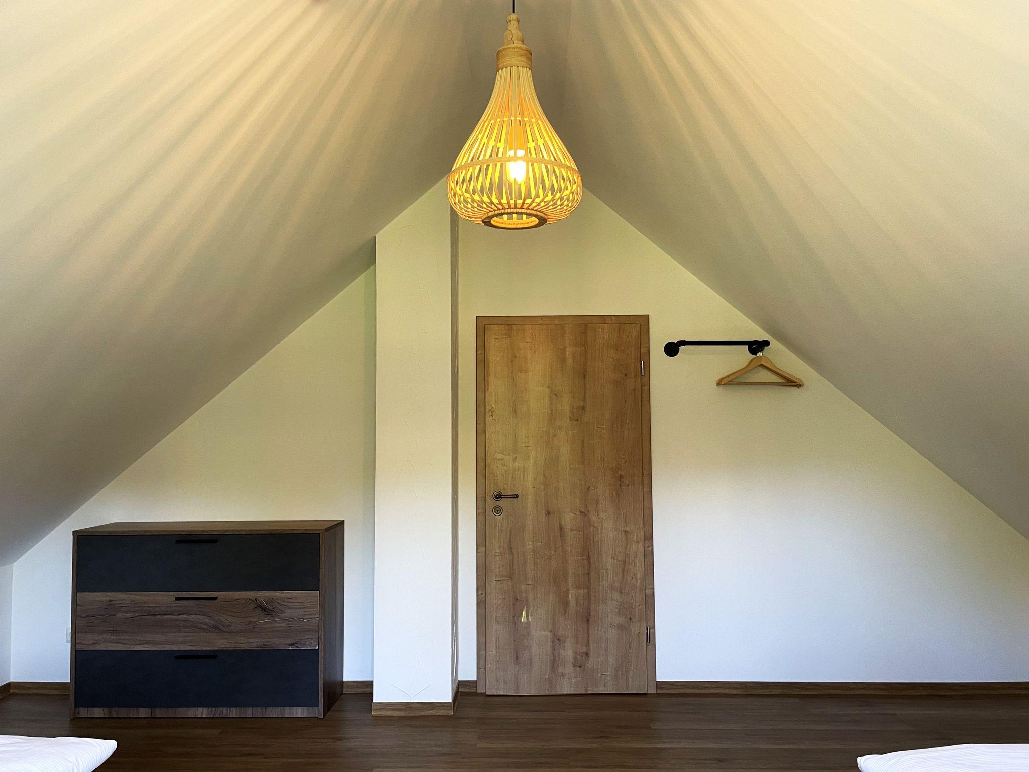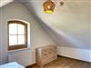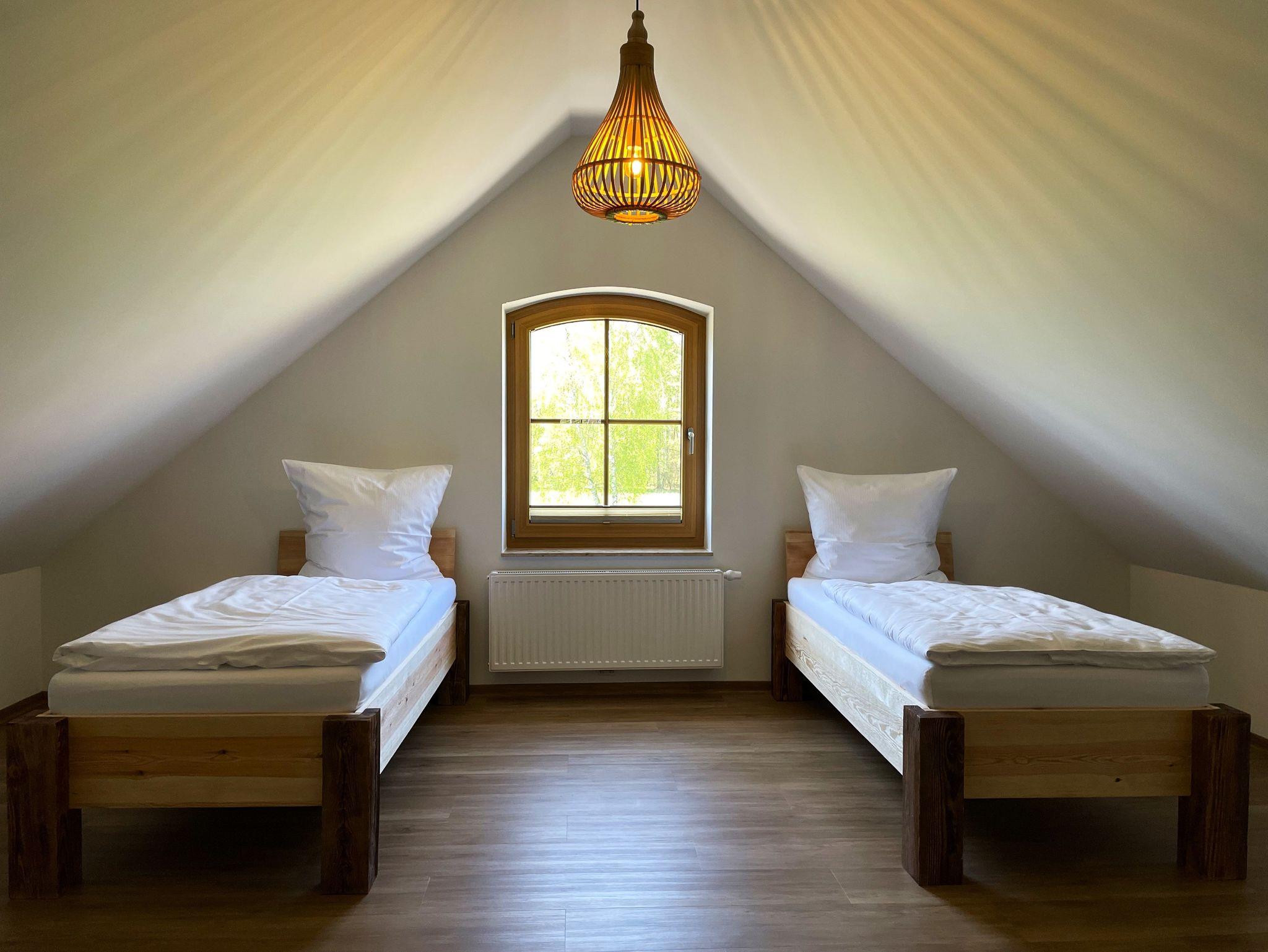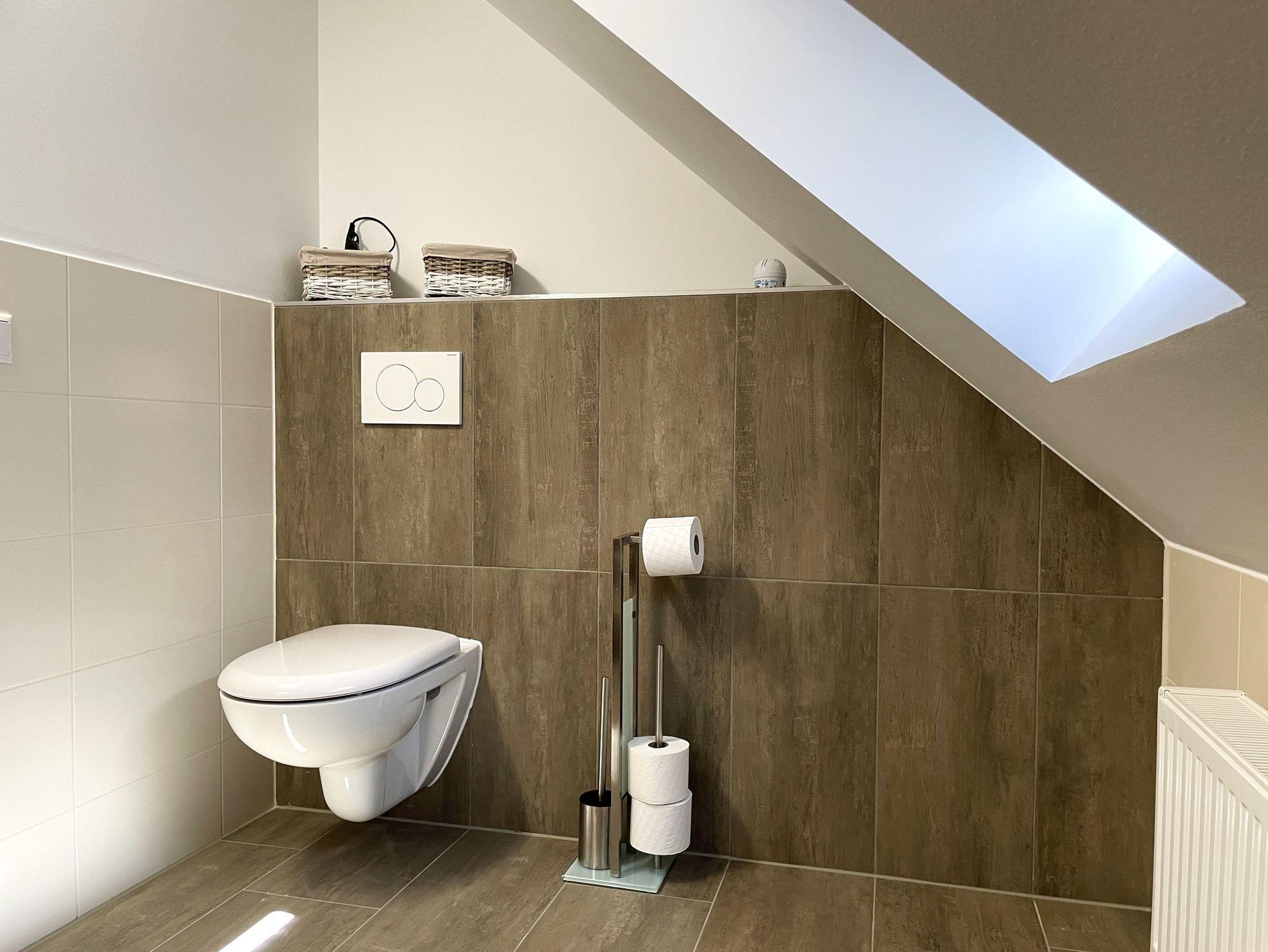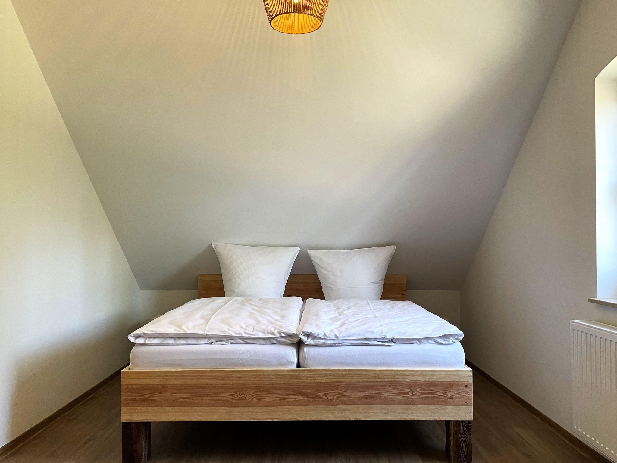 Über eine Treppe gelangt man in die obere Etage, wo sich zwei weitere Schlafzimmer befinden. Hier haben die Gäste die Wahl zwischen zwei getrennten Betten oder einem Doppelbett. Eine kleine Gästetoilette mit Waschbecken und WC befindet sich ebenfalls im Obergeschoss.