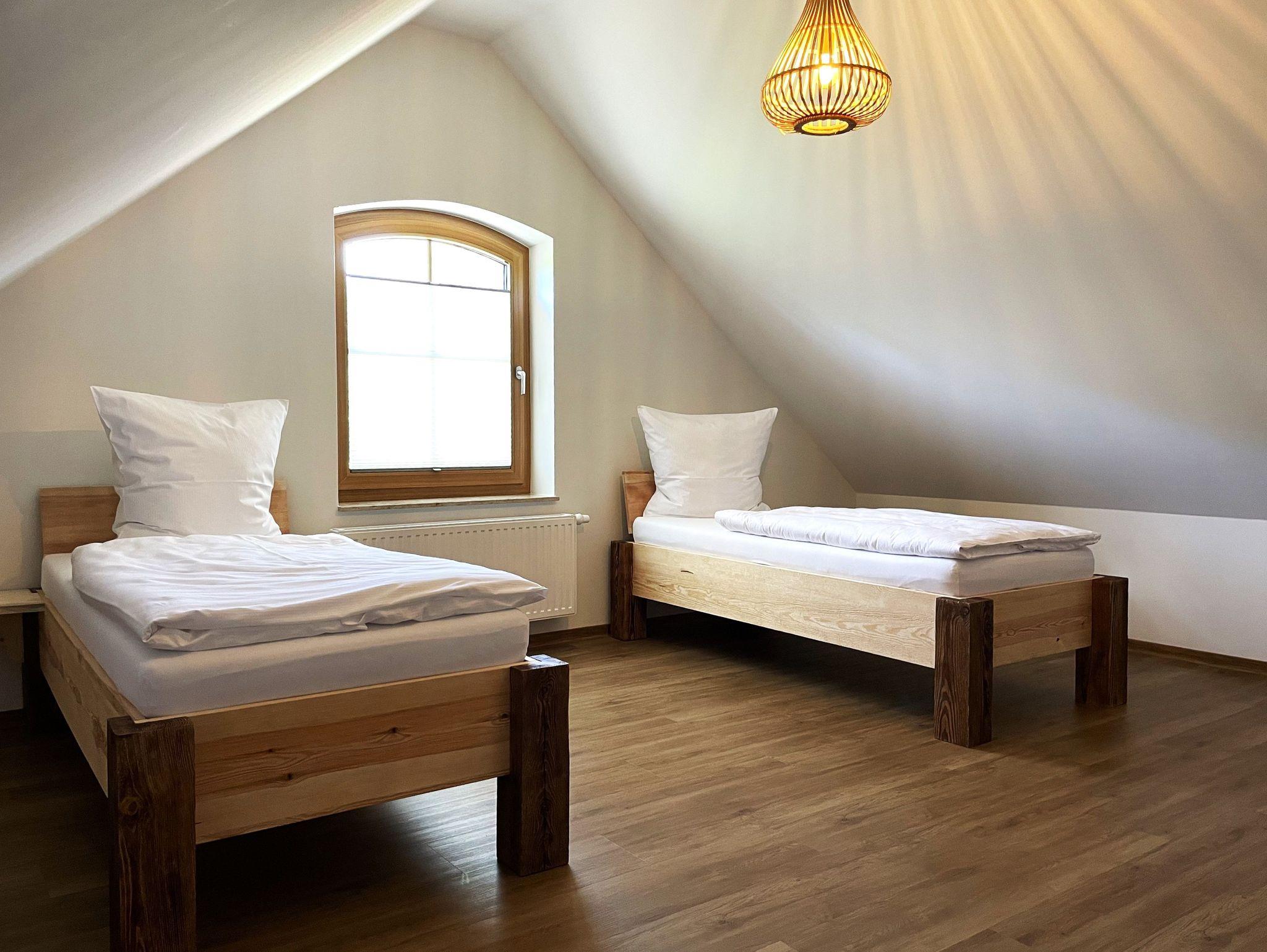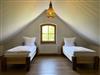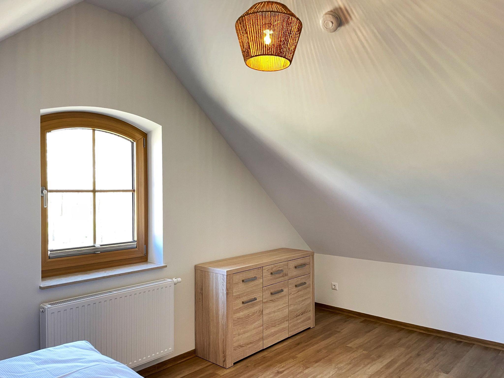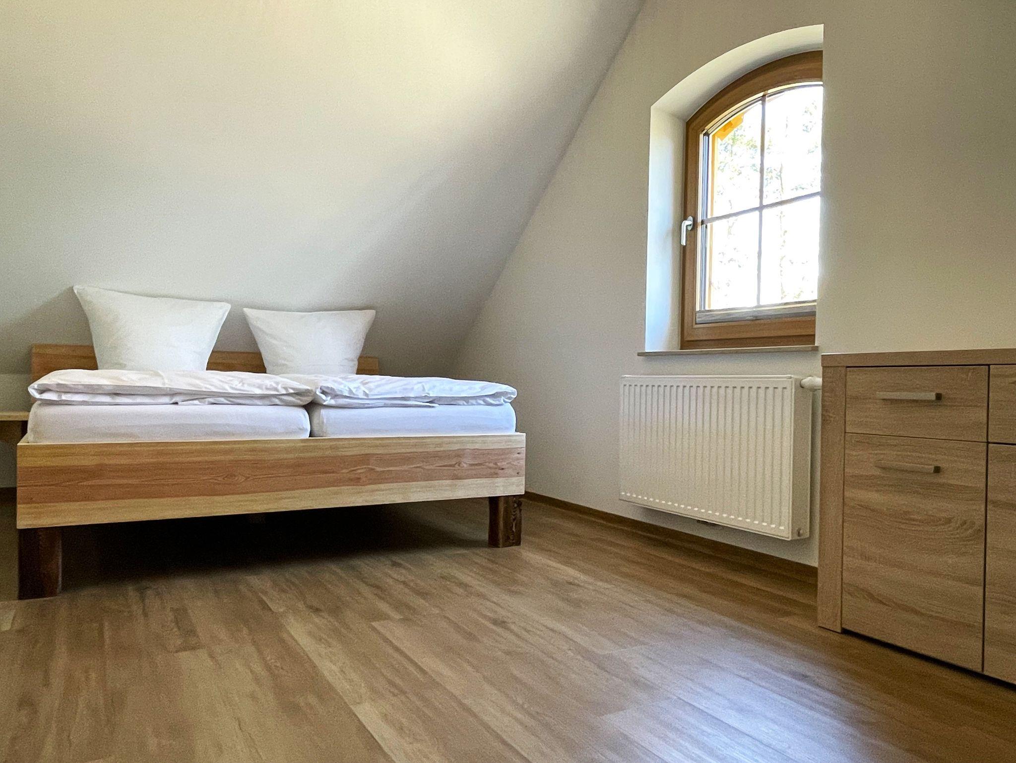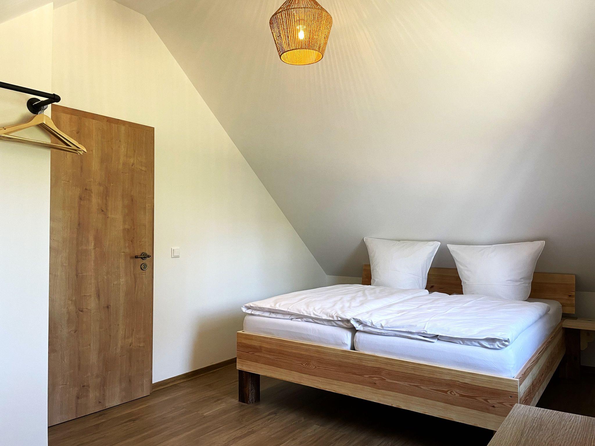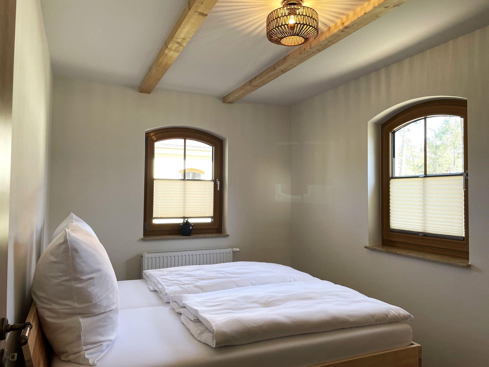 Über eine Treppe gelangt man in die obere Etage, wo sich zwei weitere Schlafzimmer befinden. Hier haben die Gäste die Wahl zwischen zwei getrennten Betten oder einem Doppelbett. Eine kleine Gästetoilette mit Waschbecken und WC befindet sich ebenfalls im Obergeschoss.