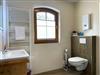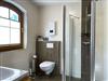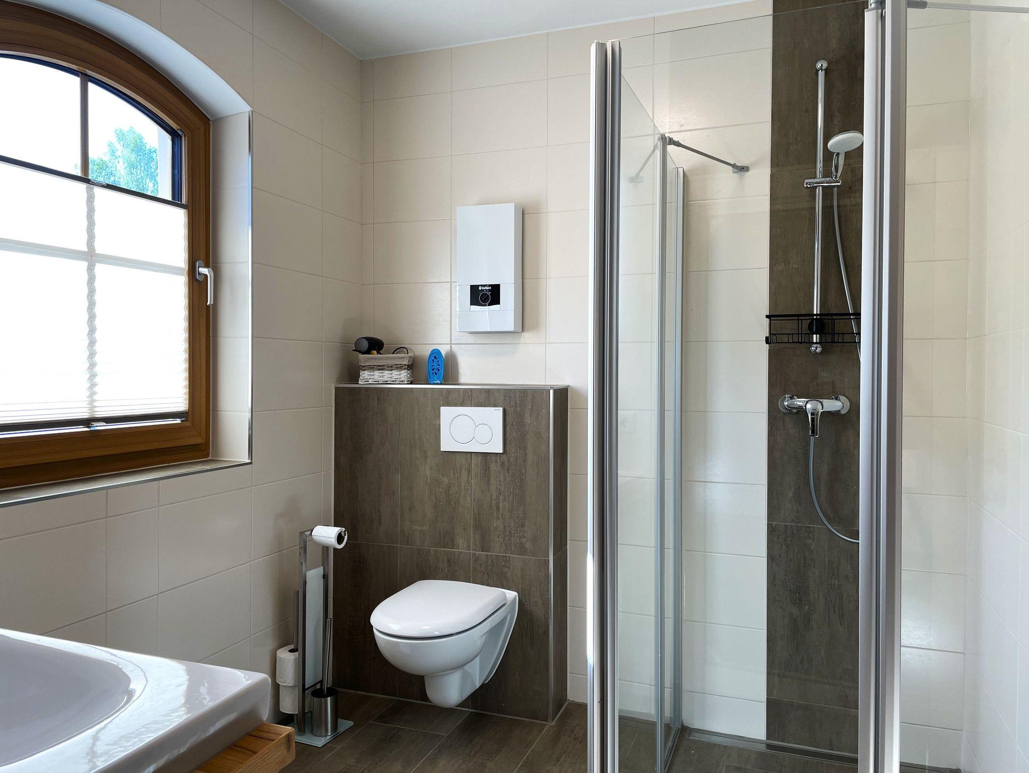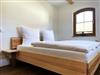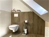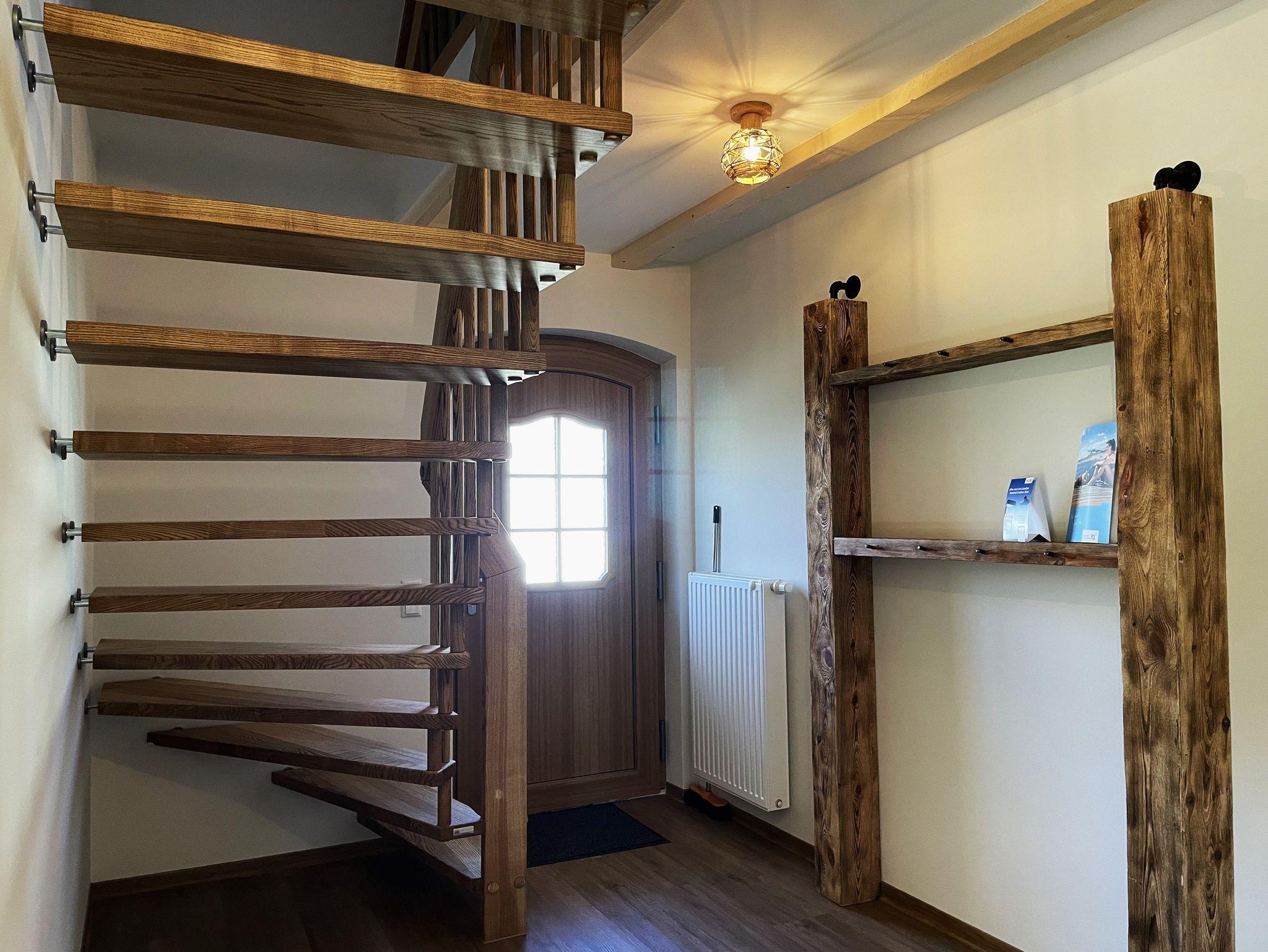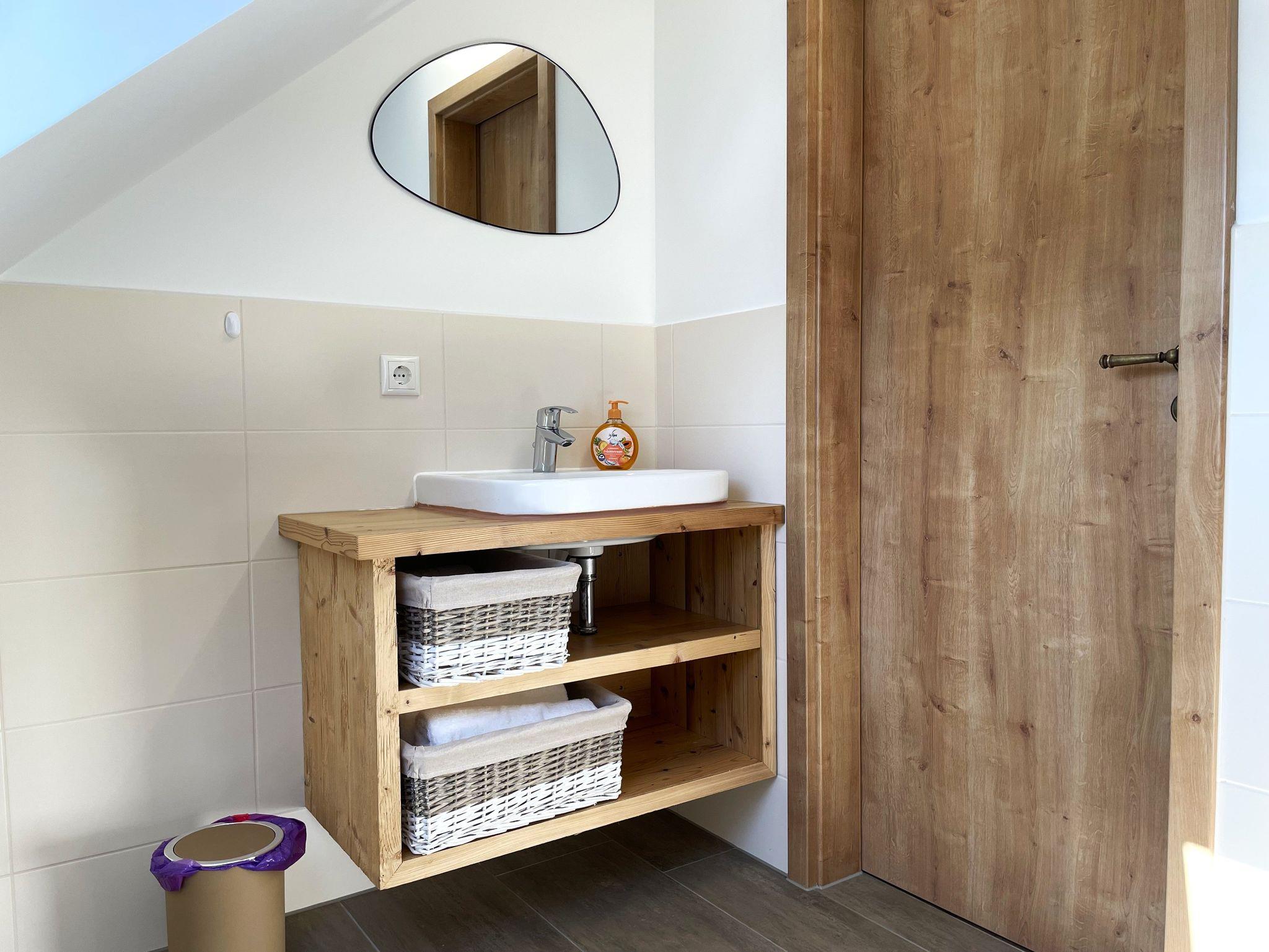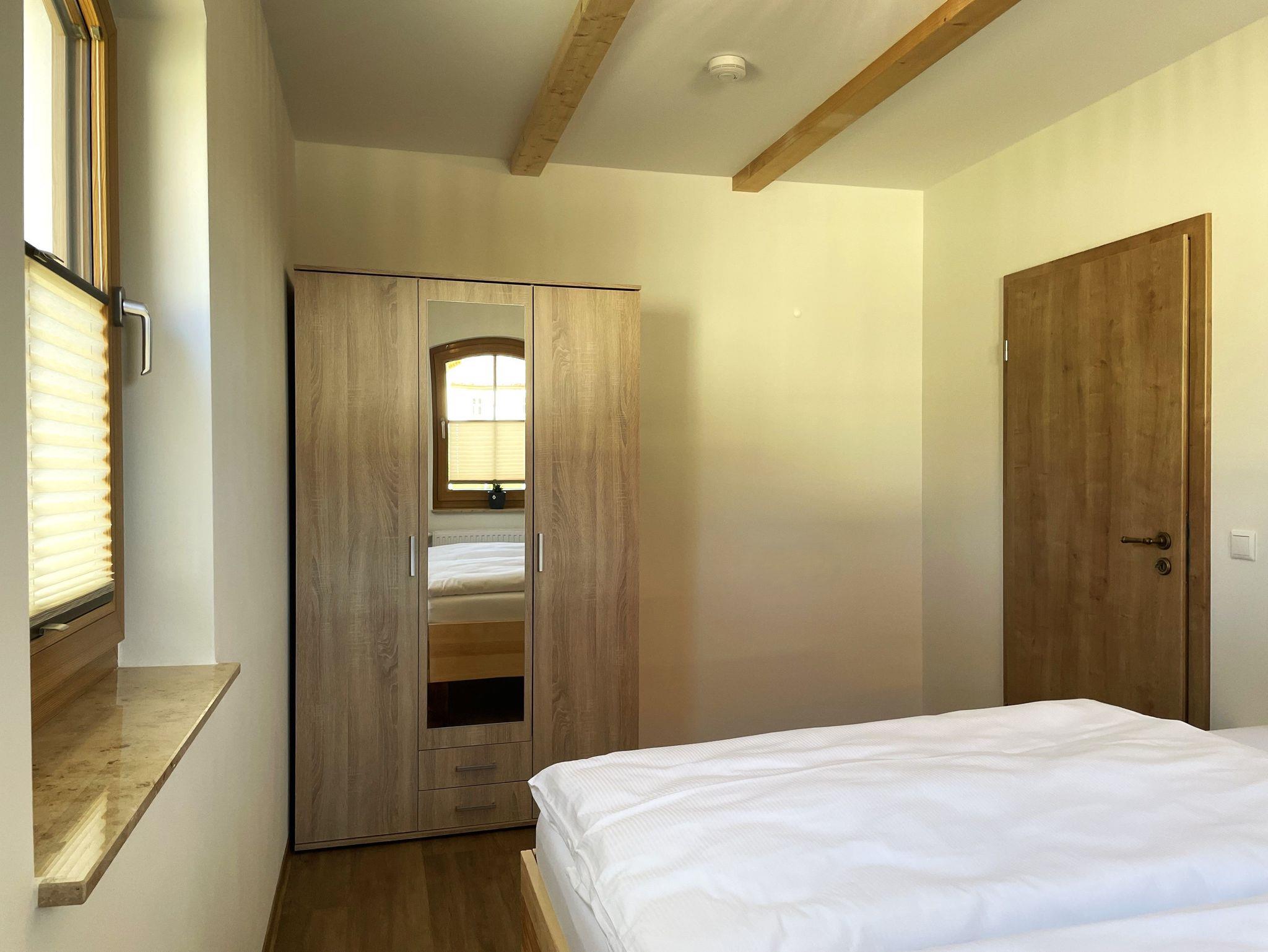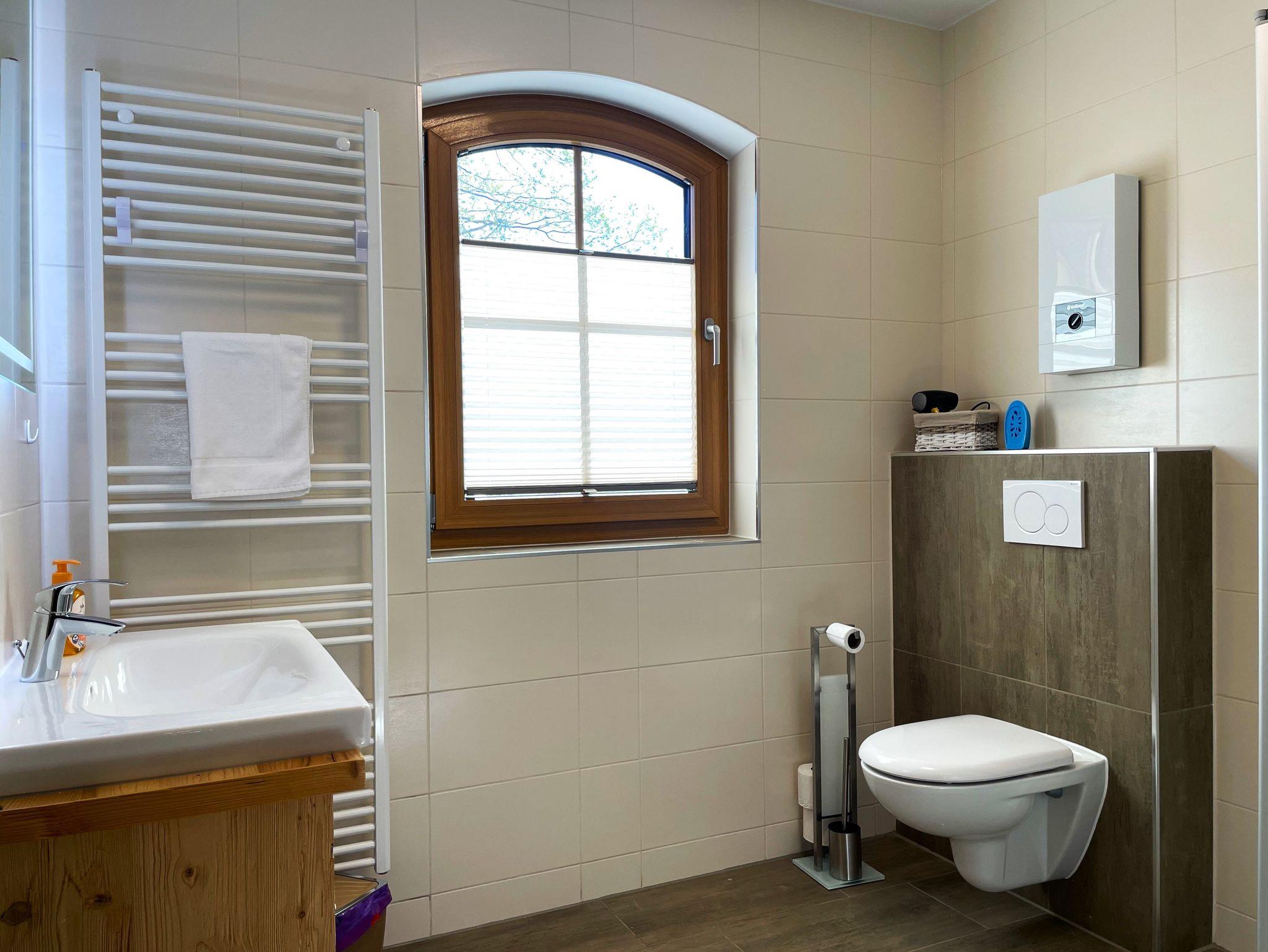 Über eine Treppe gelangt man in die obere Etage, wo sich zwei weitere Schlafzimmer befinden. Hier haben die Gäste die Wahl zwischen zwei getrennten Betten oder einem Doppelbett. Eine kleine Gästetoilette mit Waschbecken und WC befindet sich ebenfalls im Obergeschoss.