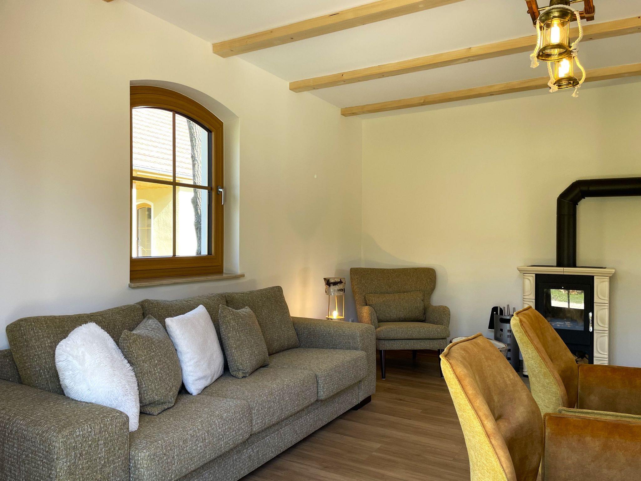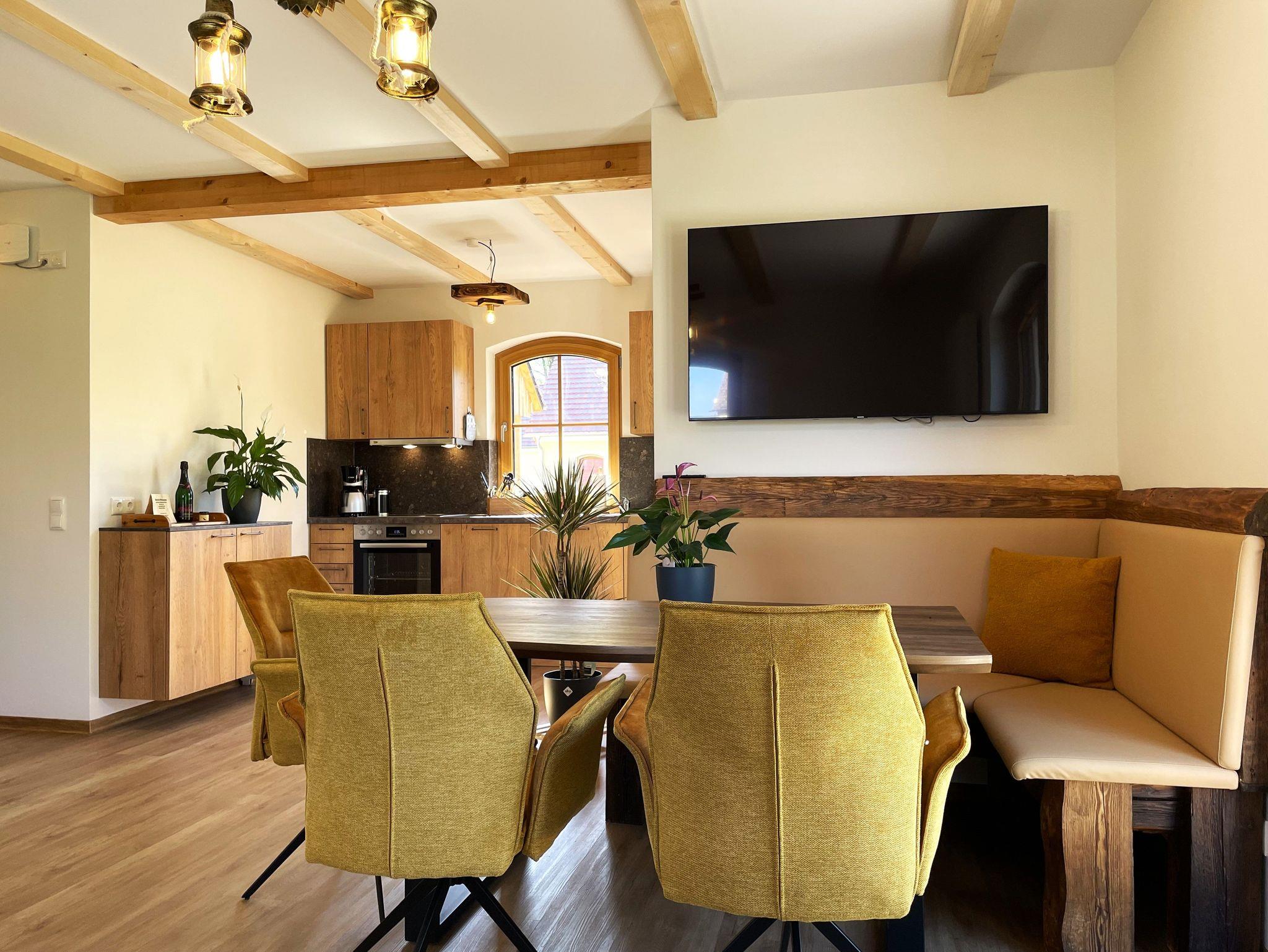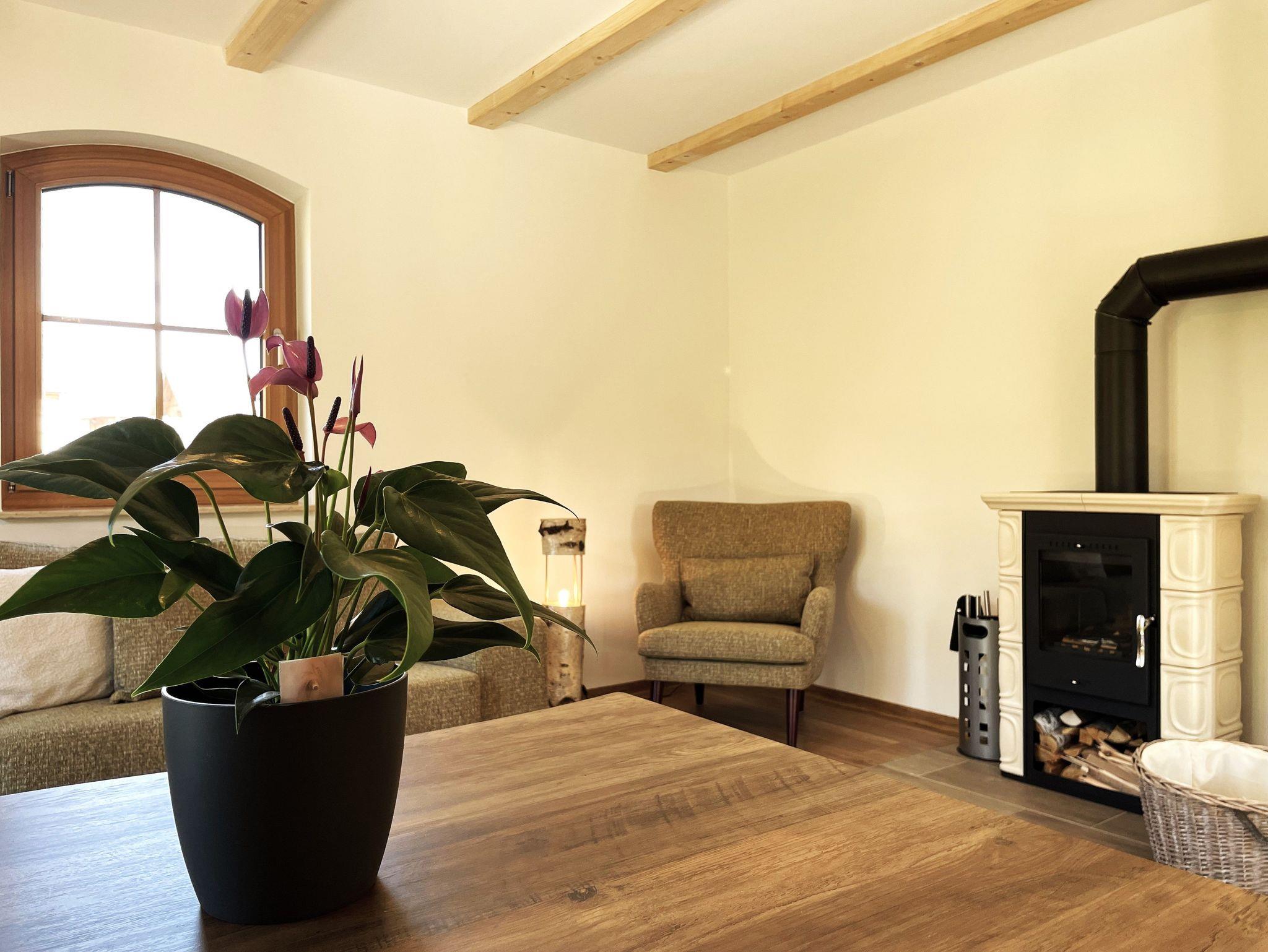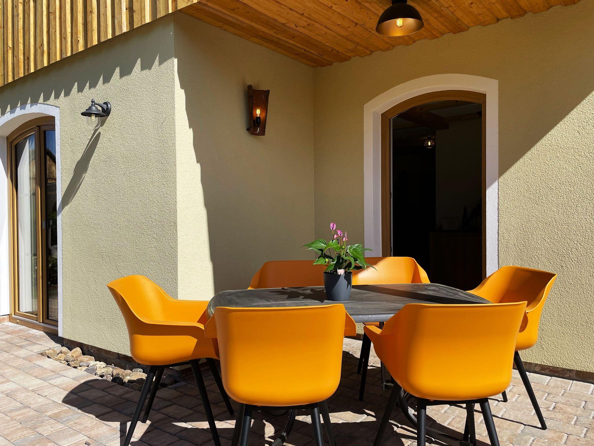 Von der Terrasse aus gelangt man direkt ins Freie. Die gemütlichen Terrassenmöbel laden zum Verweilen ein, sei es zum Genießen der frischen Luft, zum Essen oder einfach nur zum Entspannen. Die Terrasse ist der ideale Ort, um die ländliche Ruhe zu erleben und die Schönheit der Natur zu spüren.