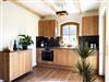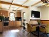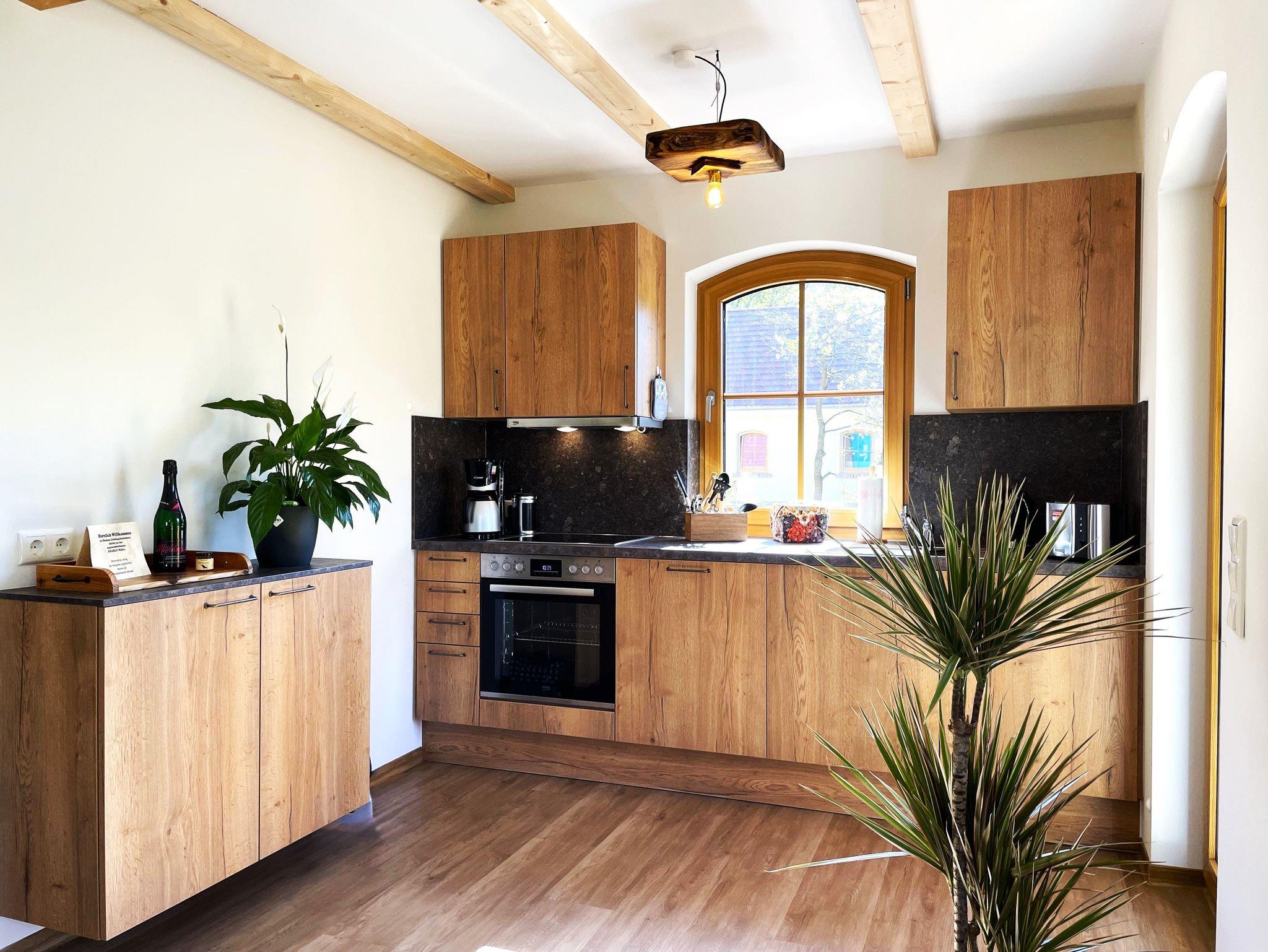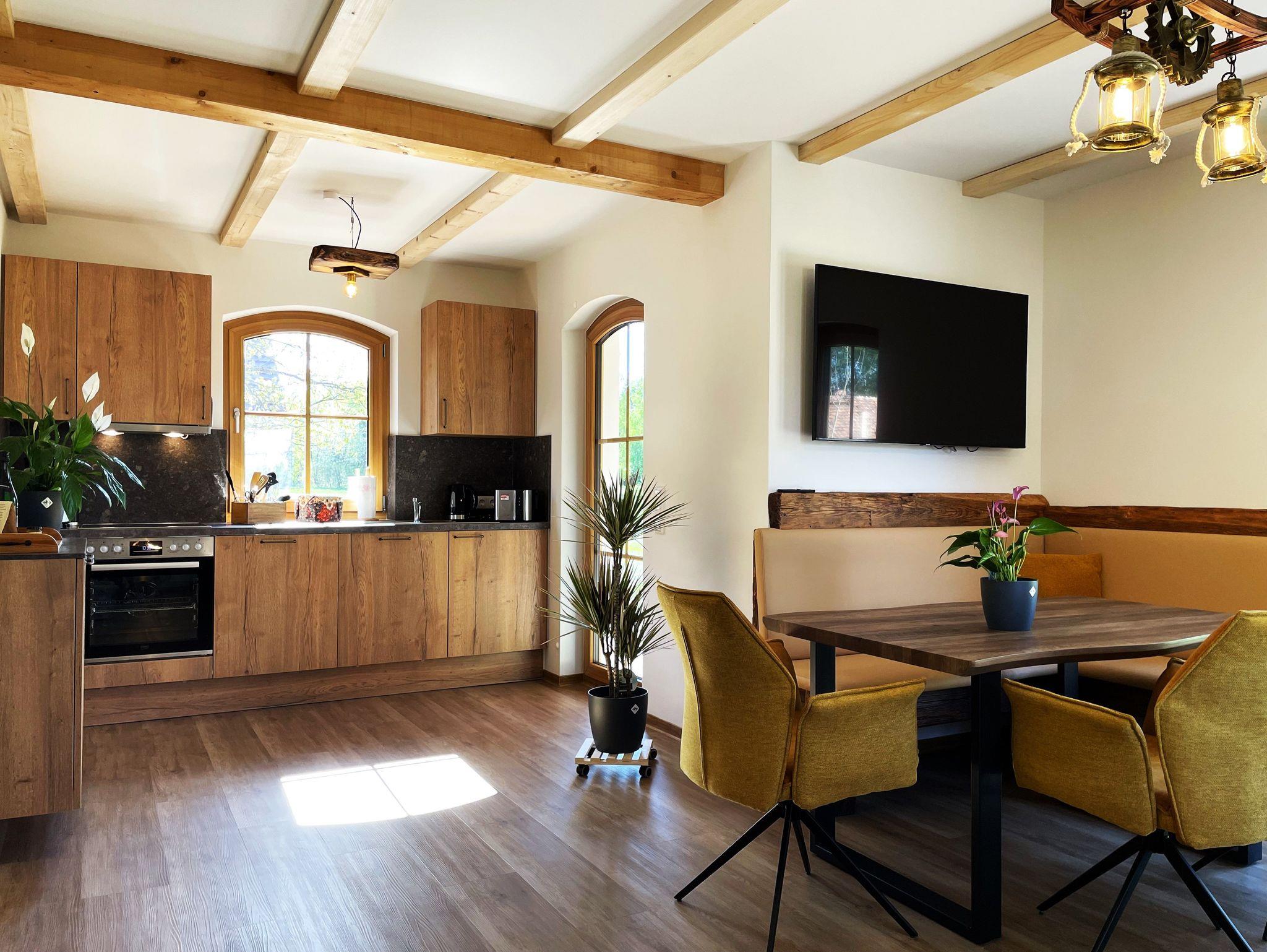 Im Herzen des Hauses befindet sich der großzügige Wohnbereich mit einer offenen Küche. Die in warmen Holztönen gehaltene Einbauküche ist mit modernen Geräten - Backofen, Kühlschrank mit Gefrierfach, Geschirrspüler, Kaffeemaschine, Toaster und Wasserkocher - ausgestattet und lädt zum gemeinsamen Kochen, Spielen und Fernsehen ein. Ein gemütliches Sofa und eine Essecke bieten den Gästen die Möglichkeit, ihre Mahlzeiten in einer harmonischen Atmosphäre zu genießen.
