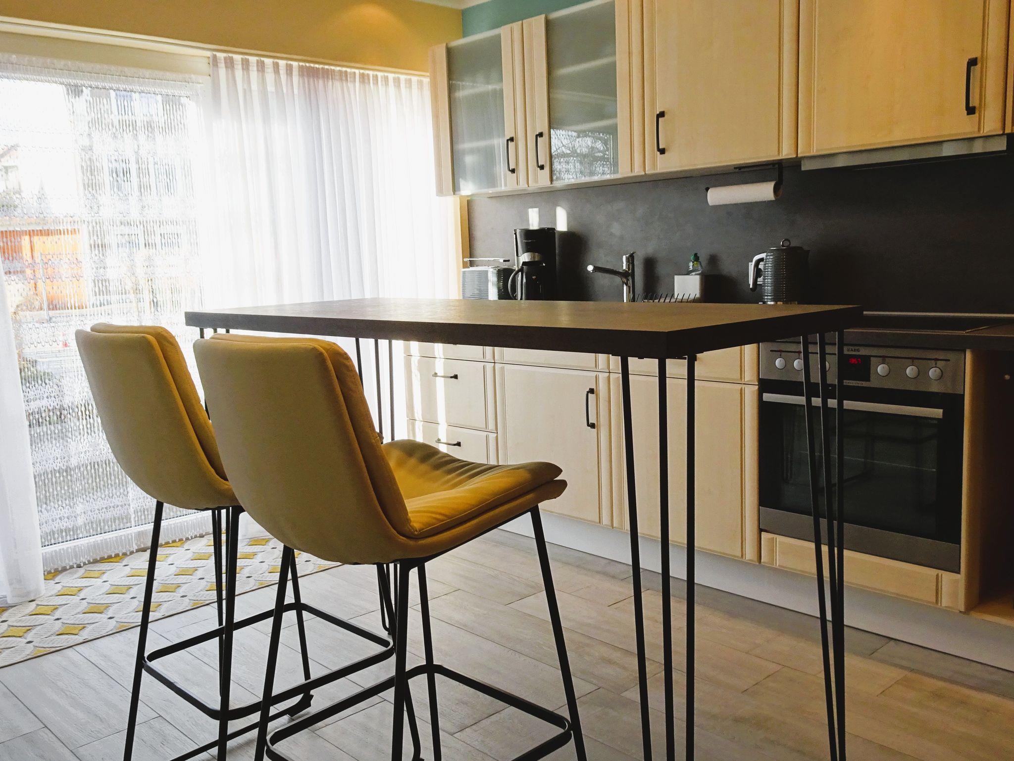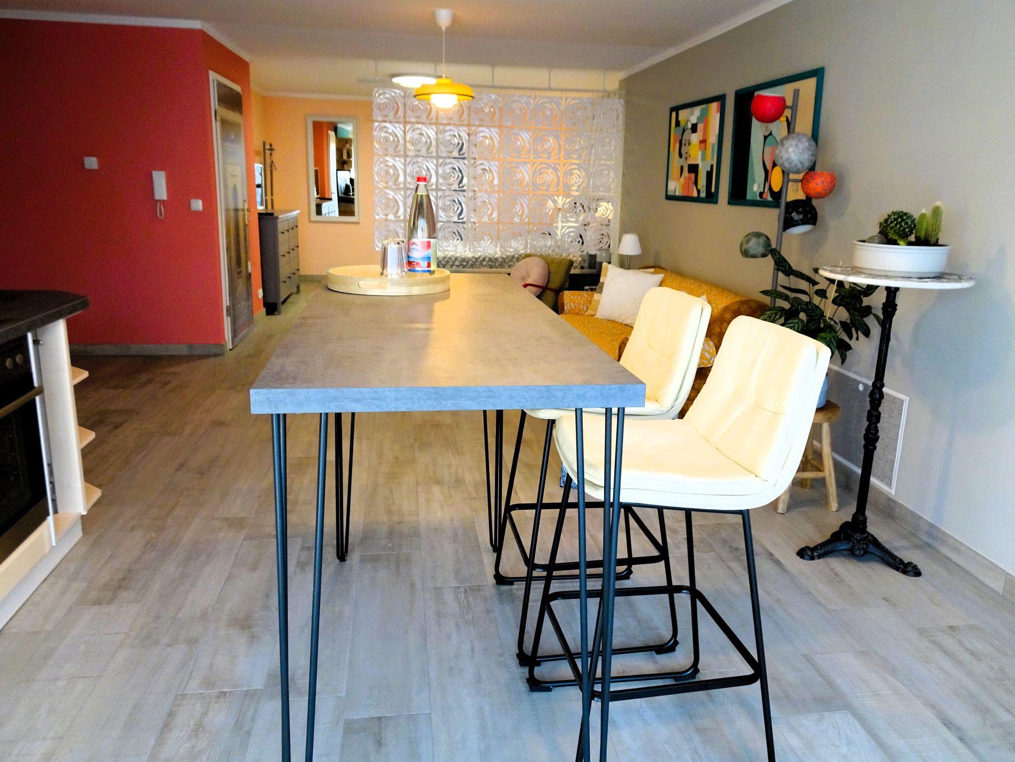 Der offene Wohn- und Essbereich ist mit einem gemütlichen Sofa, einem kleinen Couchtisch, einem bequemen Sessel und modernen Sitzelementen ausgestattet. Hier treffen Retro und Moderne aufeinander und die Atmosphäre lädt zum Verweilen ein. Die Mahlzeiten nimmt man am hohen Bartisch in den offenen Küchen ein, die mit Kühlschrank, Backofen, Geschirrspüler, Kaffeemaschine, Wasserkocher und Mikrowelle ausgestattet ist.