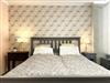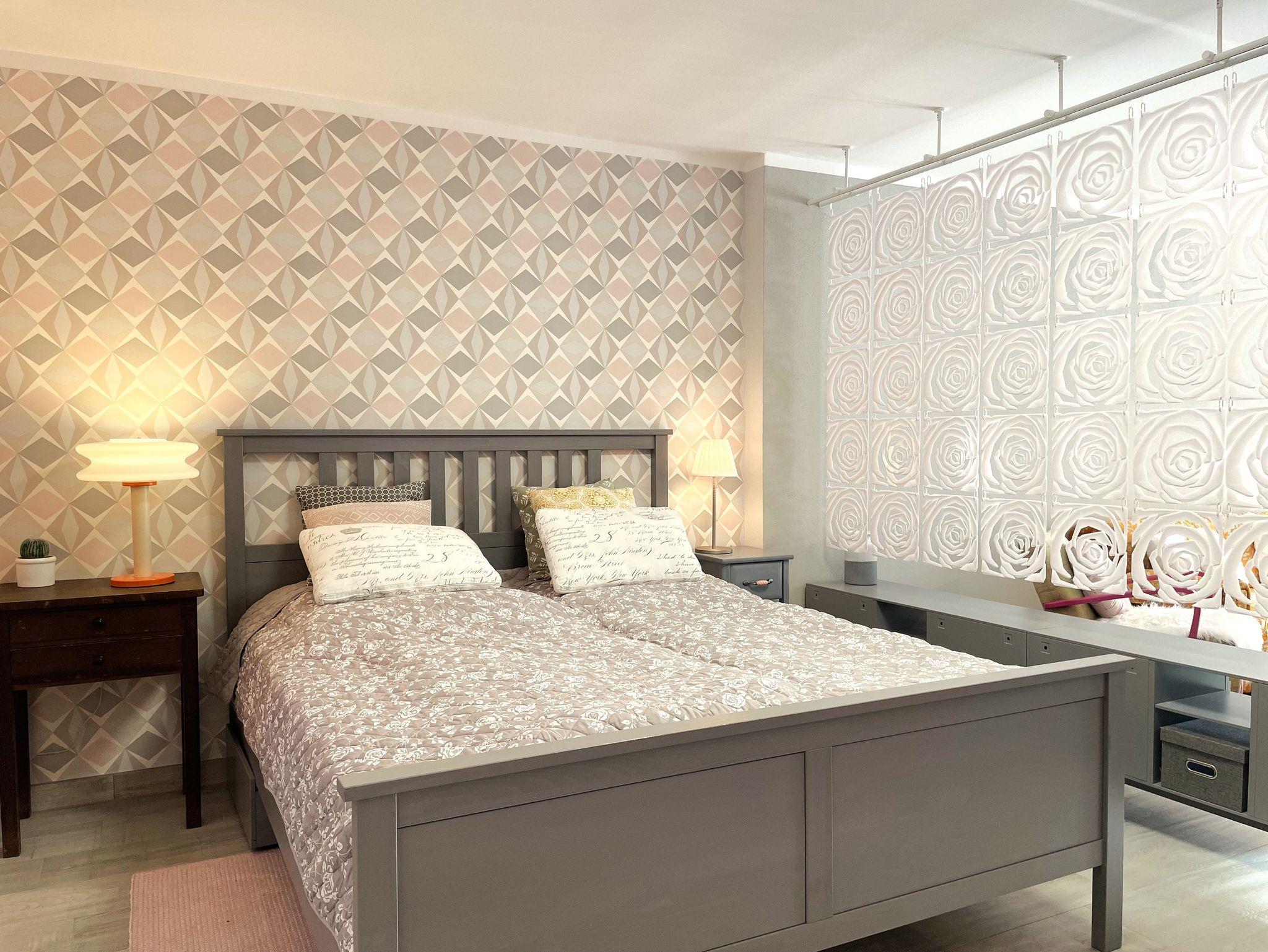 Ein Doppelbett (160 x 200 cm) befindet sich im räumlich abgeteilten Schlafbereich; ebenso ein Smart-TV.