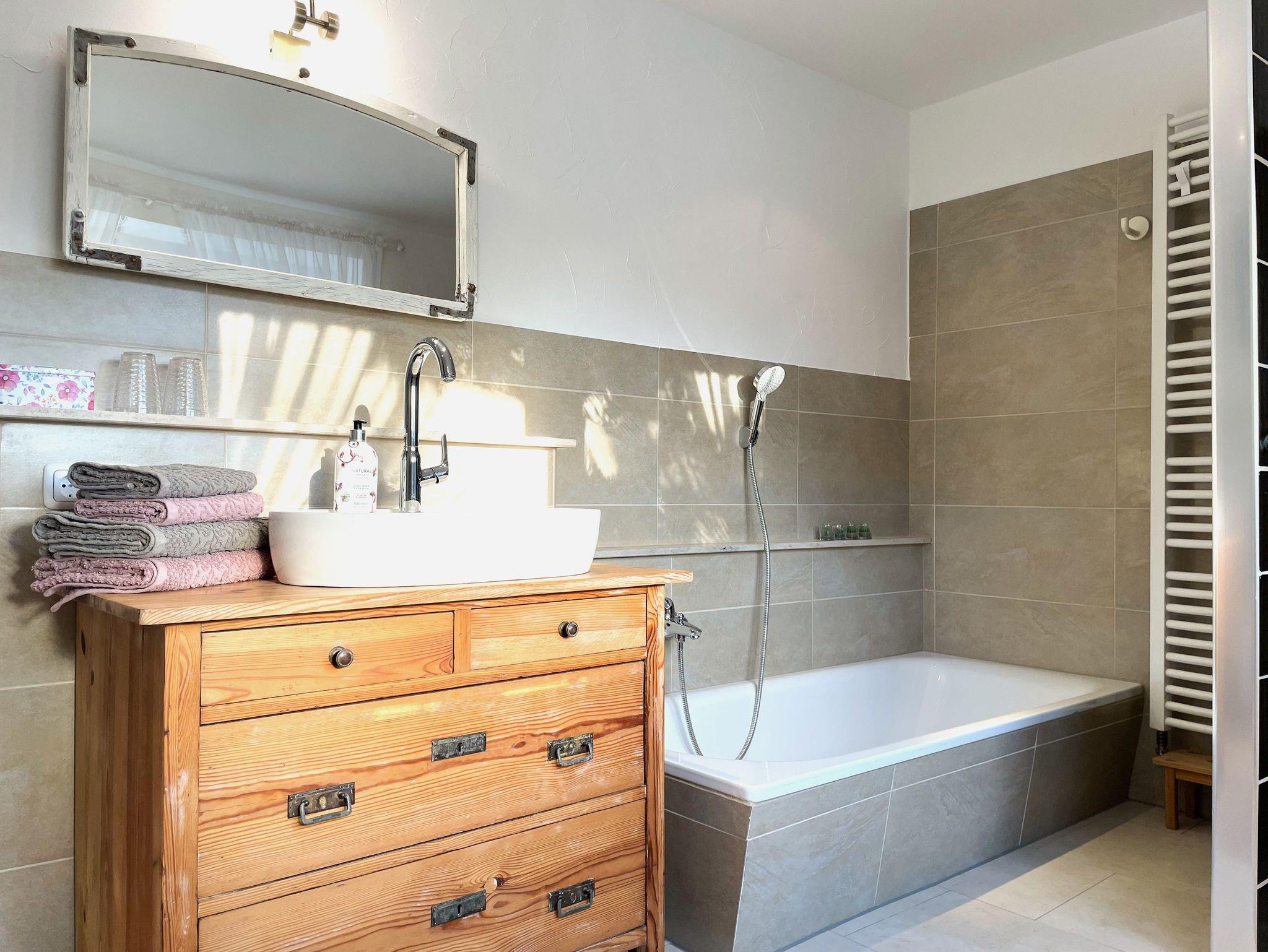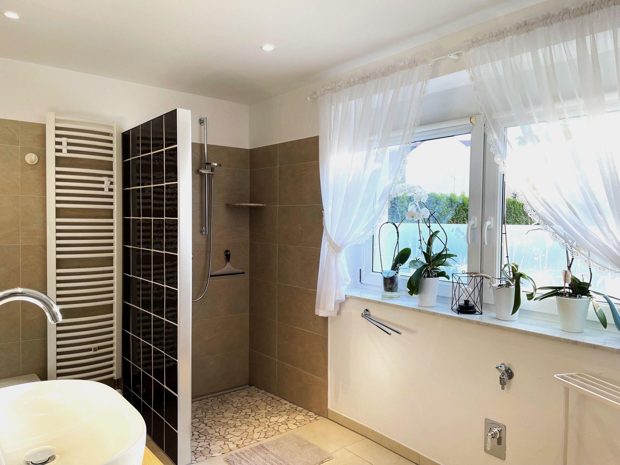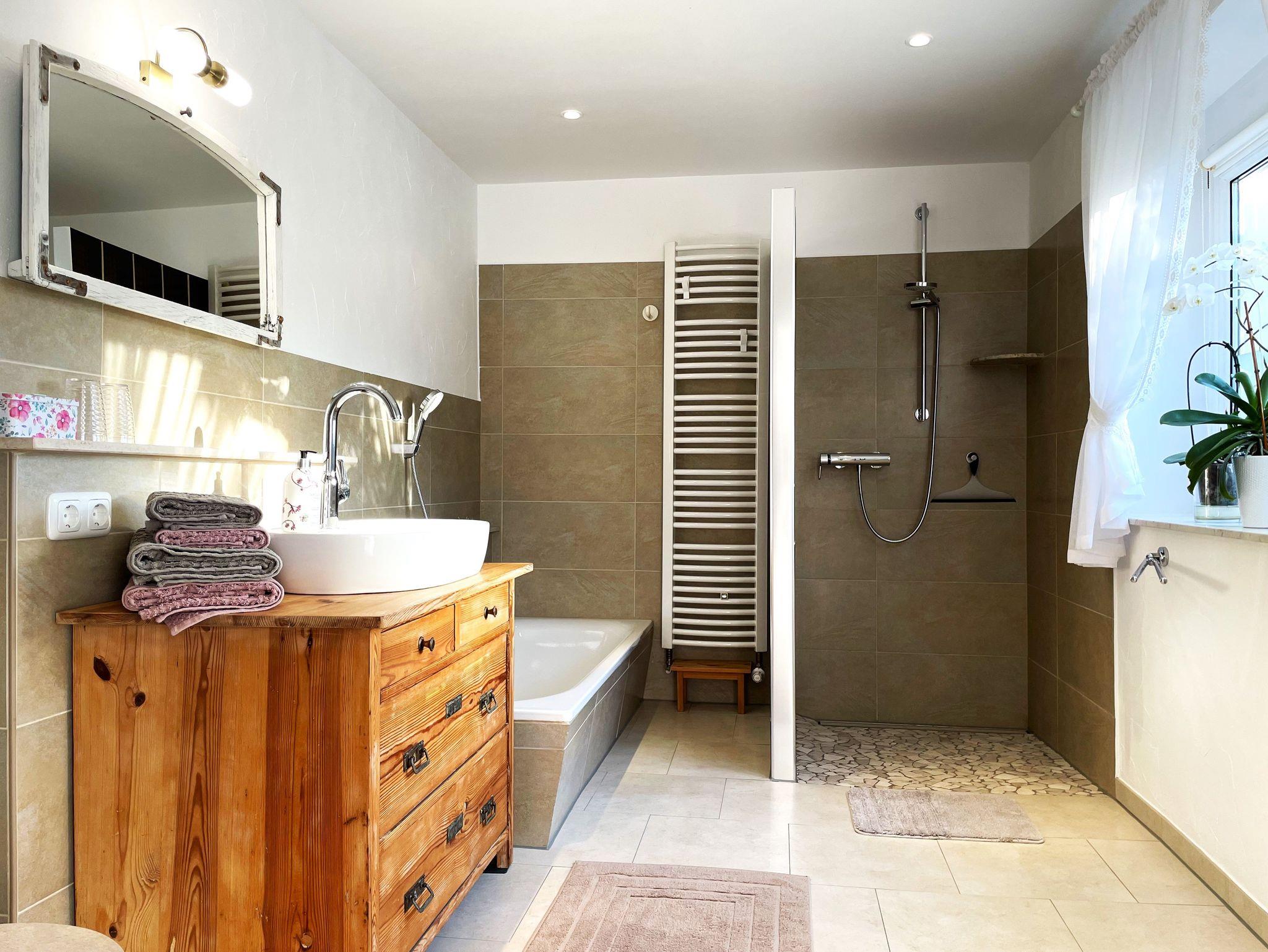 Das Badezimmer verfügt über eine bodengleiche Dusche und eine Badewanne. Annehmlichkeiten wie Haartrockner, Toilettenpapier und Handtücher sind vorhanden.