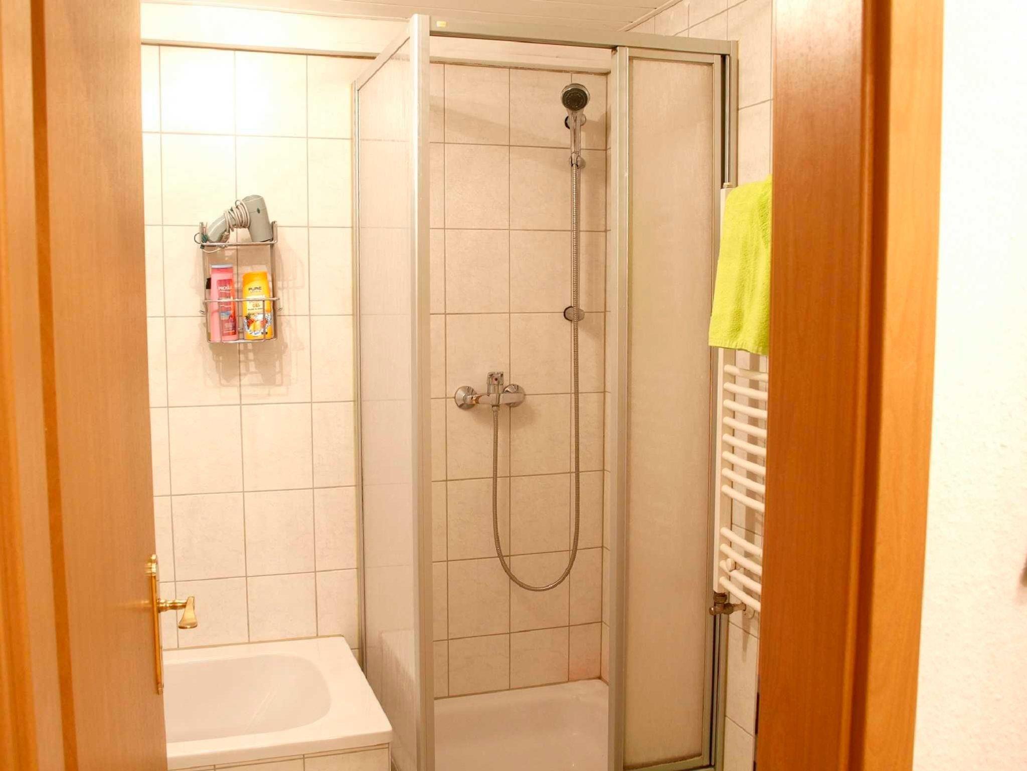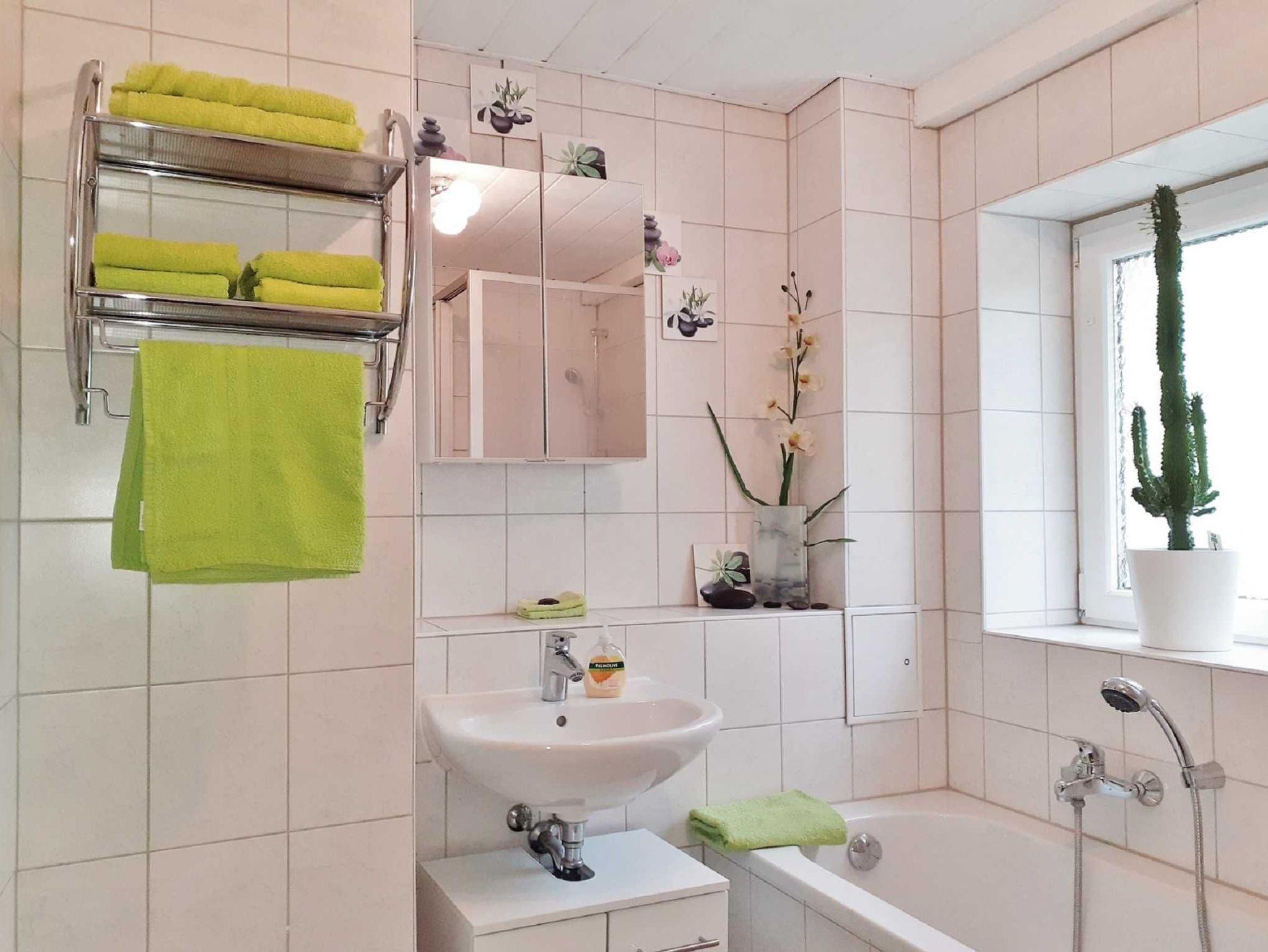 Das Bad ist mit einer Badewanne sowie einer Dusche und WC ausgestattet. Im Beckenschrank finden Gäste Reinigungsmittel zur Verwendung. Ein Spiegelschrank, Badehandtücher, Gästetücher, Fön und eine Antirutschmatte für die Dusche liegen den Gäste bereit.