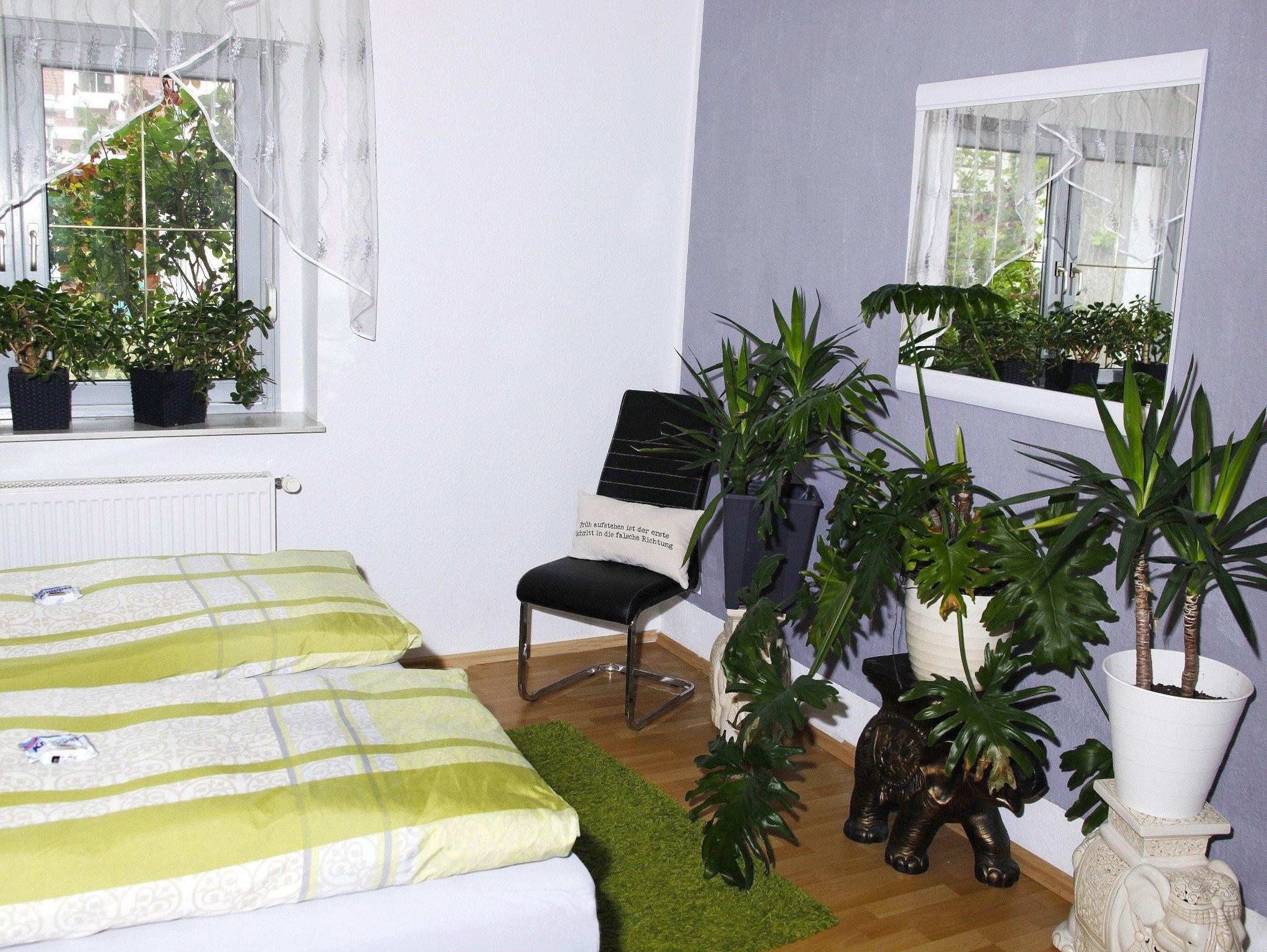 Im Schlafzimmer finden Gäste ein Doppelbett mit Nachtschränken, eine Kommode mit Spiegel sowie einen Ganzkörperspiegel, 2 helle Stühle und ein grüner Teppich rundet das Zimmer ab. Auch die grau glitzernde tapezierte Wand dient für ein gemütliches Wohlbefinden.