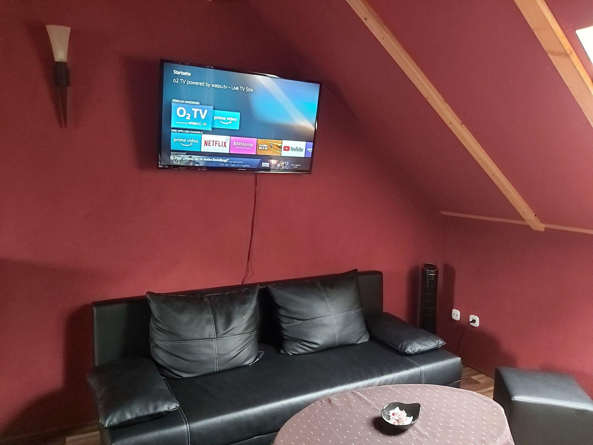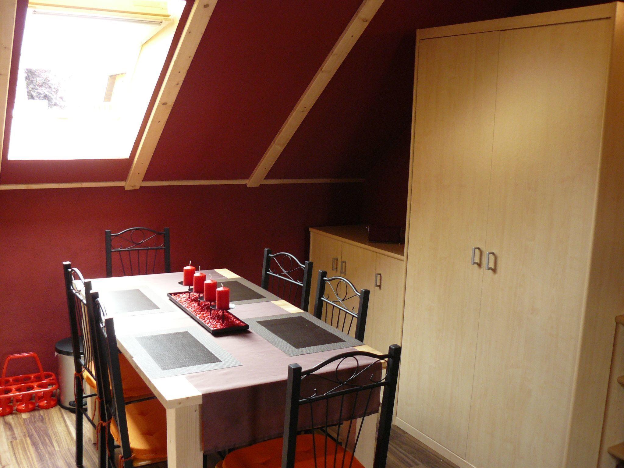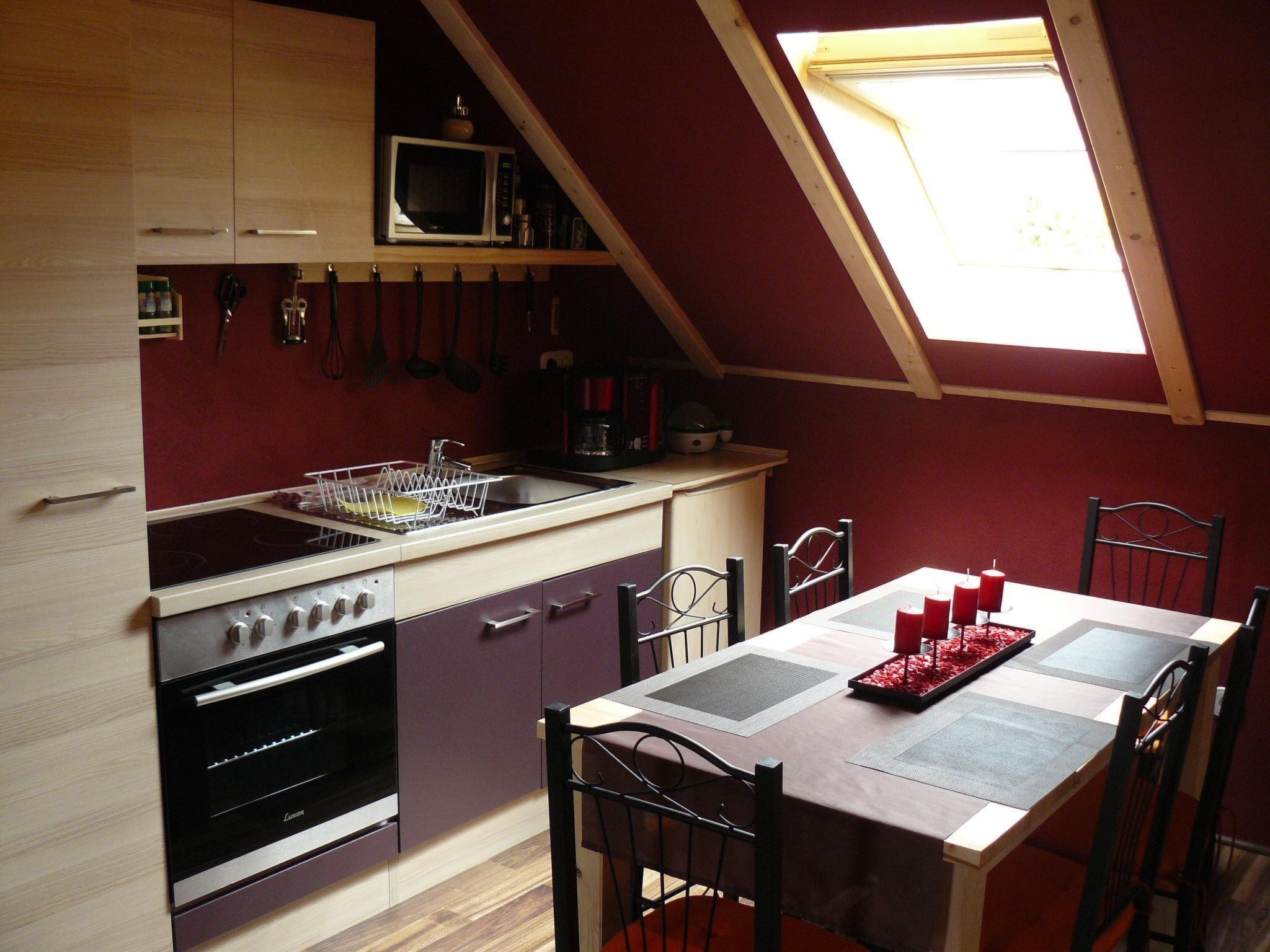 This holiday home is a romantic gallery flat, approx. 55m² living space, in its own detached house, without direct neighbours, with a separate entrance. The house was newly built in 2013 according to the latest energy-efficient standards / allergy guidelines. It offers a tasteful, upscale interior design in the living room, kitchen, bathroom and gallery. In addition to conventional heating, underfloor heating, a fireplace and infrared heating, the gallery flat naturally also has a hot water connection. The open-plan layout, with gallery, is suitable for up to four people. On the ground floor there is a garage and storage space for bicycles, while the living areas are located on the first and second floors. The walls are a traditional Franconian red colour, interspersed with natural wood from the region. The open-plan living and sleeping area on the first floor offers seating with a sofa bed, 1.40 x 2.00 m, fireplace, O2 TV streaming with Alexxa control, DVD player, laptop with high-speed Internet connection/WLAN and stereo music system. The kitchenette is equipped with a dining area, a hot-air electric cooker with grill function, a ceramic hob, a microwave, a fridge and a breakfast centre. The kitchen equipment and the dining area are designed for six people. In the living room there is a four-poster bed, 1.80 x 2.00 metres. In the gallery there is a further sleeping area, 1.80 x 2.00 m, which can be reached via a ladder in the open-plan layout. The living and sleeping area of the gallery flat can be air-conditioned. The heated bathroom is equipped with an XL shower, toilet and washbasin, as well as an eco washing machine. The floor is of course tiled. Bed linen and towels are provided. This is a house where smoking is not permitted. Enjoy the romantic atmosphere of this unique holiday home.