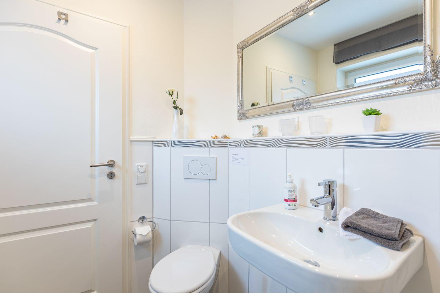 Das Haus verfügt über ein Badezimmer im Erdgeschoss mit Dusche, WC, Waschbecken, Spiegel, Fenster und Warmwasser sowie zusätzlich über ein separates Gäste-WC im Obergeschoss. Die Waschmaschine im Badezimmer steht Ihnen zur alleinigen Nutzung.
