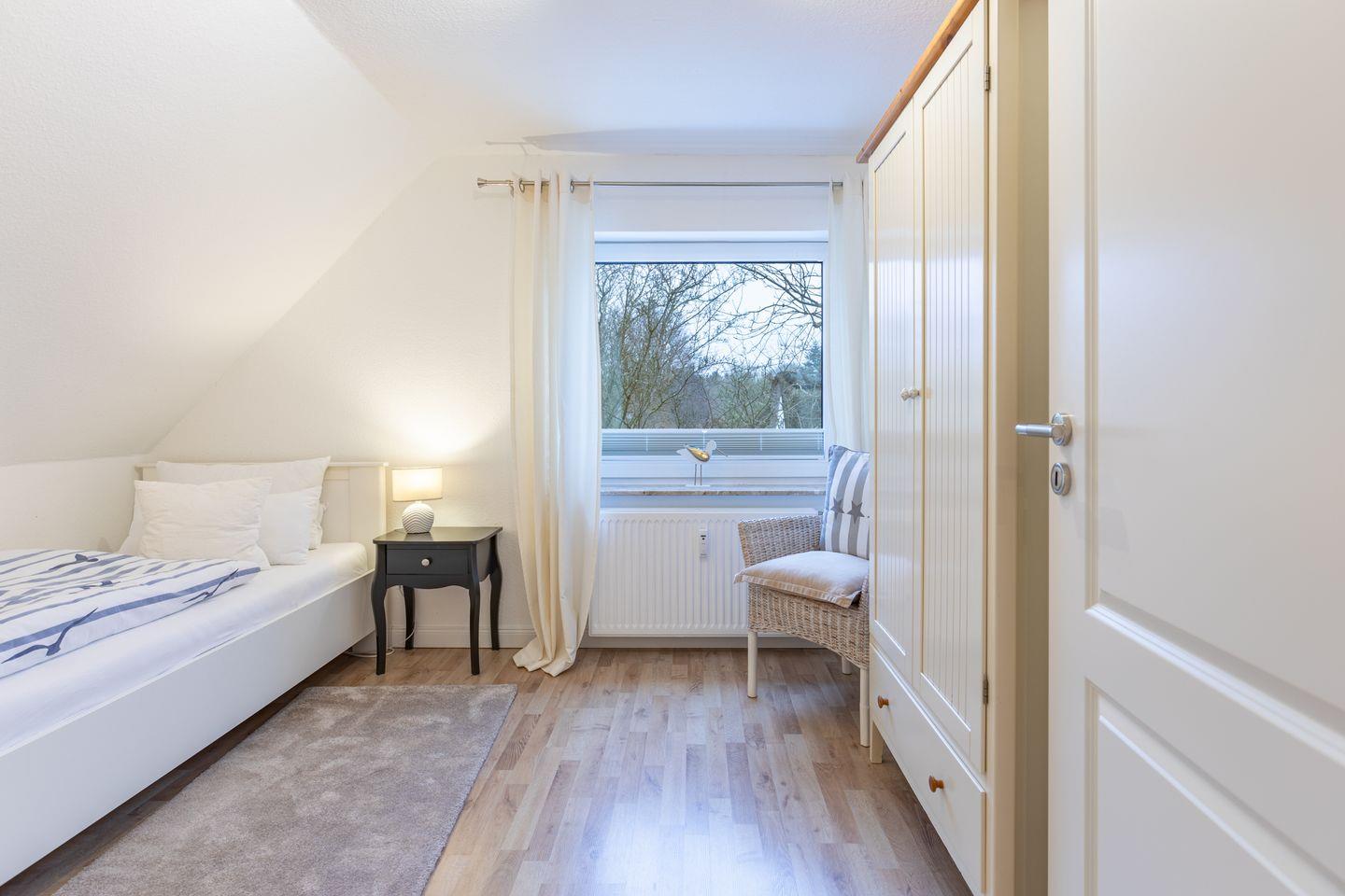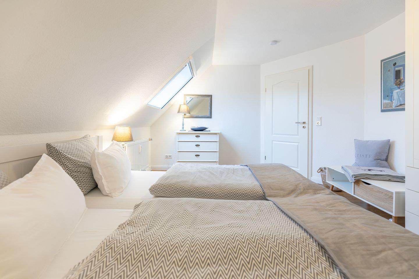 Die drei Schlafzimmer befinden sich im ersten Obergeschoss. Beide größeren Schlafzimmer sind mit einem Doppelbett mit der Größe 1,80 x 200cm ausgestattet. Das Schlafzimmer mit dem Einzelbett hat die Größe 90x200cm.