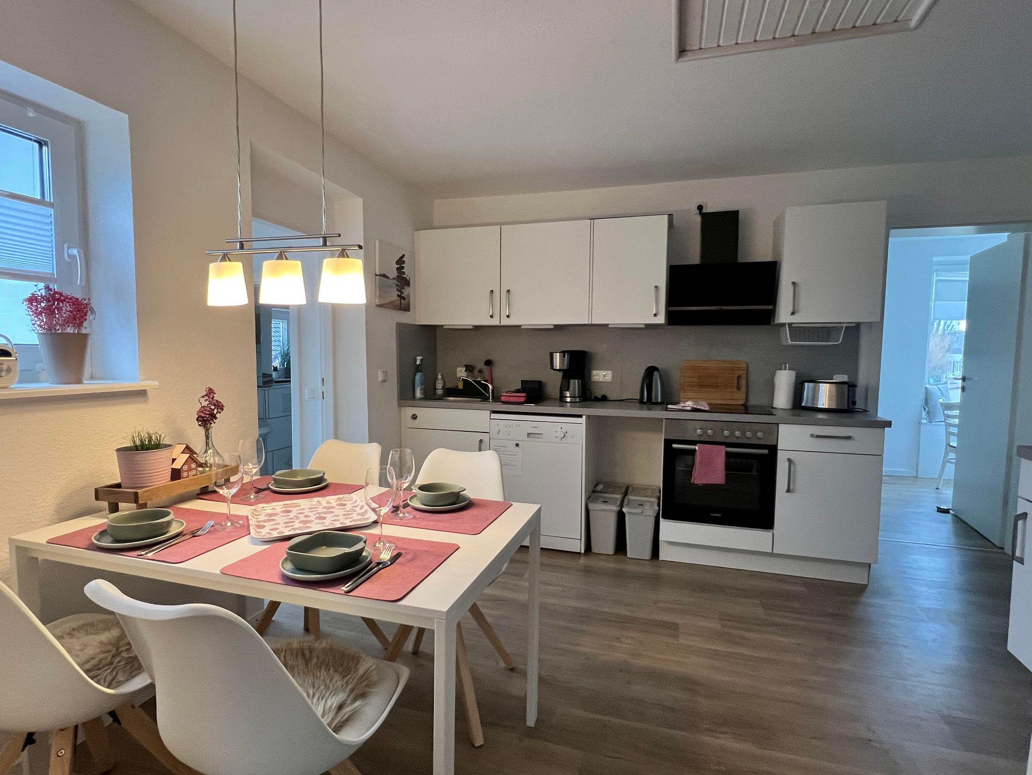 Die zentral gelegene Küche ist modern und vollständig ausgestattet mit Backofen, Ceranfeld, Geschirrspüler, Mikrowelle sowie einer großzügigen Kühl-Gefrier-Kombination. Kaffeemaschine, Toaster, Wasserkocher und modernes Geschirr sind ebenfalls vorhanden. Der Essbereich bietet Platz für vier Personen. Grundzutaten wie Salz, Zucker, Mehl, Gewürze, Essig, Öl sowie Tee und Filtertüten stellen wir Ihnen gerne bereit.