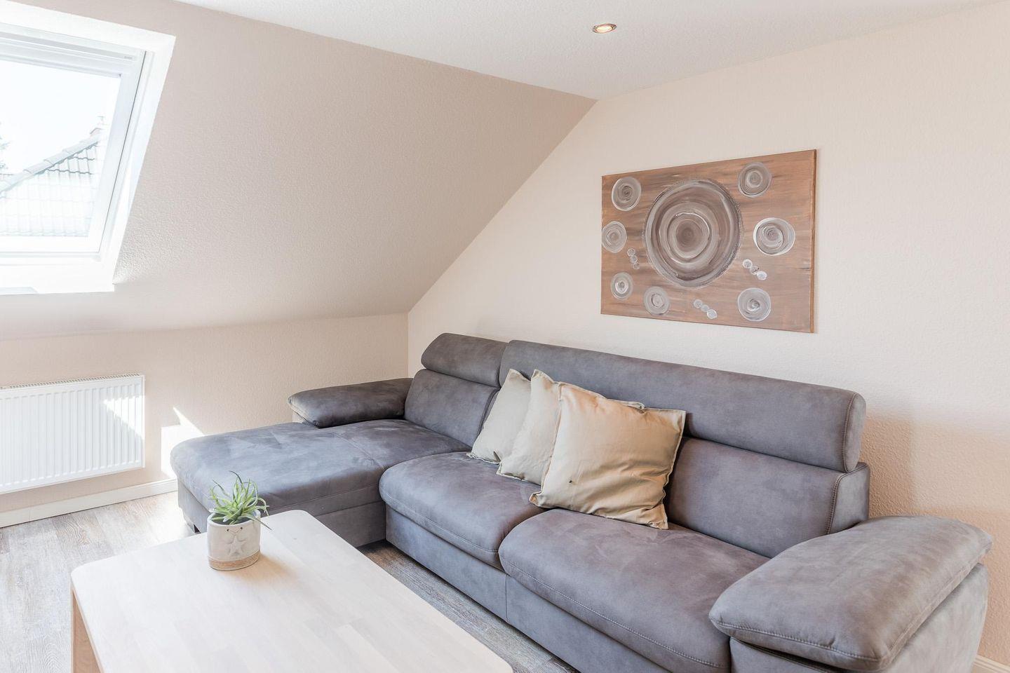 Schobüller Seestern" - Hochwertiges Apartment in Husum-Schobüll, 3 Zimmer für 4 Erwachsene und 1 Kind, 2018 renoviert, moderne Küche, geschützter Balkon mit Gartenblick, Fußläufig zur Badestelle, kostenfreies WLAN, allergikerfreundlich, kostenlose Erstausstattung an Bettwäsche und Handtüchern, Parkplatz am Haus.