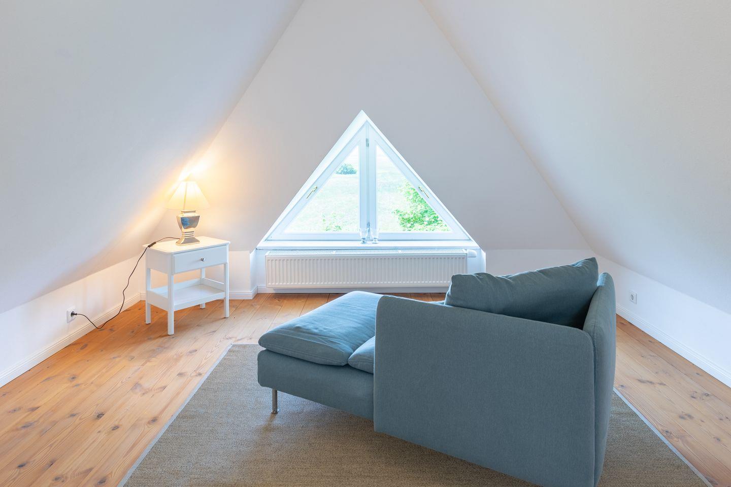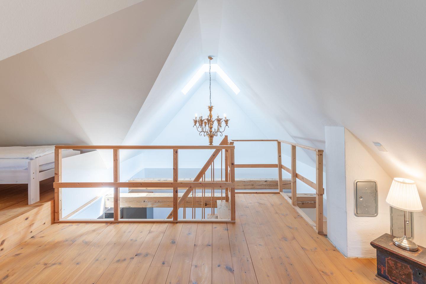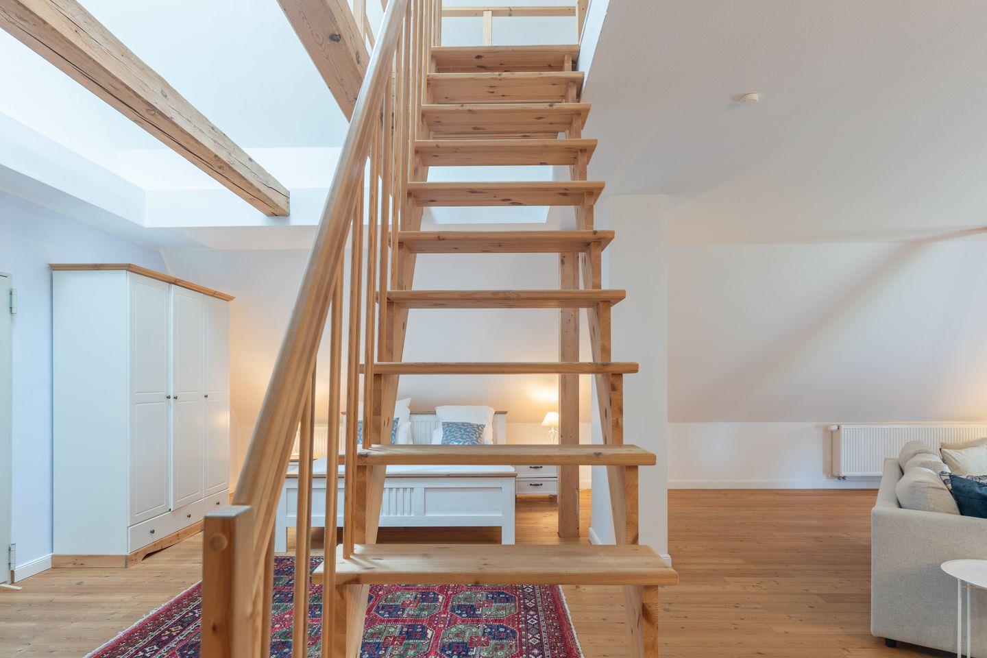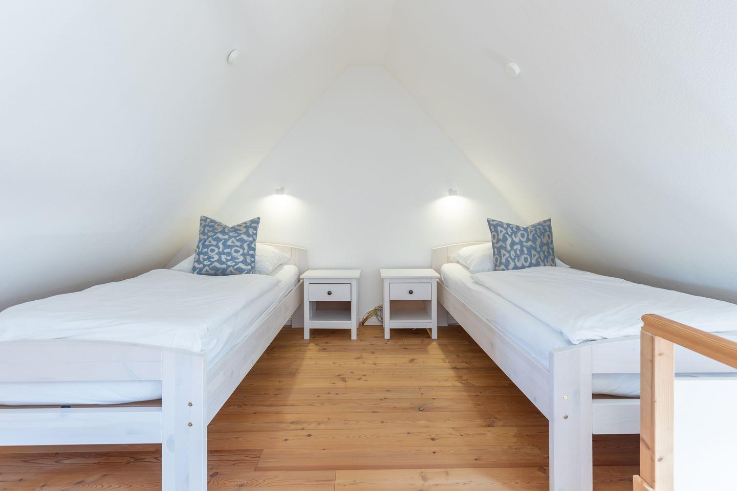 Über eine offene Holztreppe gelangen Sie zur Empore mit zwei Einzelbetten und Ihrer Lieblings-Chill-Ecke mit Blick auf die Nordsee.