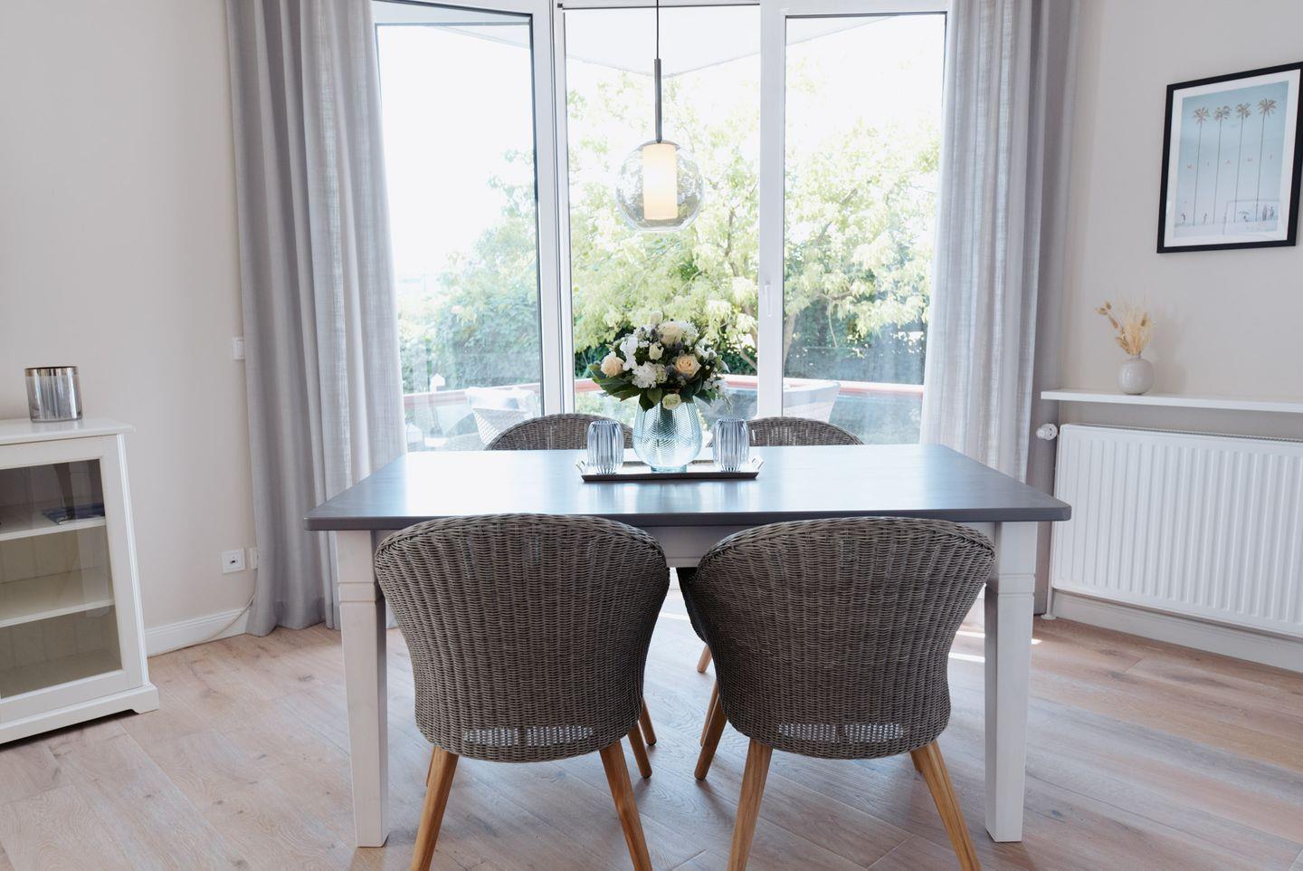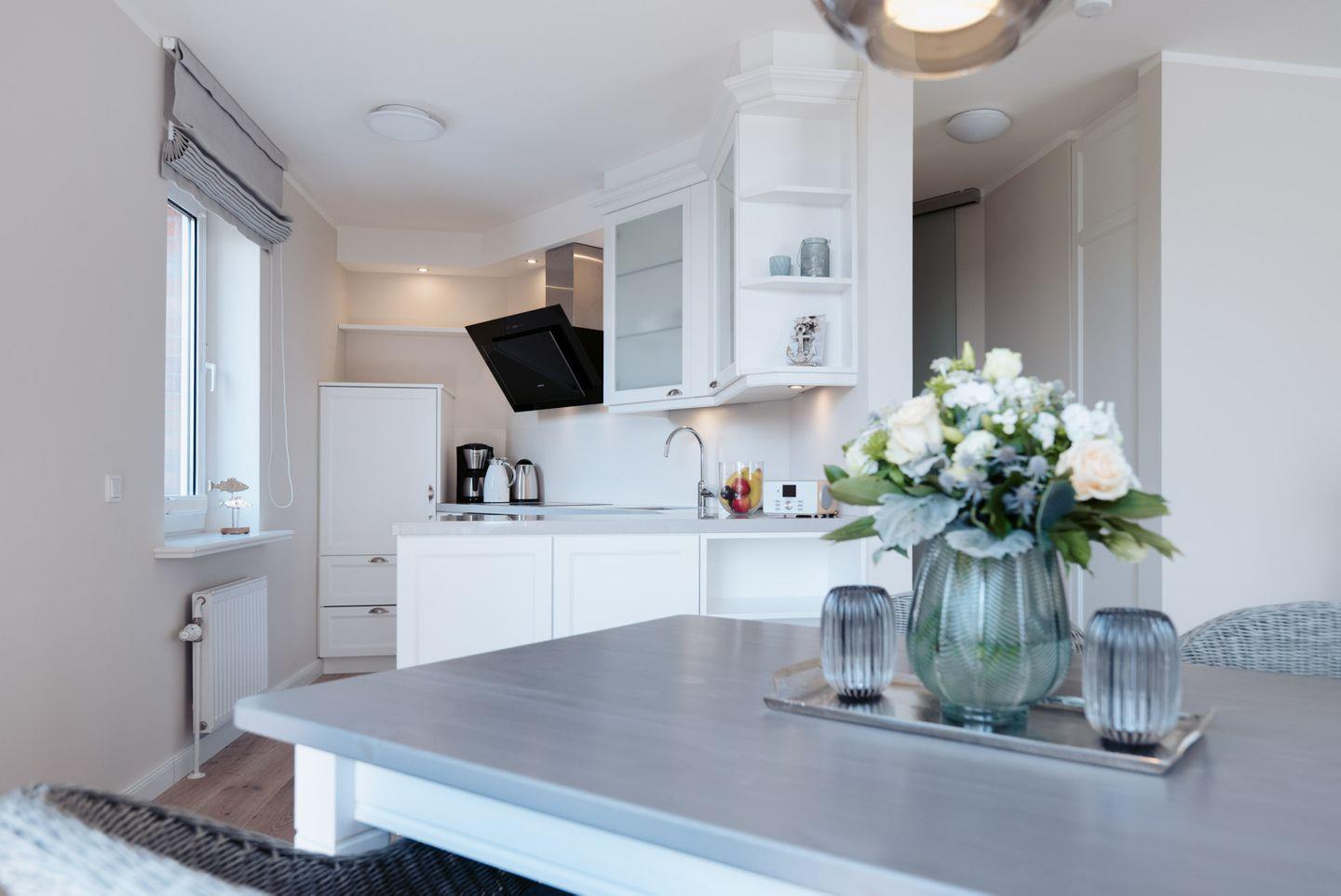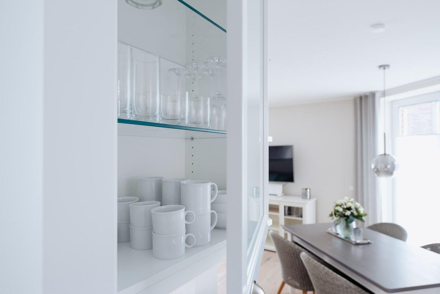 Die Ferienwohnung Anker Mal am Hafen Husum bietet Ihnen auf 53 m² komfortablen Raum für einen erholsamen Aufenthalt inmitten der charmanten Stadt Husum. Die Unterkunft befindet sich in Hochparterre-Lage und ist damit bequem zugänglich. Mit insgesamt zwei Zimmern, darunter ein separates Schlafzimmer, eignet sich die Wohnung ideal für bis zu zwei Personen. Besonders schätzen Gäste den offenen Grundriss, der die moderne Küche harmonisch in das Wohnzimmer integriert. Die Küche ist voll ausgestattet und bietet unter anderem einen Ceranherd, Backofen, Kühlschrank mit Gefrierfach, Spülmaschine, Kaffeemaschine, Wasserkocher, Toaster sowie ausreichend Geschirr und Besteck. Ein Essbereich mit großem Esstisch lädt dazu ein, gemeinsam zu speisen oder den Tag bei einer Tasse Kaffee zu beginnen.