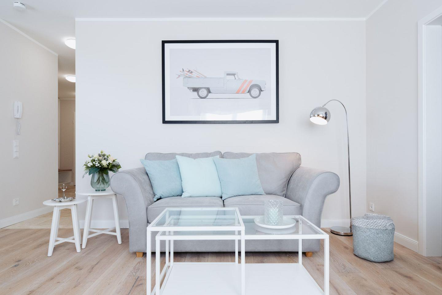 Das gemütliche Wohnzimmer verfügt über eine komfortable Sofaecke und ist mit einem Fernseher sowie einem Radio ausgestattet. Für Unterhaltung und Information sorgt kostenfreies WLAN. Alle Fenster verfügen über einen Sichtschutz, was für Privatsphäre und ein angenehmes Wohngefühl sorgt.