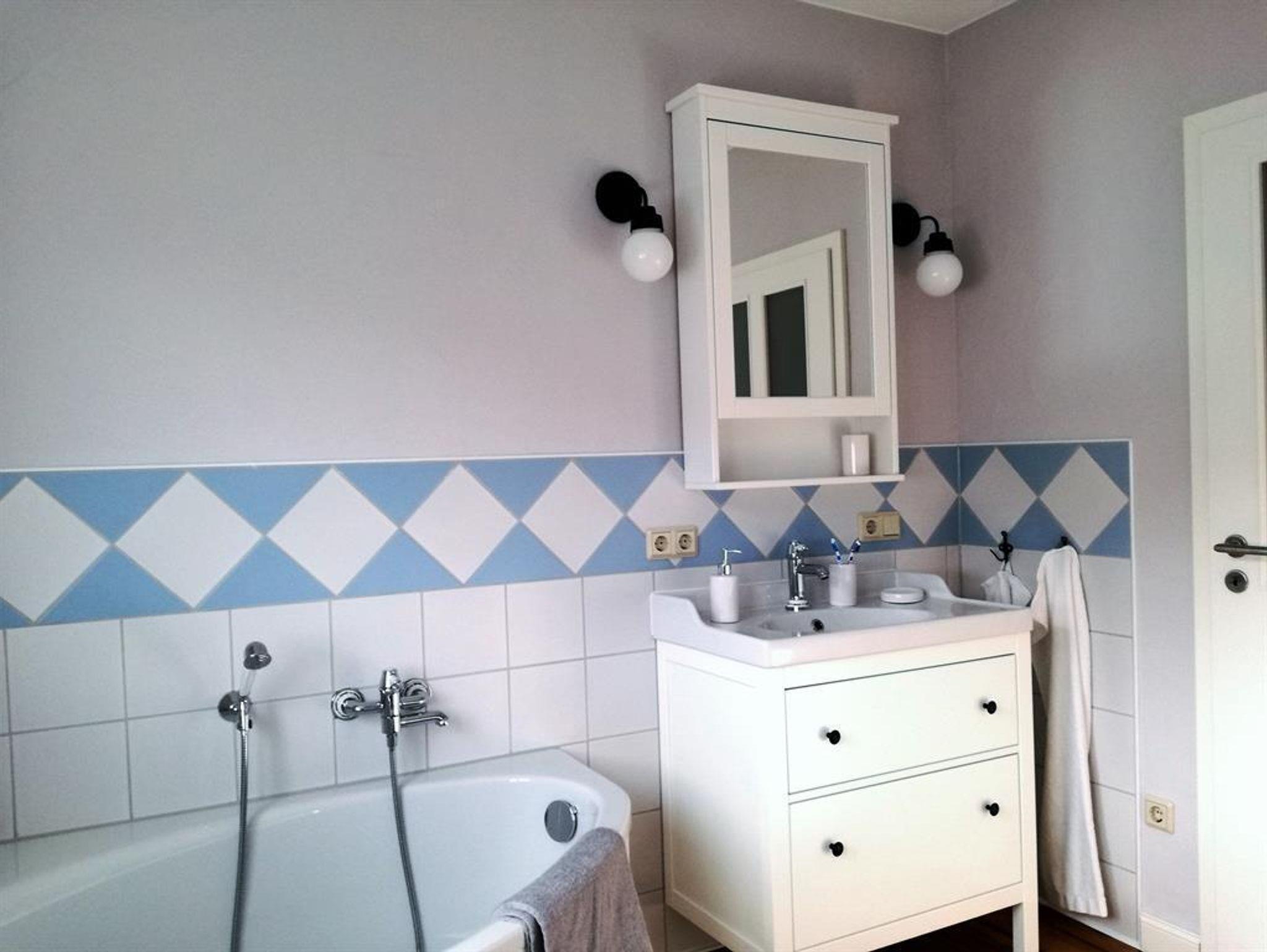 Das großzügige Badezimmer ist mit einem Waschtisch, einer Badewanne und einer großen, ebenerdig begehbaren Dusche ausgestattet. Handtücher und eine kleine Auswahl an Hygieneartikeln liegen selbstverständlich für unsere Gäste bereit.