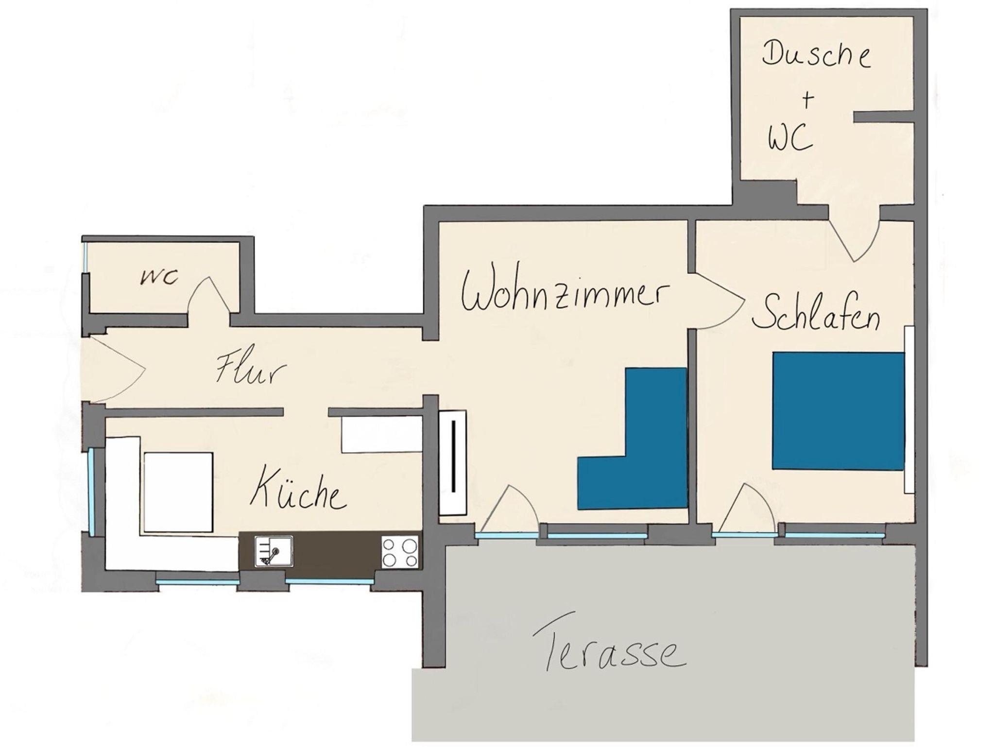 Die Ferienwohnung wurde 2024 umfassend saniert. Die Ferienwohnung hat ein großes Schlafzimmer, ein Wohnzimmer mit Schlafcouch und Fernseher mit Netflix Zugang, eine neue, komplett ausgestattete Küche mit Geschirrspüler, Kaffeemaschine, Kühlschrank, Herd und Backofen sowie ein Badezimmer mit Dusche und ein Gäste-WC.