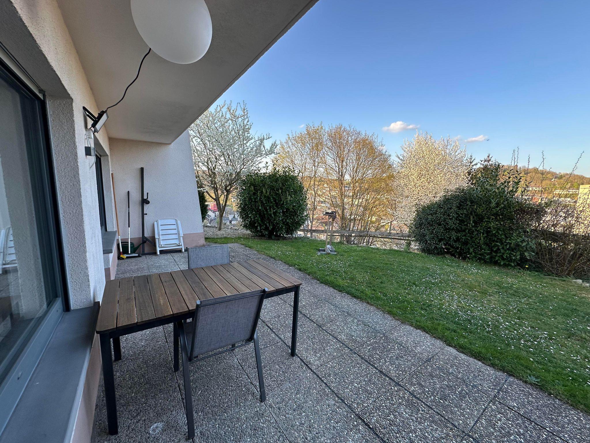 Zur Ferienwohnung gehört ein kleiner Garten mit überdachter Terrasse.