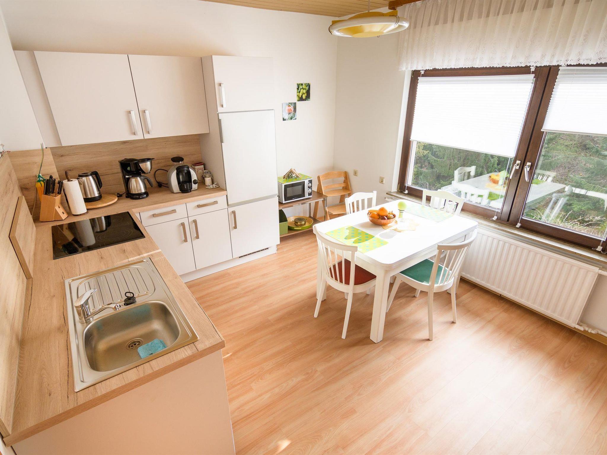 Die Wohnküche ist mit Spülmaschine, Kühlschrank mit Gefrierfach, Wasserkocher,