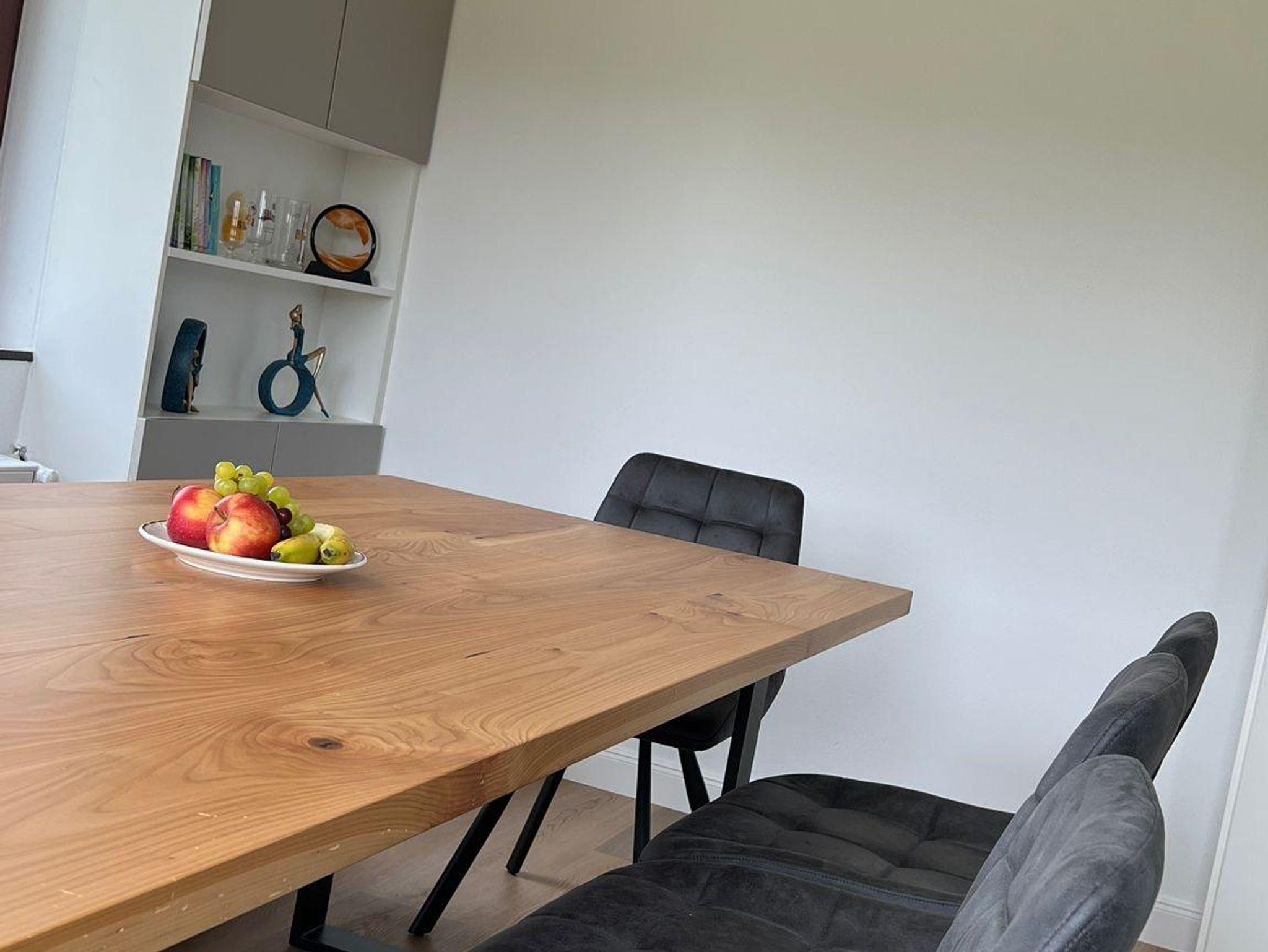 einer modernen Küche und einem angrenzenden Esszimmer (großer Tisch, mit