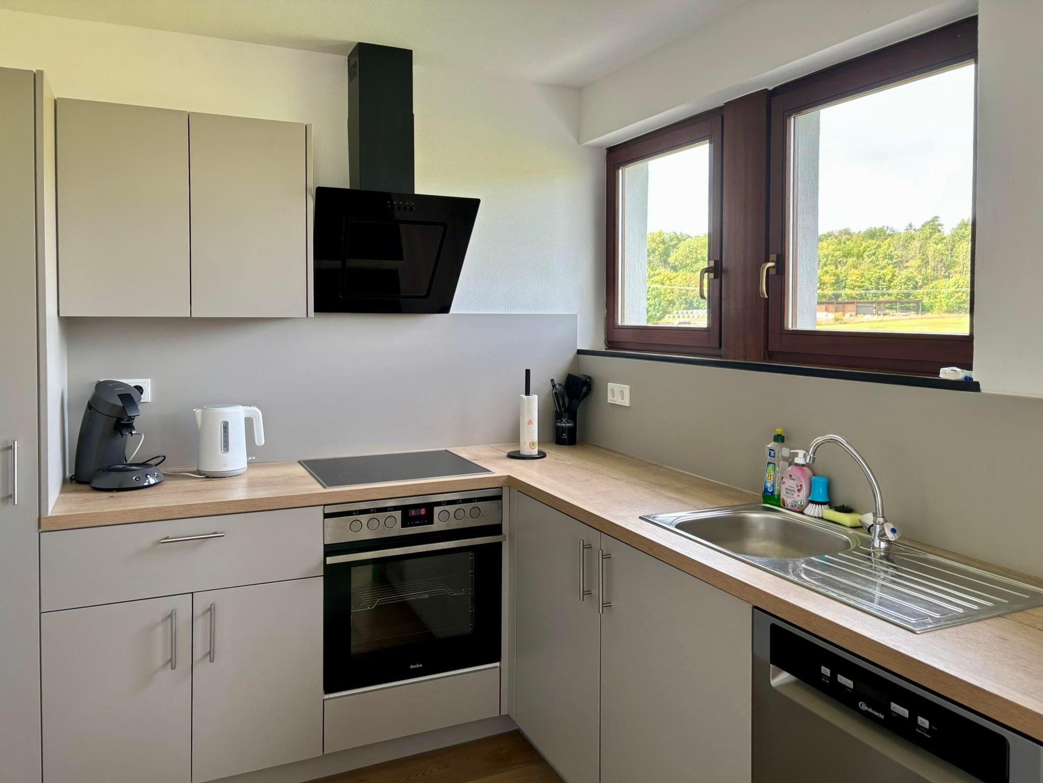 Die Küche ist ausgestattet mit Backofen, Kochfeld, Spülmaschine, großem Kühlschrank und kleinem Gefrierschrank