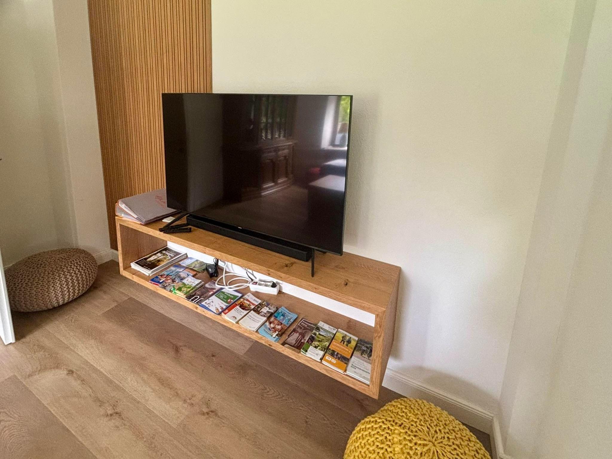 Im EG befindet sich ein Wohnzimmer mit einem großen Fernseher.