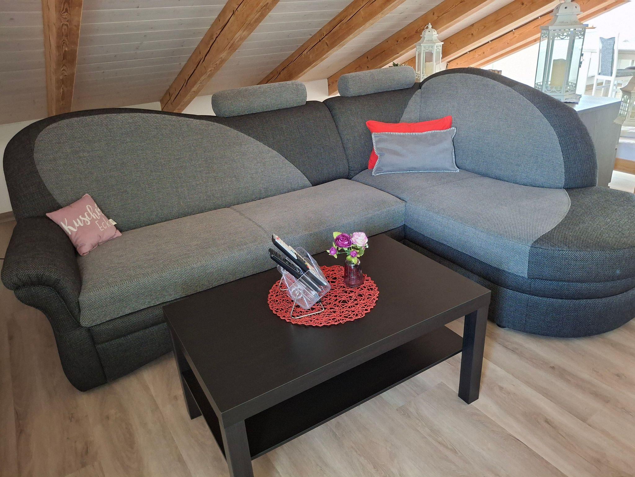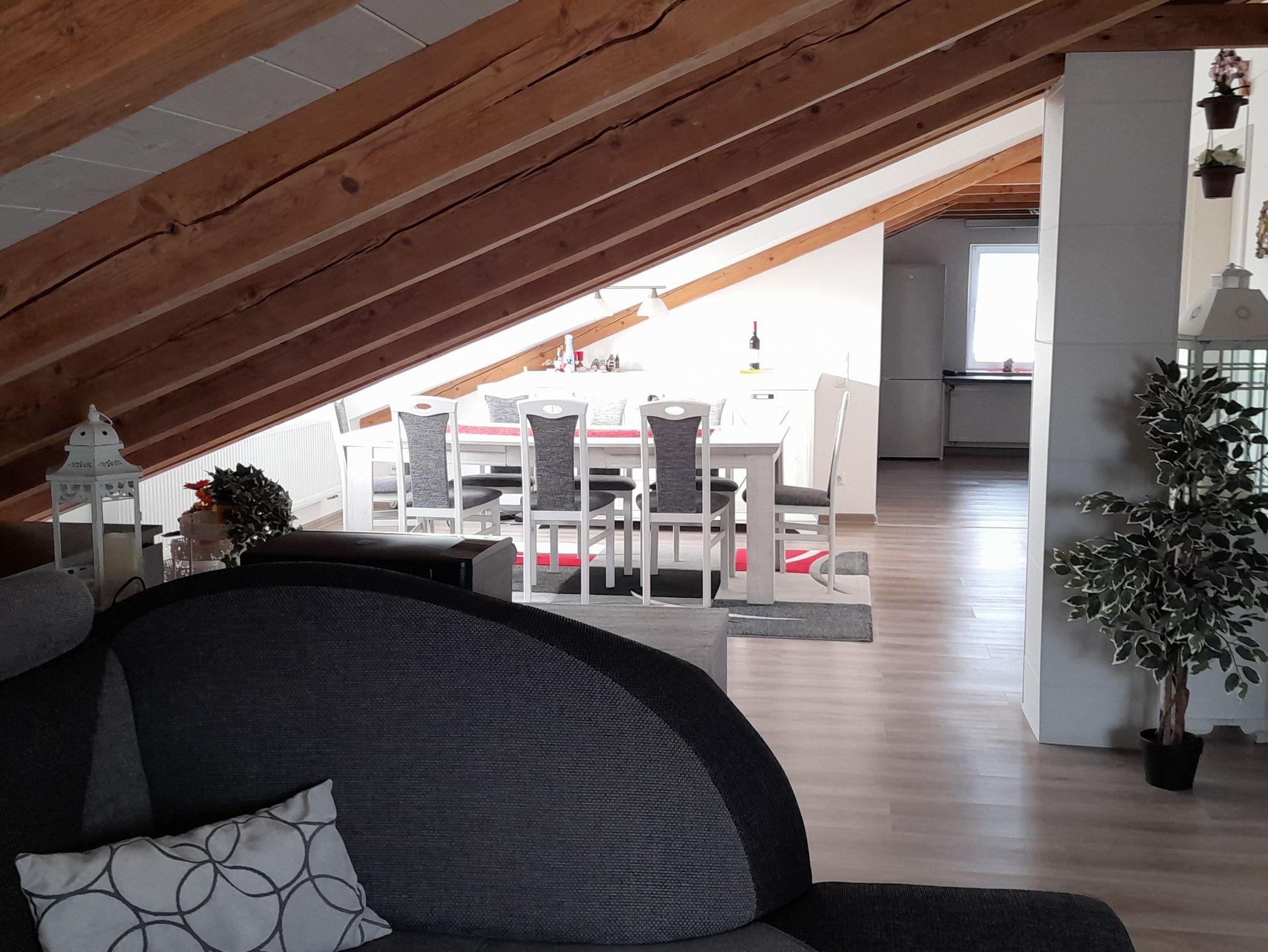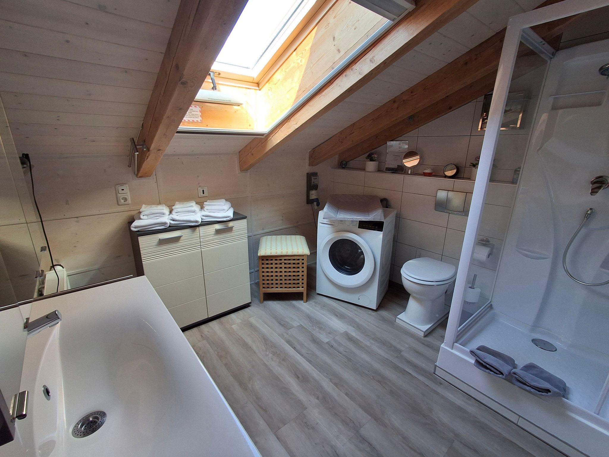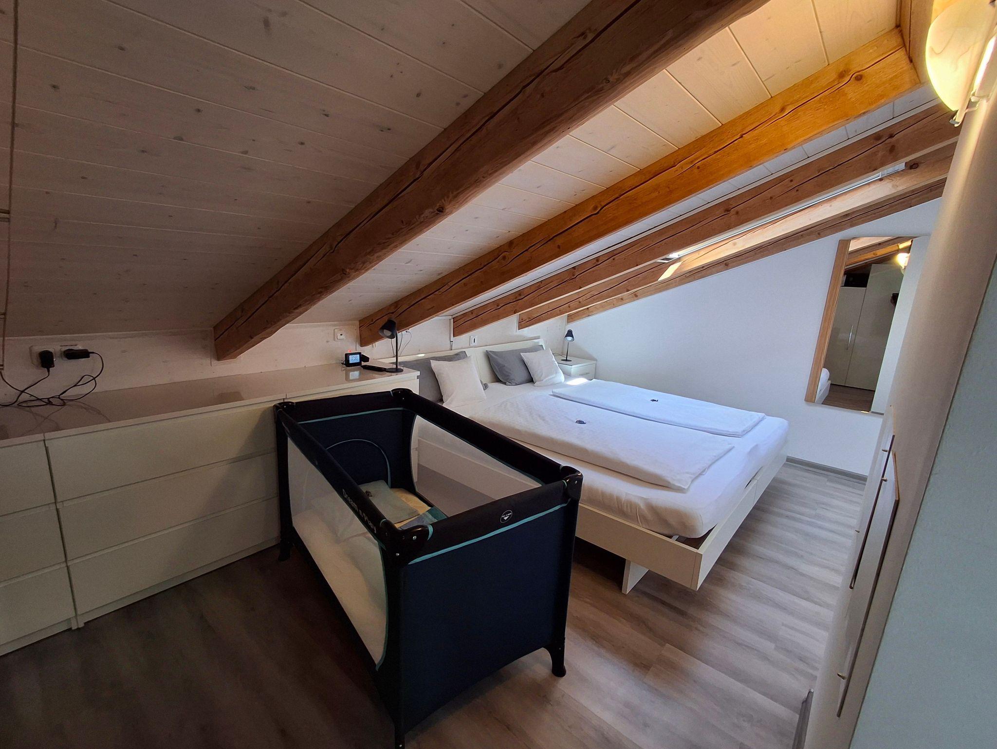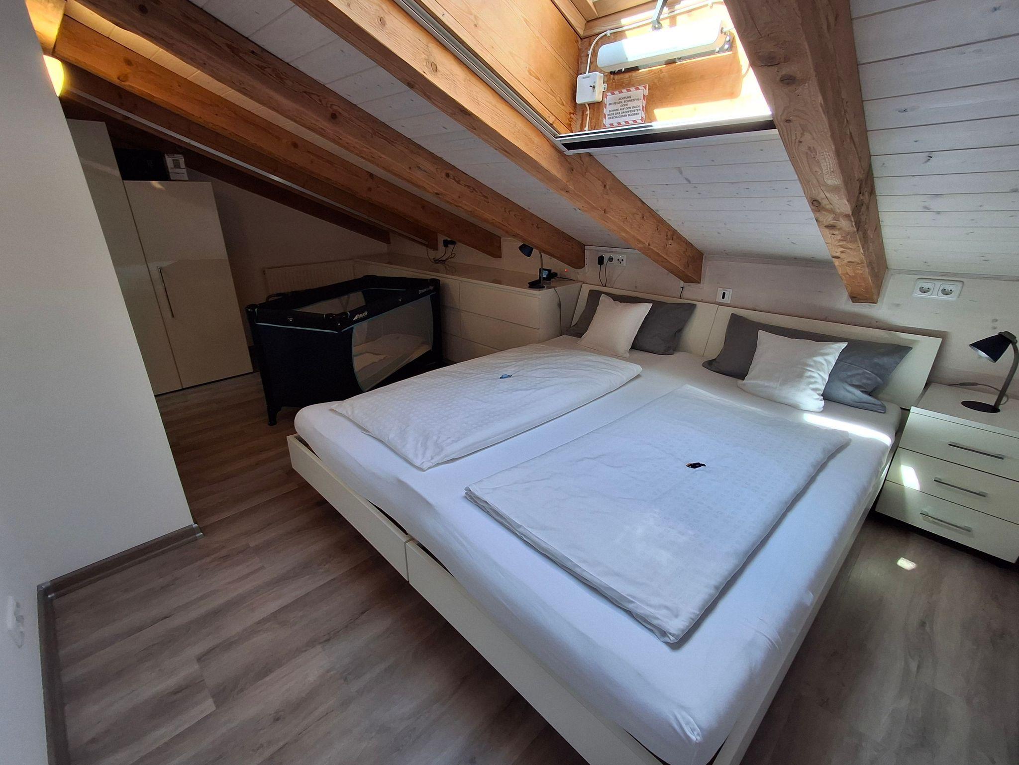 zusätzliches Gästebett 90 x 200 cm), einer voll ausgestatteten Küche, einem Schlafzimmer mit Doppelbett (kann in 2 Einzelbetten umfunktioniert werden), einem Tageslichtbad mit Dusche (80x80x190 cm), WC und einer Waschmaschine. WLAN, 2 TVs und Radio stehen ebenfalls zu ihrer Verfügung. Für Kleinkinder stehen ein Babybett, Hochstuhl und Wickelauflage bereit. Die Wohnung besteht aus Dachschrägen mit einem Sichtdachstuhl und Dachgauben. Die gesamte Wohnung ist mit einem Vinylboden ausgelegt und in jedem Zimmer sind die Fenster mit elektrischen Rollläden ausgestattet.