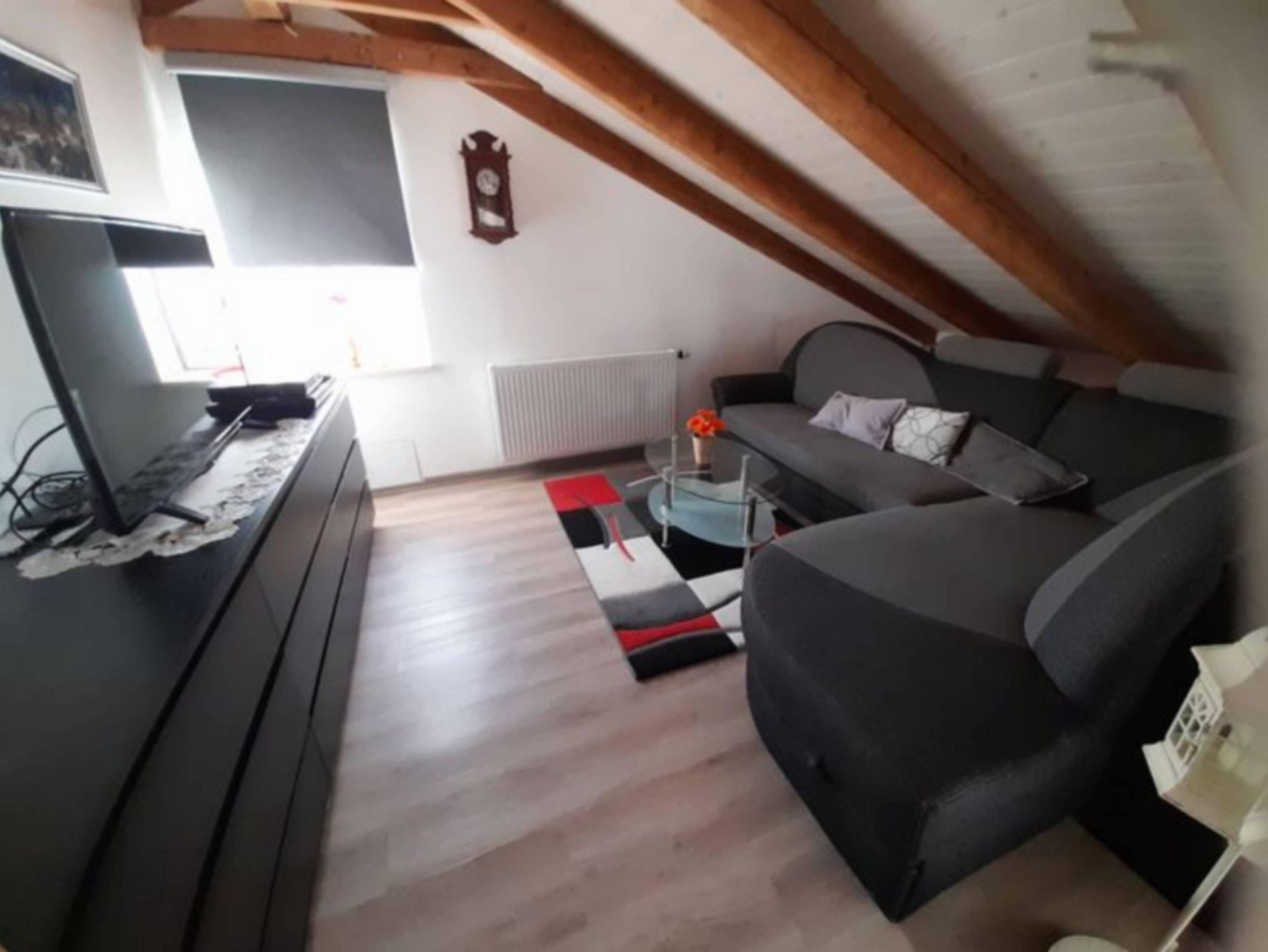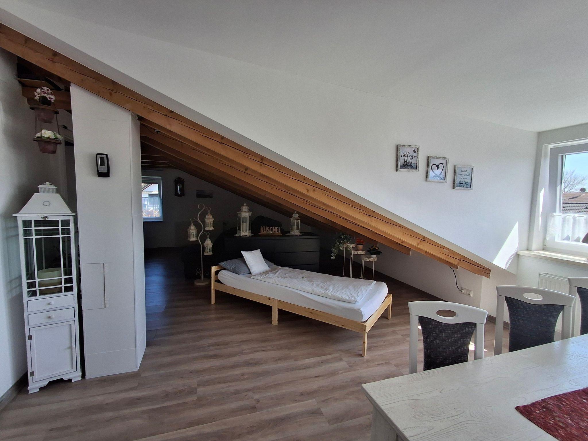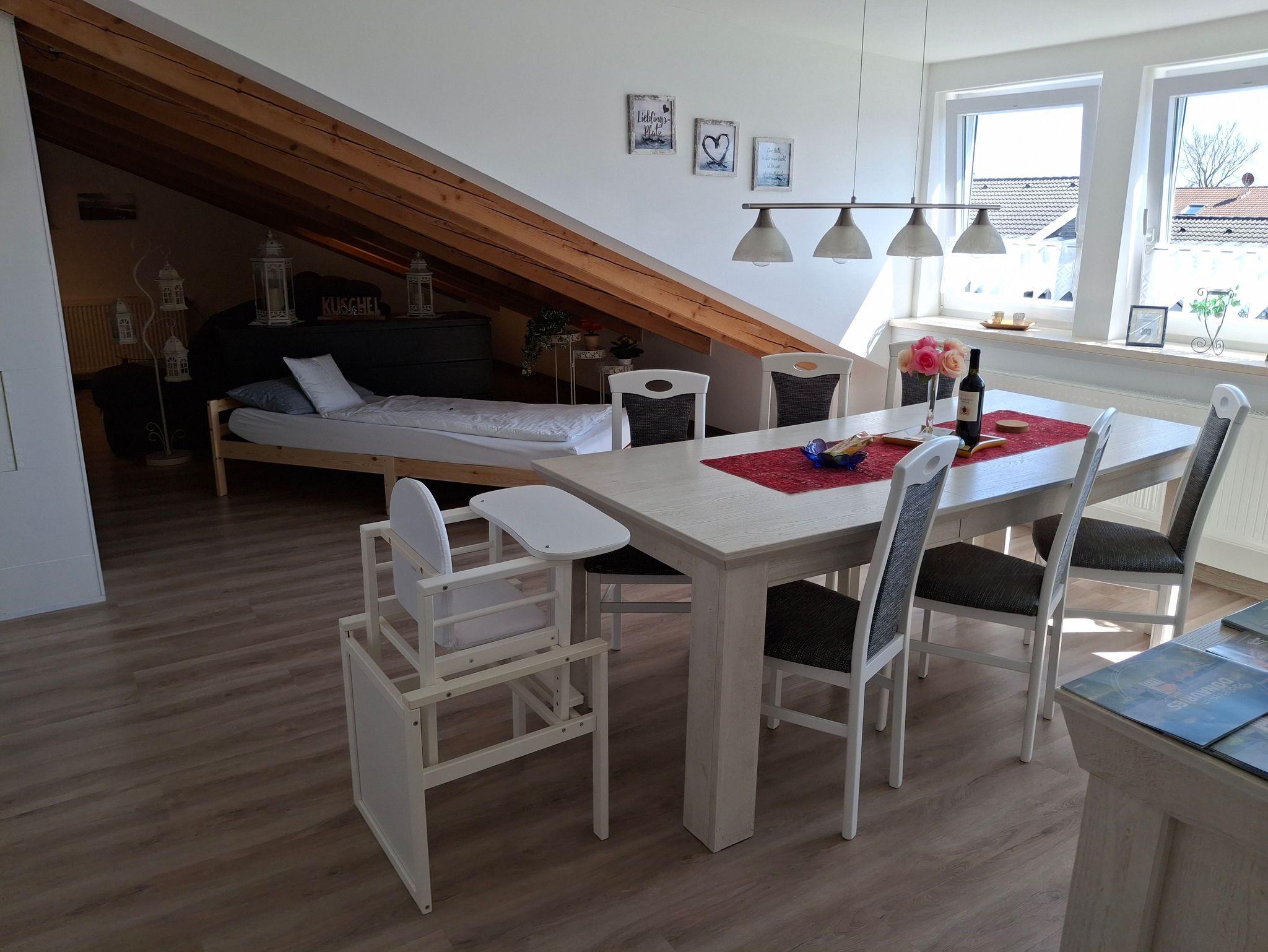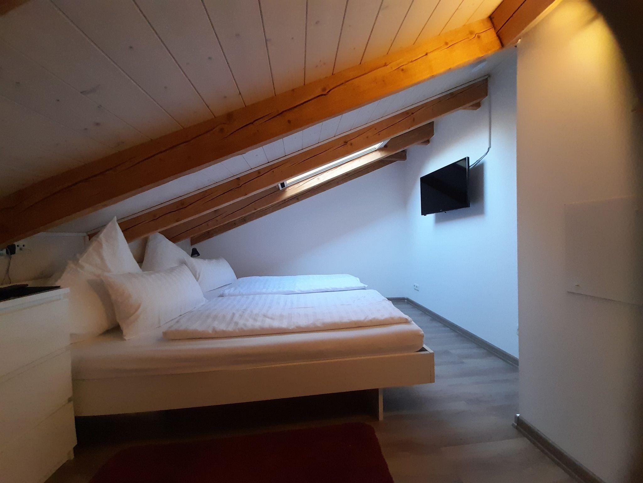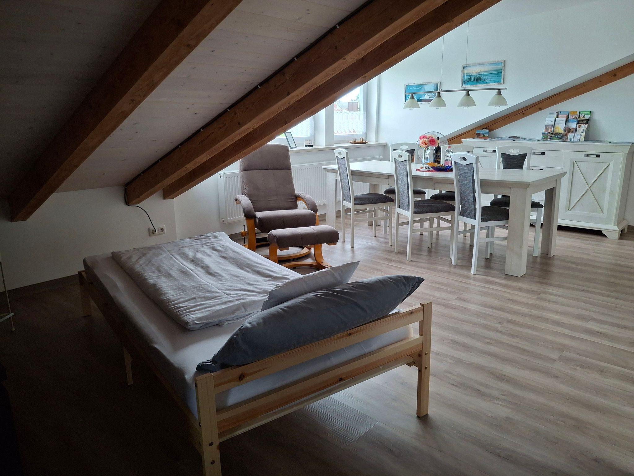 zusätzliches Gästebett 90 x 200 cm), einer voll ausgestatteten Küche, einem Schlafzimmer mit Doppelbett (kann in 2 Einzelbetten umfunktioniert werden), einem Tageslichtbad mit Dusche (80x80x190 cm), WC und einer Waschmaschine. WLAN, 2 TVs und Radio stehen ebenfalls zu ihrer Verfügung. Für Kleinkinder stehen ein Babybett, Hochstuhl und Wickelauflage bereit. Die Wohnung besteht aus Dachschrägen mit einem Sichtdachstuhl und Dachgauben. Die gesamte Wohnung ist mit einem Vinylboden ausgelegt und in jedem Zimmer sind die Fenster mit elektrischen Rollläden ausgestattet.