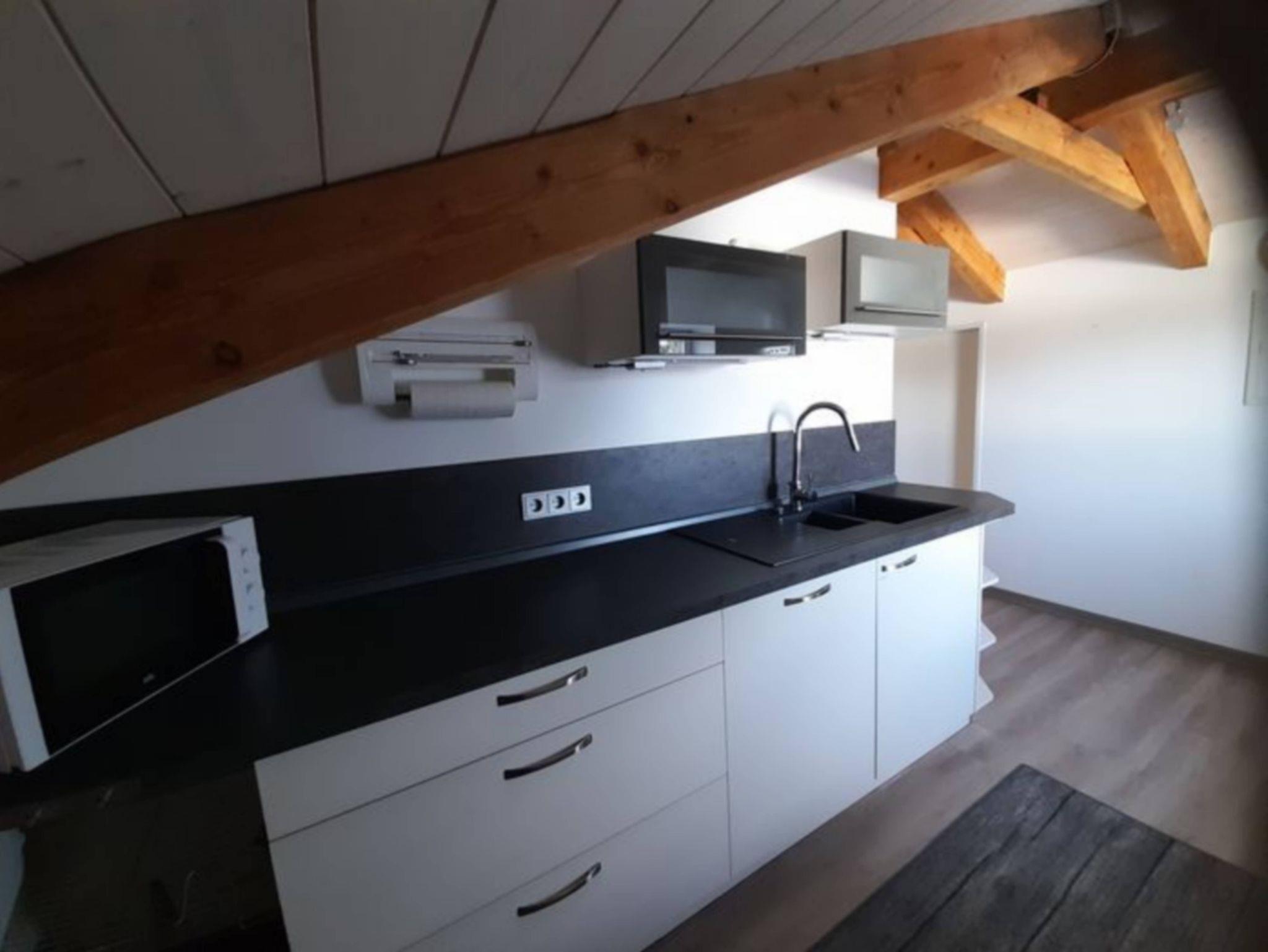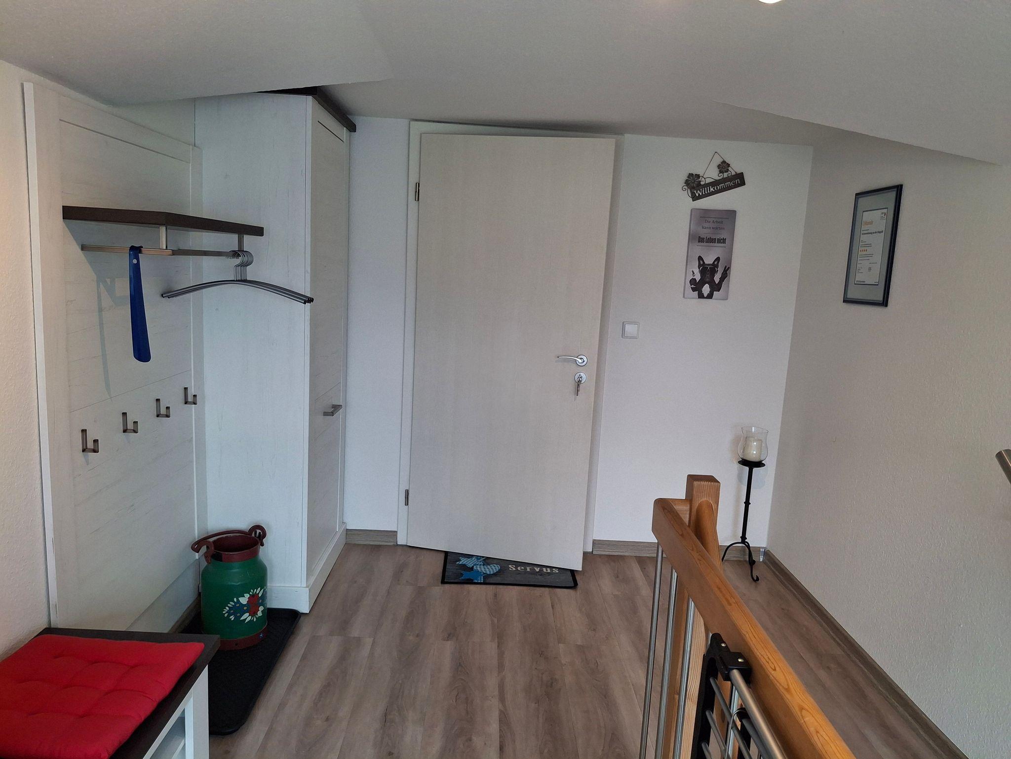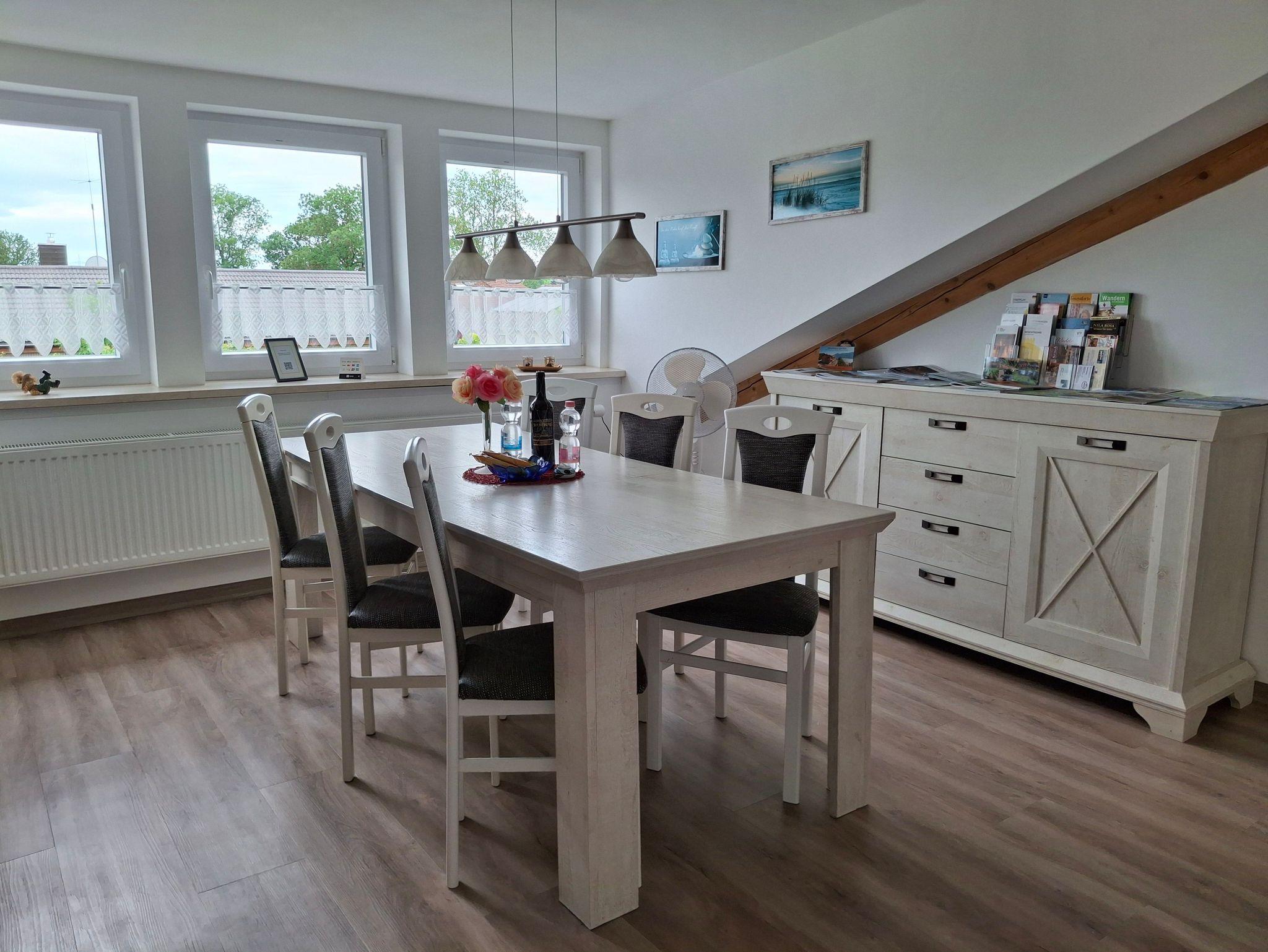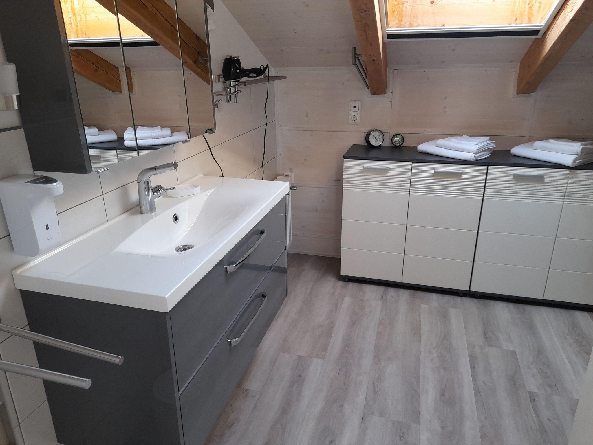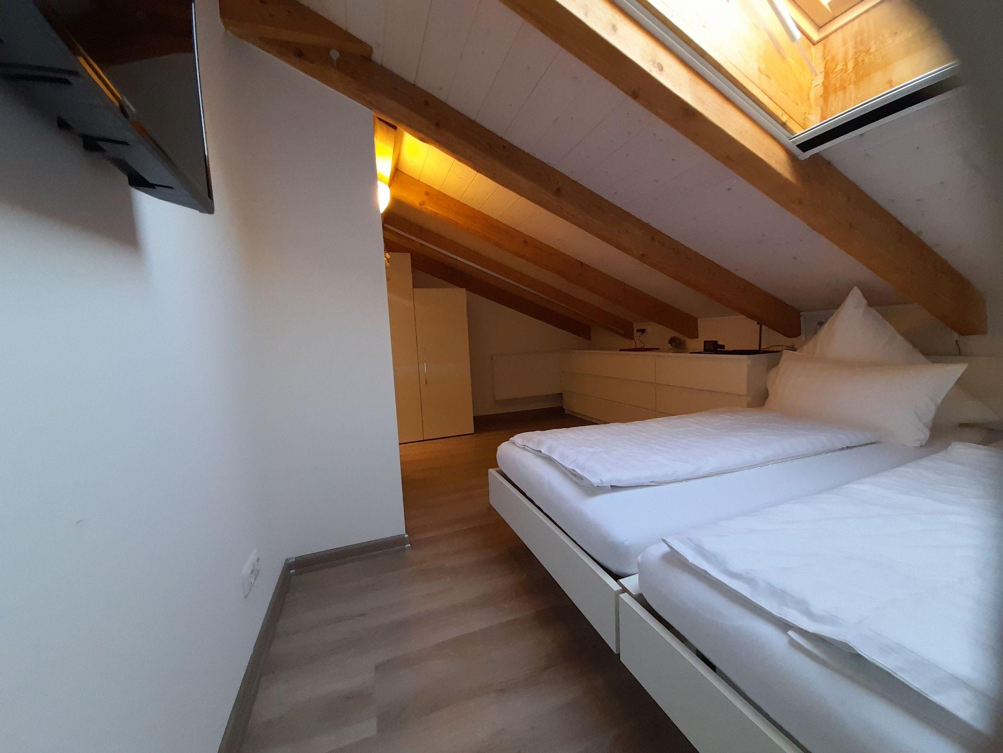 zusätzliches Gästebett 90 x 200 cm), einer voll ausgestatteten Küche, einem Schlafzimmer mit Doppelbett (kann in 2 Einzelbetten umfunktioniert werden), einem Tageslichtbad mit Dusche (80x80x190 cm), WC und einer Waschmaschine. WLAN, 2 TVs und Radio stehen ebenfalls zu ihrer Verfügung. Für Kleinkinder stehen ein Babybett, Hochstuhl und Wickelauflage bereit. Die Wohnung besteht aus Dachschrägen mit einem Sichtdachstuhl und Dachgauben. Die gesamte Wohnung ist mit einem Vinylboden ausgelegt und in jedem Zimmer sind die Fenster mit elektrischen Rollläden ausgestattet.