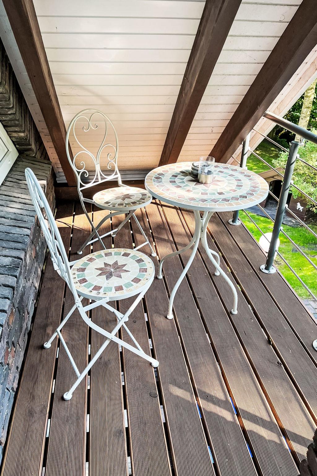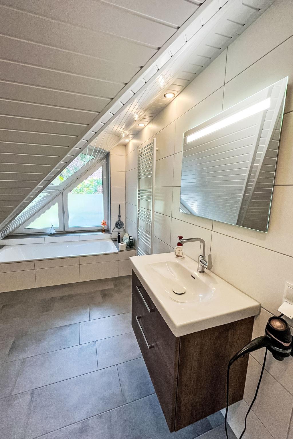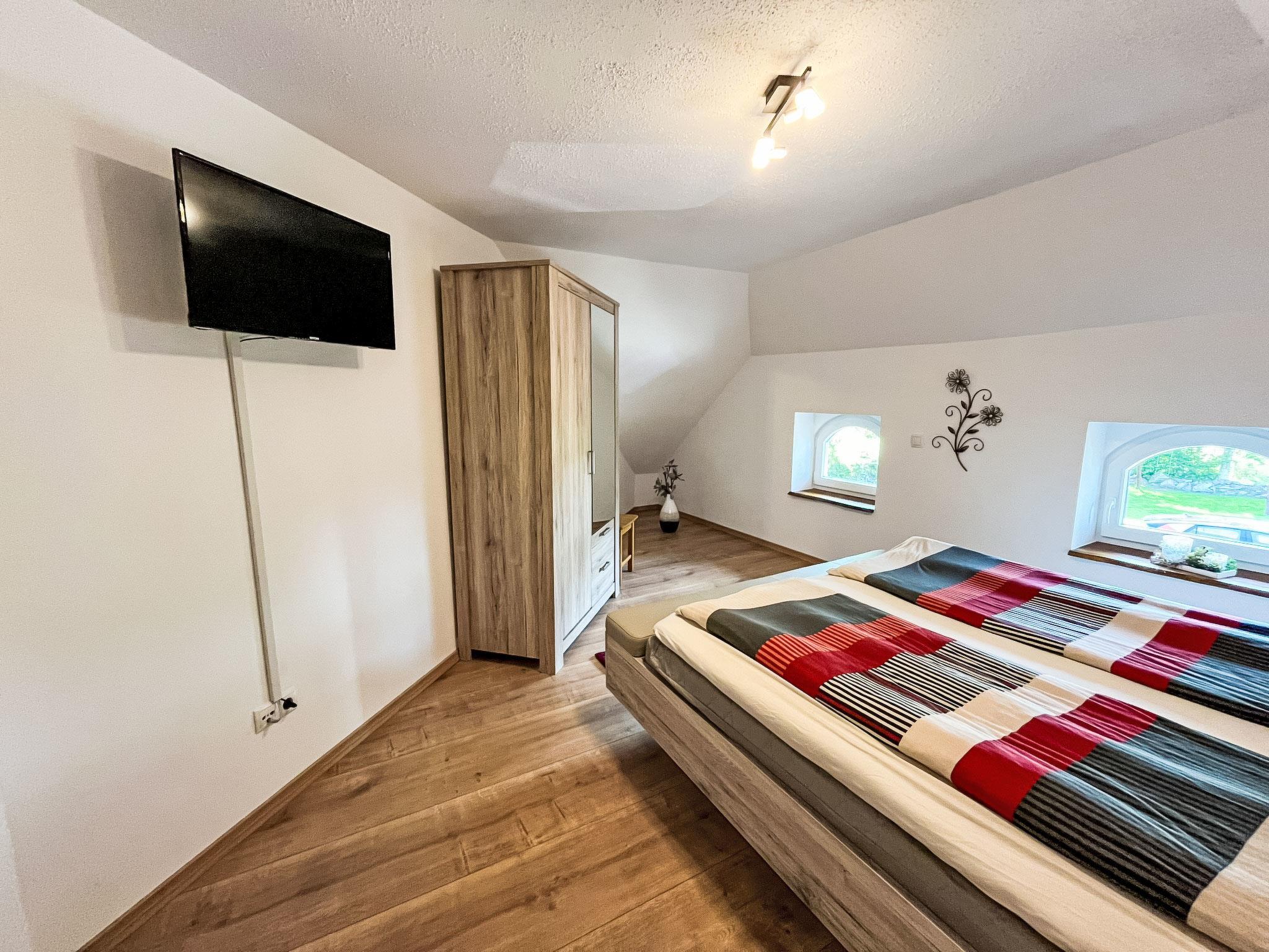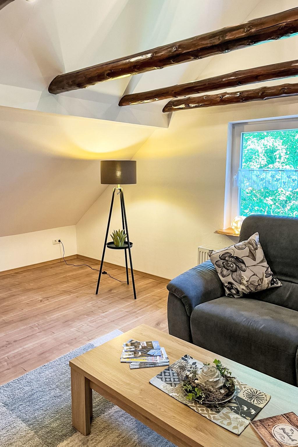 "Ferienhuus up Hütten", 2-room apartment 110 m2, on the top floor. Partly with sloping ceilings, renovated in 2025, tasteful and cosy furnishings: living room with satellite TV (flat screen). 1 room with 1 double bed (2 x 90 cm, length 200 cm), satellite TV (flat screen). Open kitchen (oven, dishwasher, 4 ceramic glass hob hotplates, toaster, kettle, microwave, electric coffee machine) with dining table. Exit to the balcony. Bath/shower/WC. Small balcony, terrace. Terrace furniture, balcony furniture. Facilities: mosquito net, children's high chair, baby cot (extra), hair dryer. Internet (WiFi, free). Parking at the house. Please note: non-smokers only. Private entrance, smoke alarm.