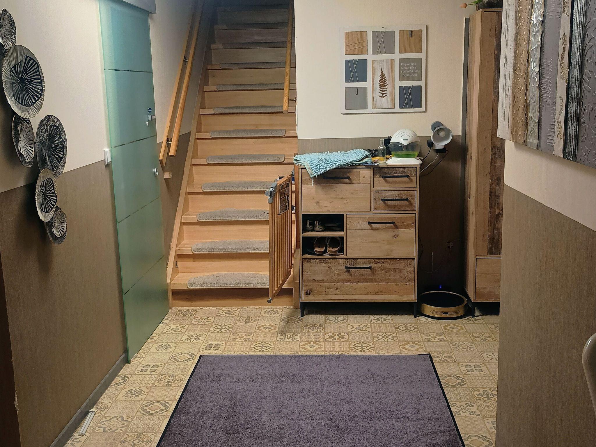 Die FeWo ist ca. 95qm groß und funktionell eingerichtet. Haustiere, vor allem Hunde, sind herzlich Wllkommen. Die komplett ausgestattete Küche geht nahtlos in das Esszimmer mit 2,80 m Esstisch und dann offen in das Wohnzimmer über. Von dort geht es durch den ehemaligen HWR in das Schlafzimmer mit Doppelbett. Gegenüber dem Schlafzimmer befindet sich ein neues Bad. Von dort gelangt man wieder in den Flur im Eingangsbereich. Ein weiteres Schlafzimmer wäre im 1. OG - müsste aber extra gebucht werden. Große, neuwertig ausgestattete Ferienwohnung mit 2 Terrassen und gr.eingezäunten Garten mit Felder im Anschluss