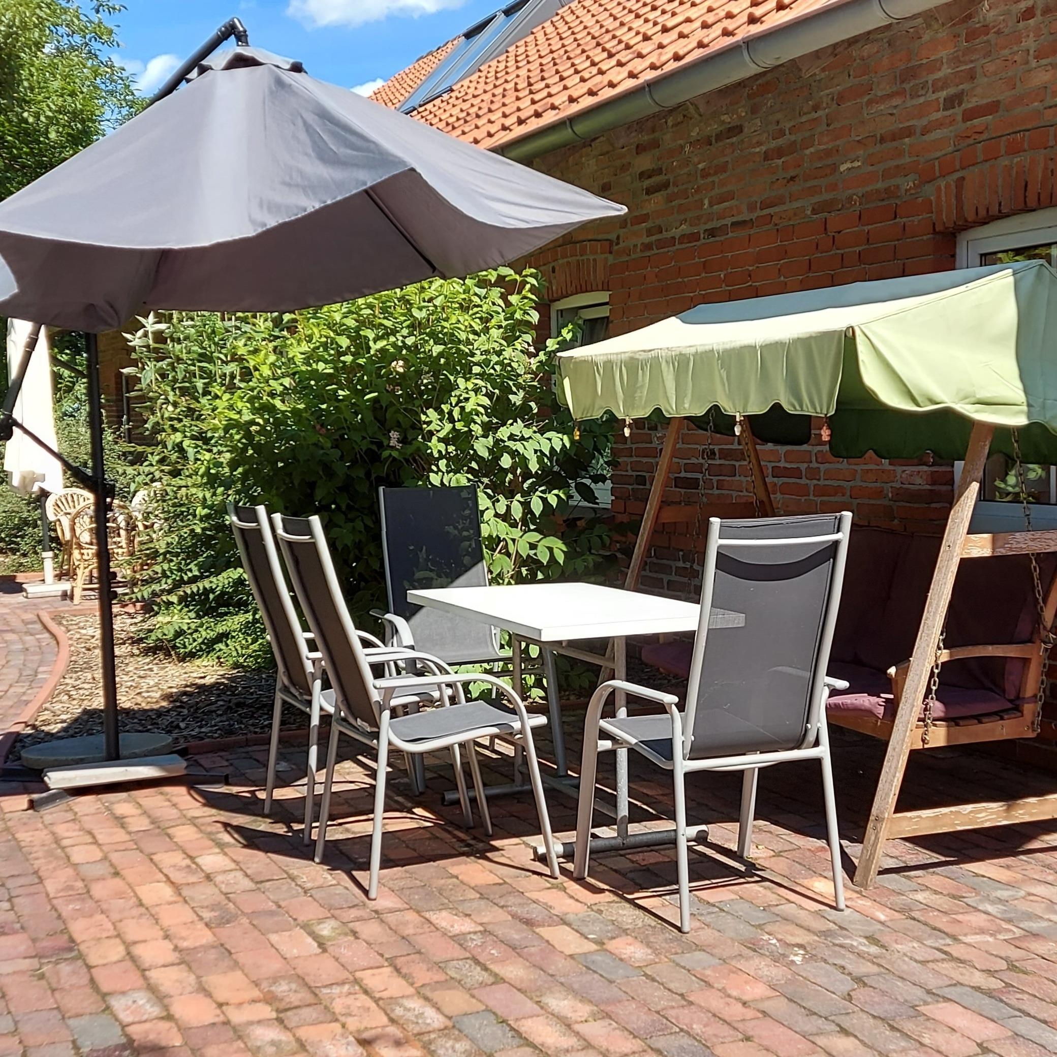 Im Außenbereich gibt es einen großen Garten, ganz viele Tiere: Schafe, Ziegen, Ponys, Esel, Hühner, Kaninchen und Katzen, einen Spielbereich mit Rutsche, Schaukel und Trampolin und eine Terrasse, die zum gemütlichen und angenehmen Ausklingen des Tages einlädt. Außerdem steht Ihnen hier ein Parkplatz zur Verfügung.