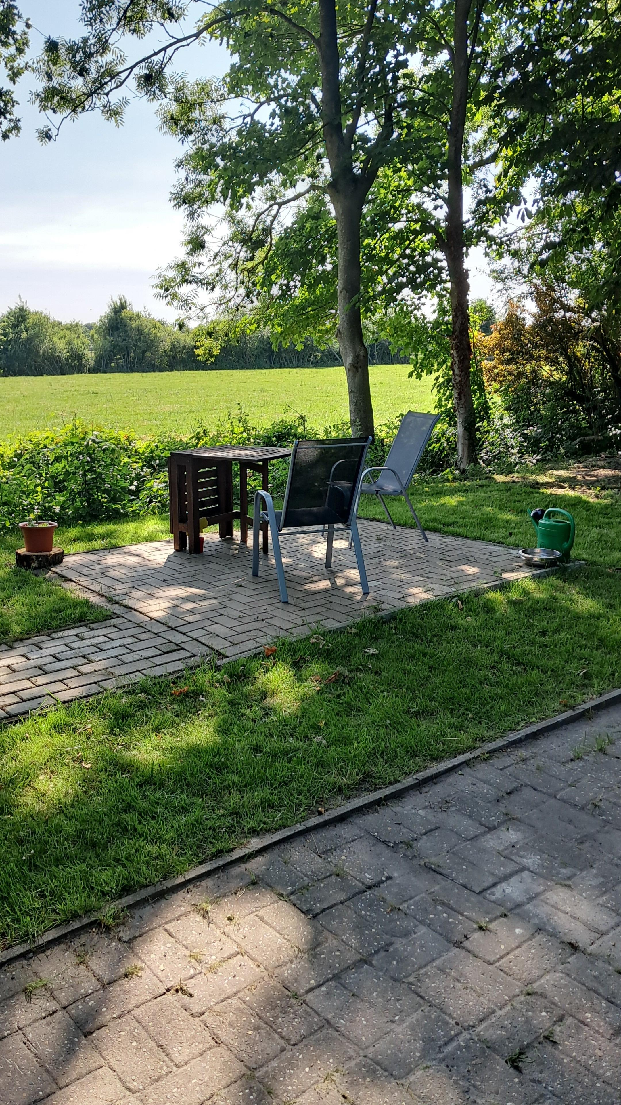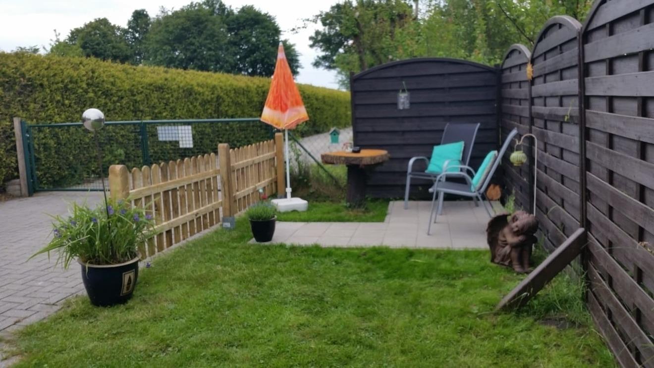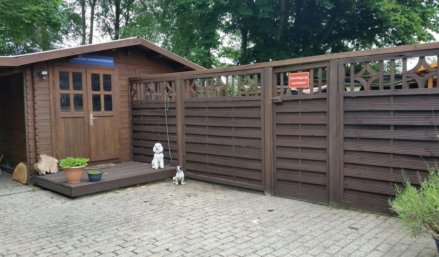 Im hinteren Teil unseres Grundstückes liegt unsere Hundetagesstätte/Pension. Es befindet sich zusätzlich ein seperater Garten mit Sitzgelegenheit und grünem Ausblick unter Bäumen für unsere Gäste.