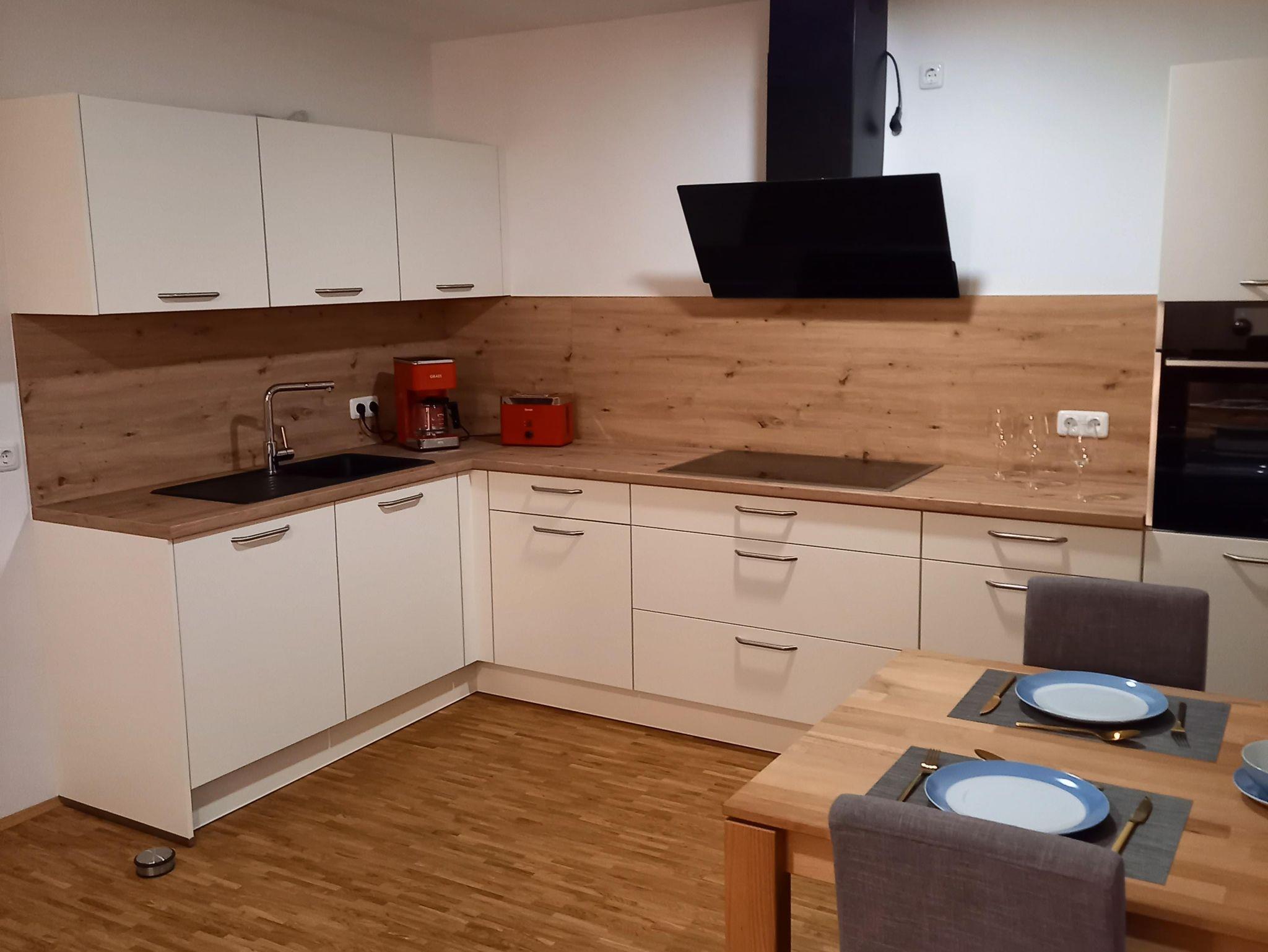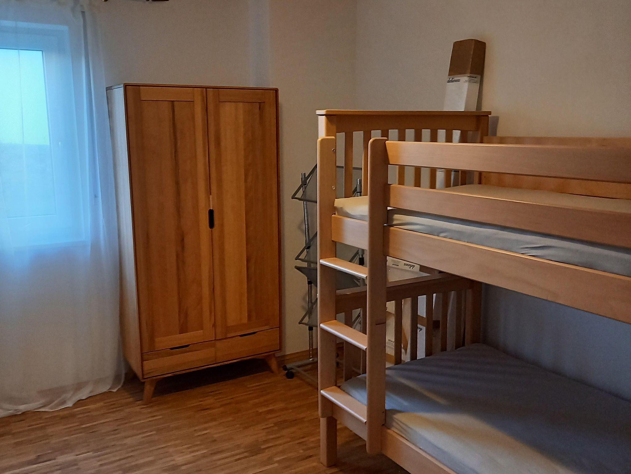 Es gibt zwei Schlafzimmer, eines verfügt über ein Doppelbett mit großem Kleiderschrank, das zweite über ein Etagenbett, Schreibtisch und Kleiderschrank. Die Küche ist voll ausgestattet und verfügt unter anderem über einen Herd mit Backofen, einen Kühlschrank und einen Gefrierschrank, eine Spülmaschine sowie Kaffeeautomat, Mikrowelle, Toaster, Wasserkocher, Eierkocher. Geschirr, Besteck und Pfannen/Töpfe sind vorhanden. Geschirrtücher, Handtücher und Bettwäsche sind im Preis inbegriffen. Eine große sonnige Terrasse mit Fernsicht und Gartennutzung gehören ebenso zu diesem Ensemble. Es handelt sich um eine Nichtraucherwohnung. W-Lan und Parkplatz sind inklusive.